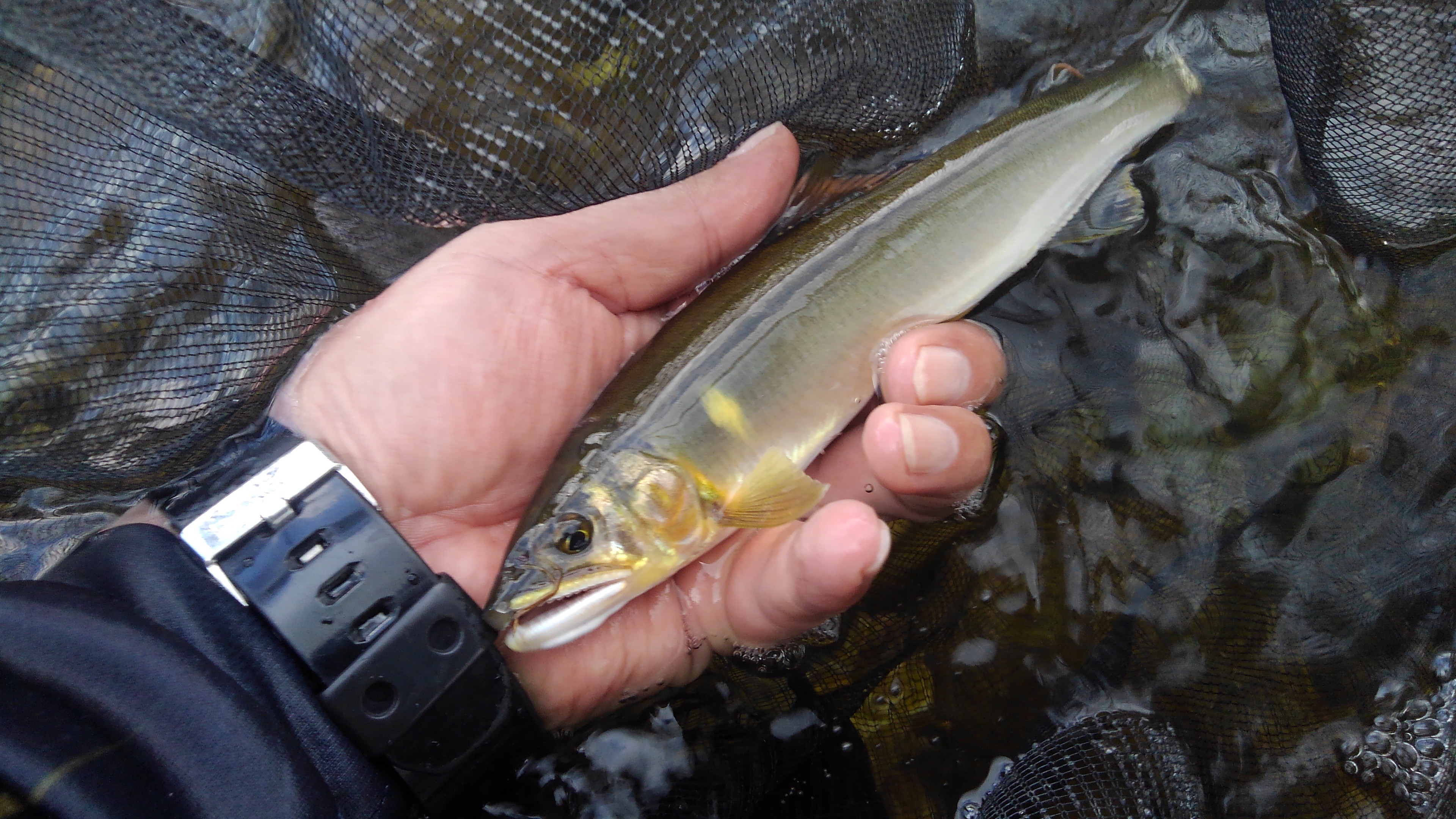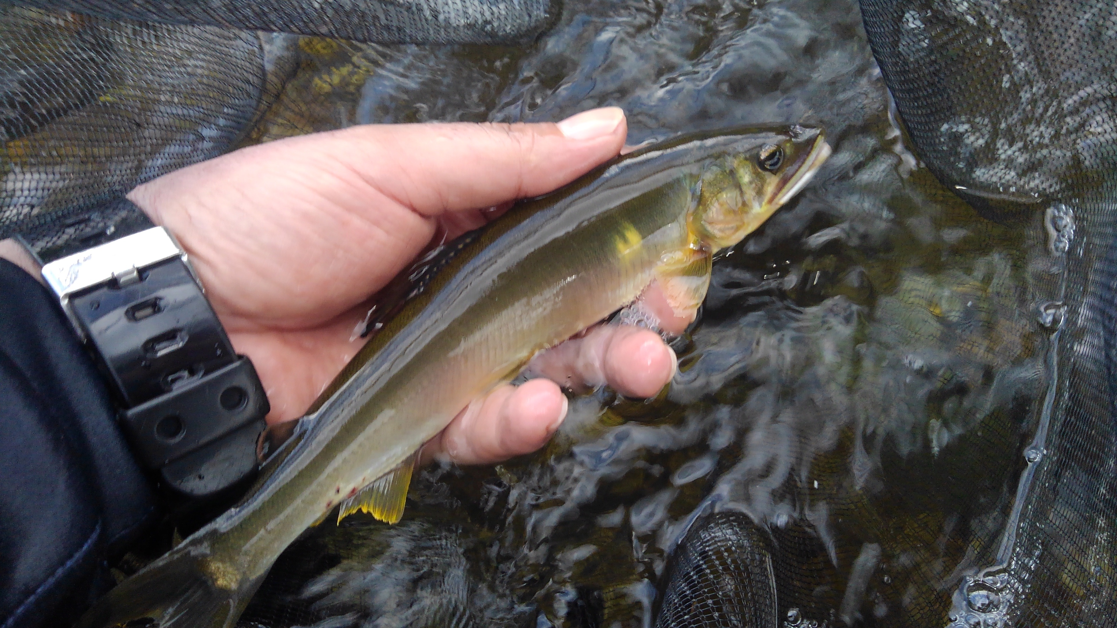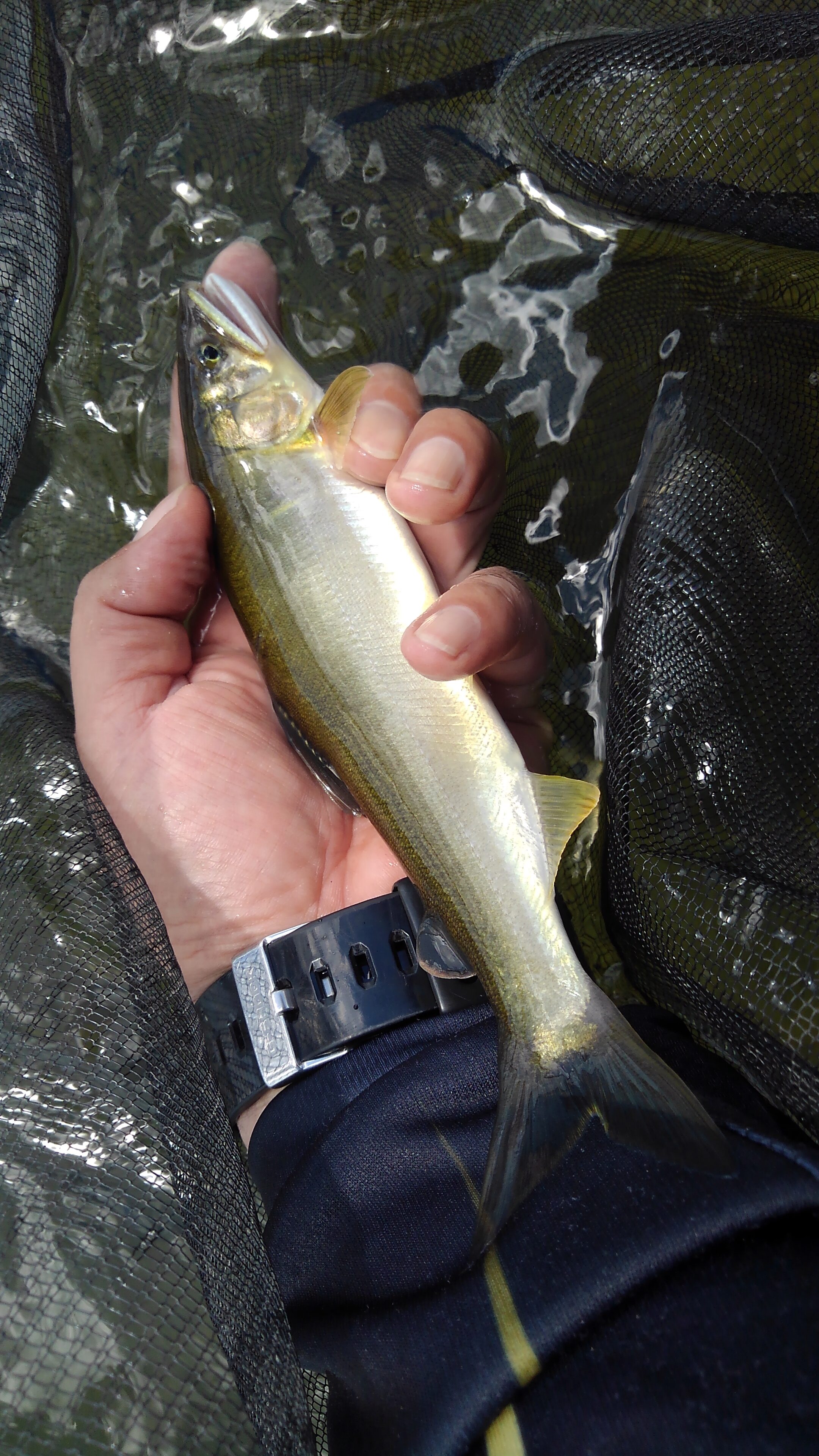 昼休憩後はまた別のポイントへ移動。緩いところで一匹のみ。上の瀬に移動。瀬の中に入れて引いてやるといきなりガツーンと強烈なアタリ!どうにか耐え、22センチ。その後も追加するも時間になり終了。