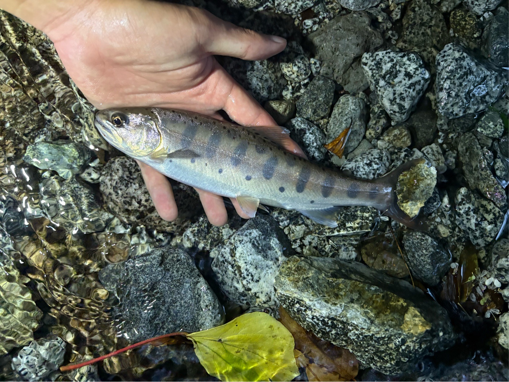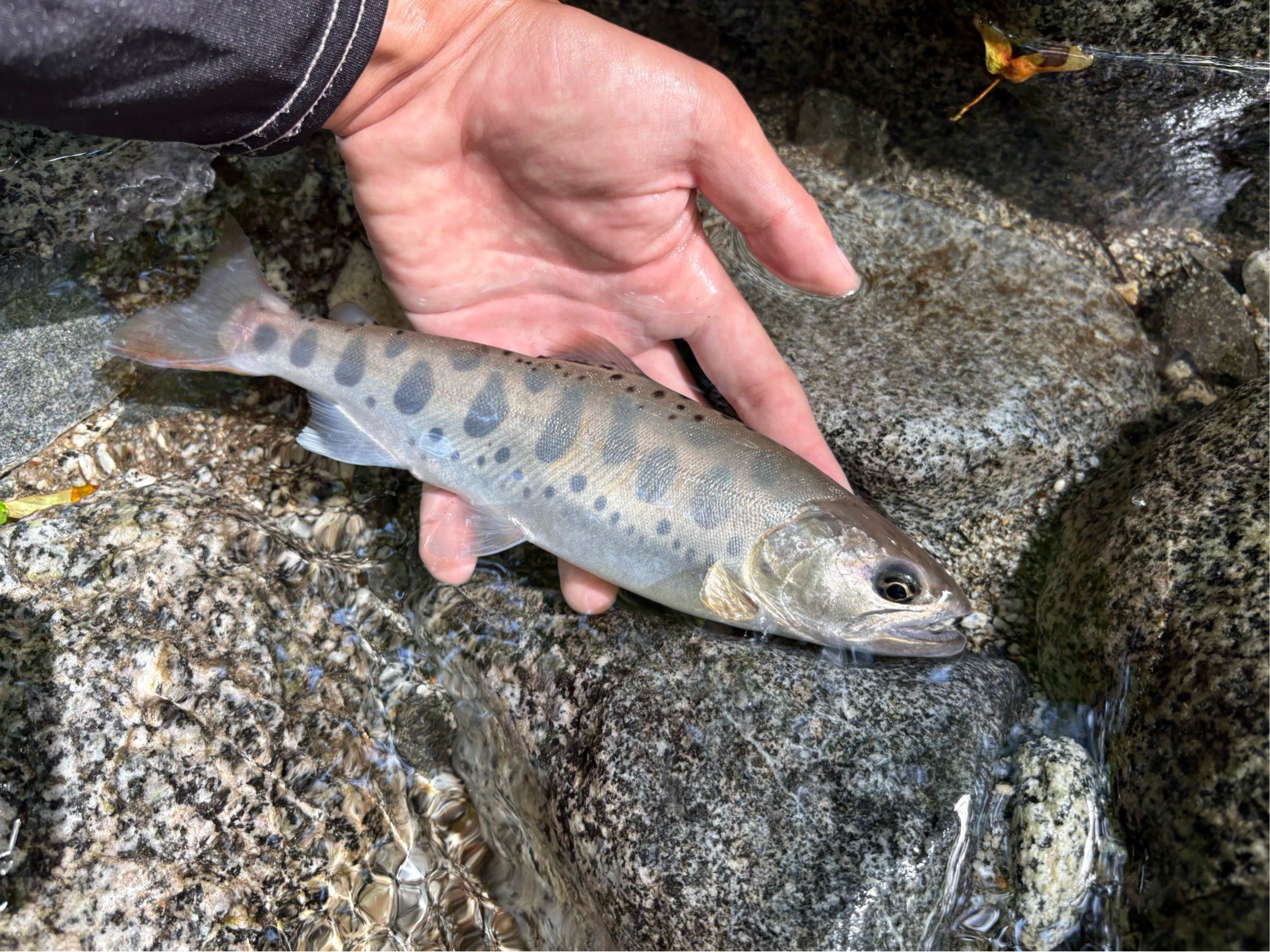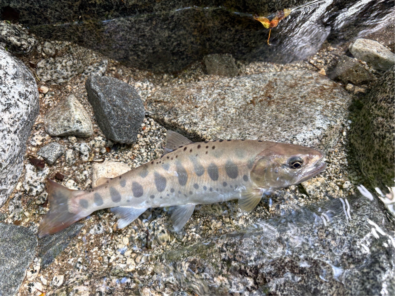 大場所数か所目で1匹目。 23cmのかっこいい顔つきのヤマメが釣れました!