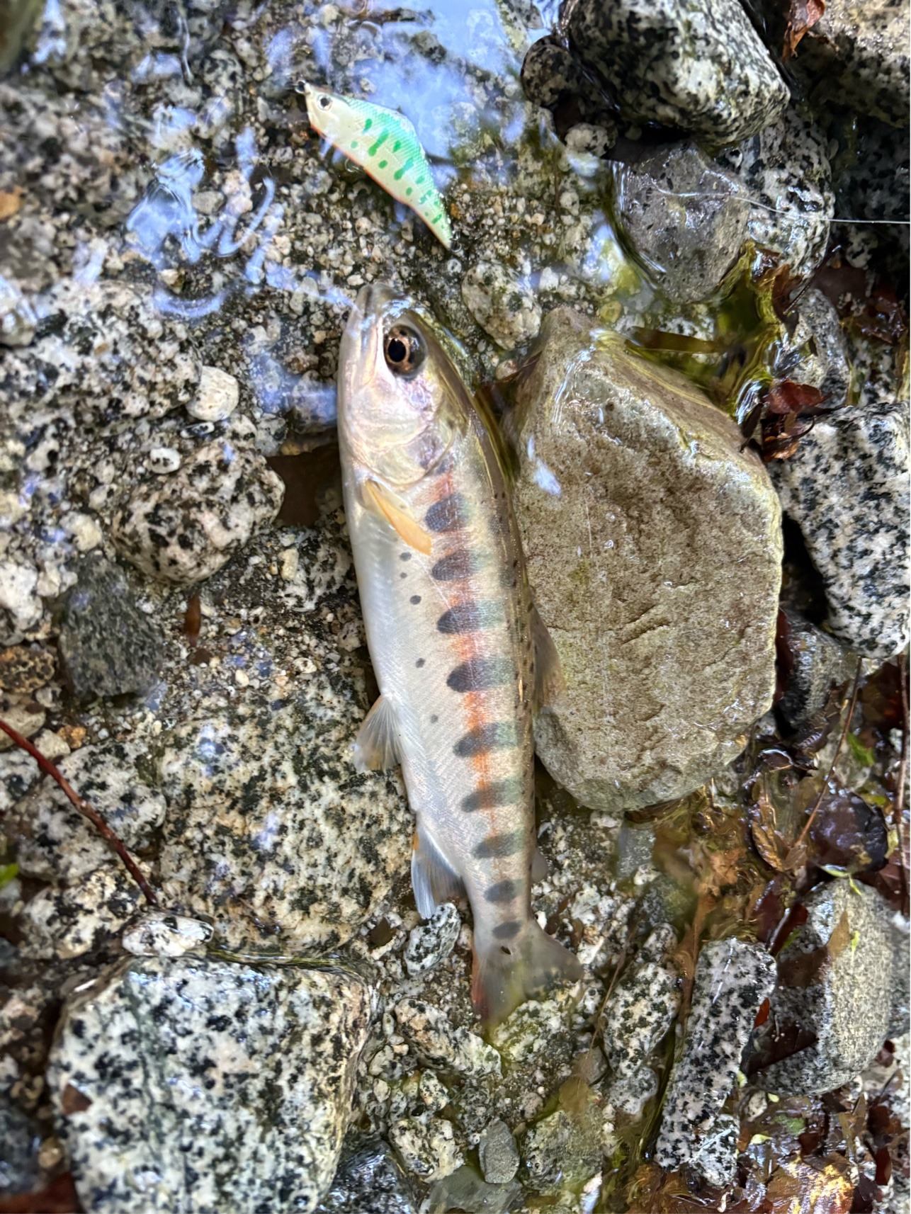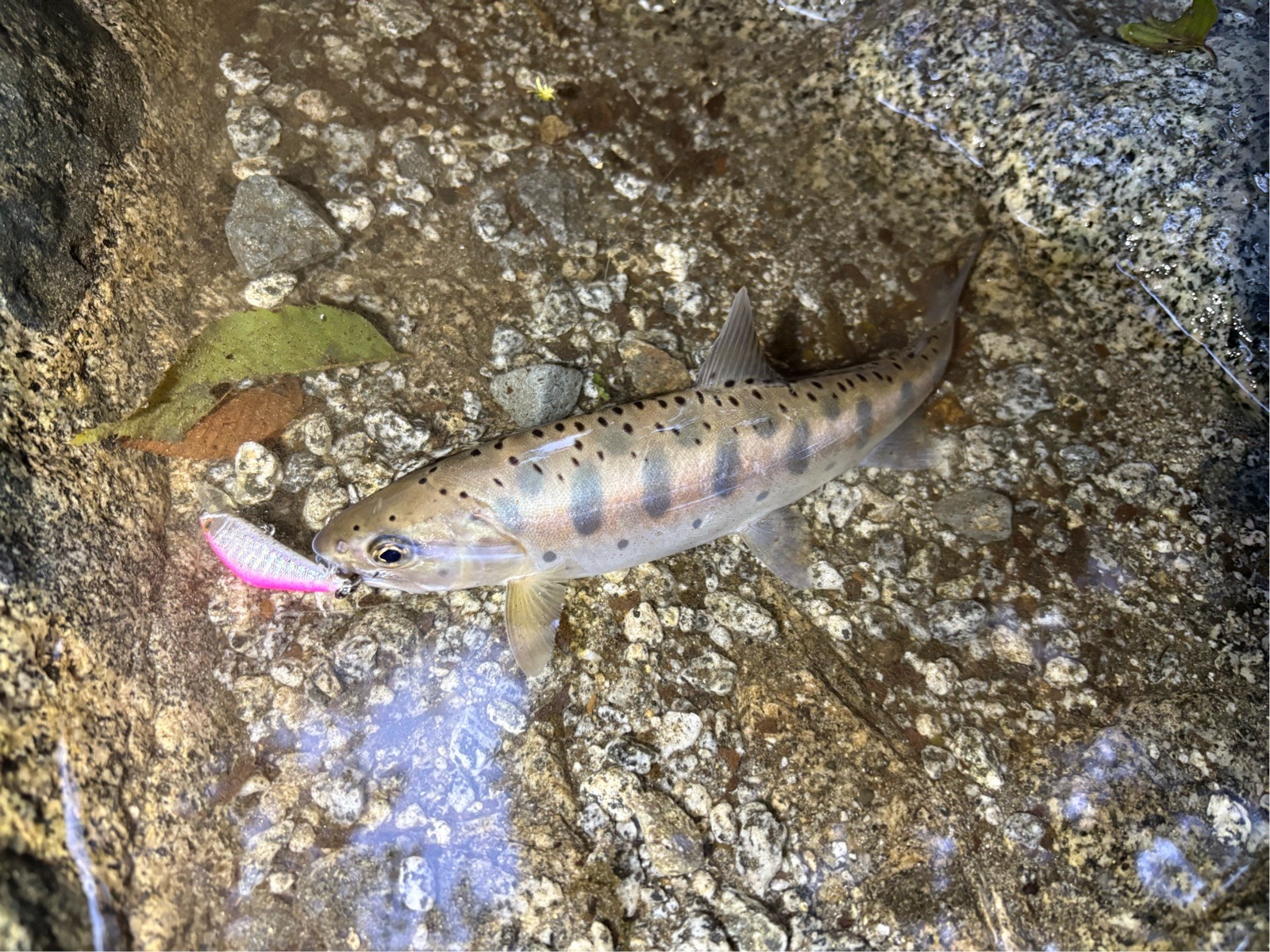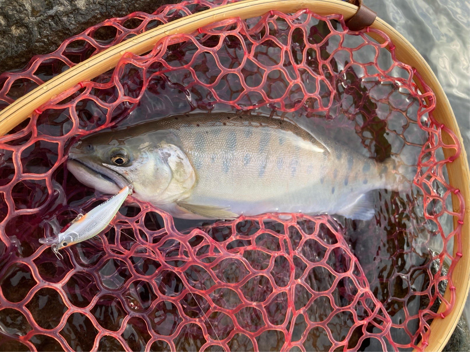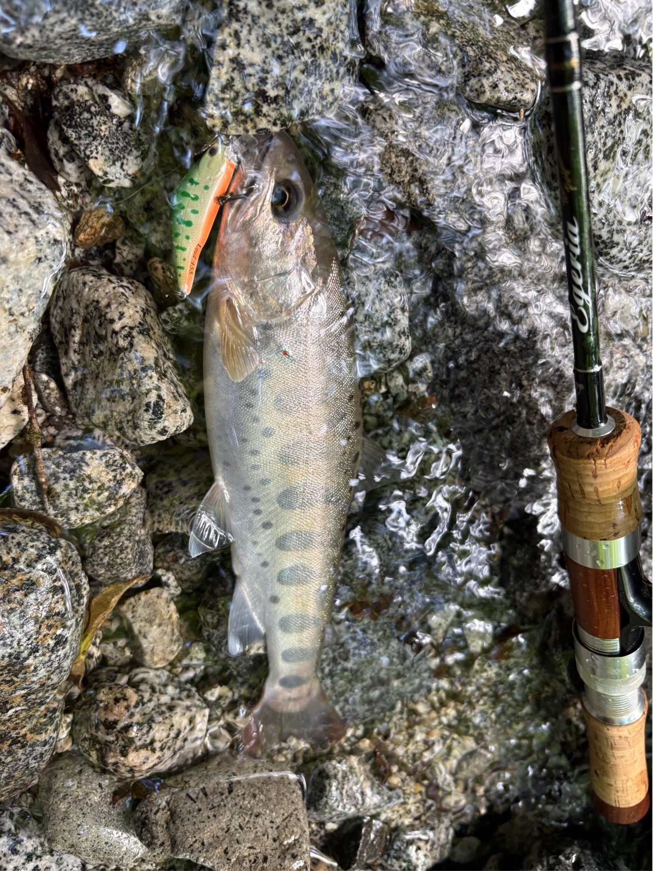 そこから1時間弱チェイスはあまりなく、明らかに魚がいそうな水深があり長く引ける流れのポイントに。 距離をとって岩陰からキャストするとチェイス、数投目でヒットに持ち込めました。