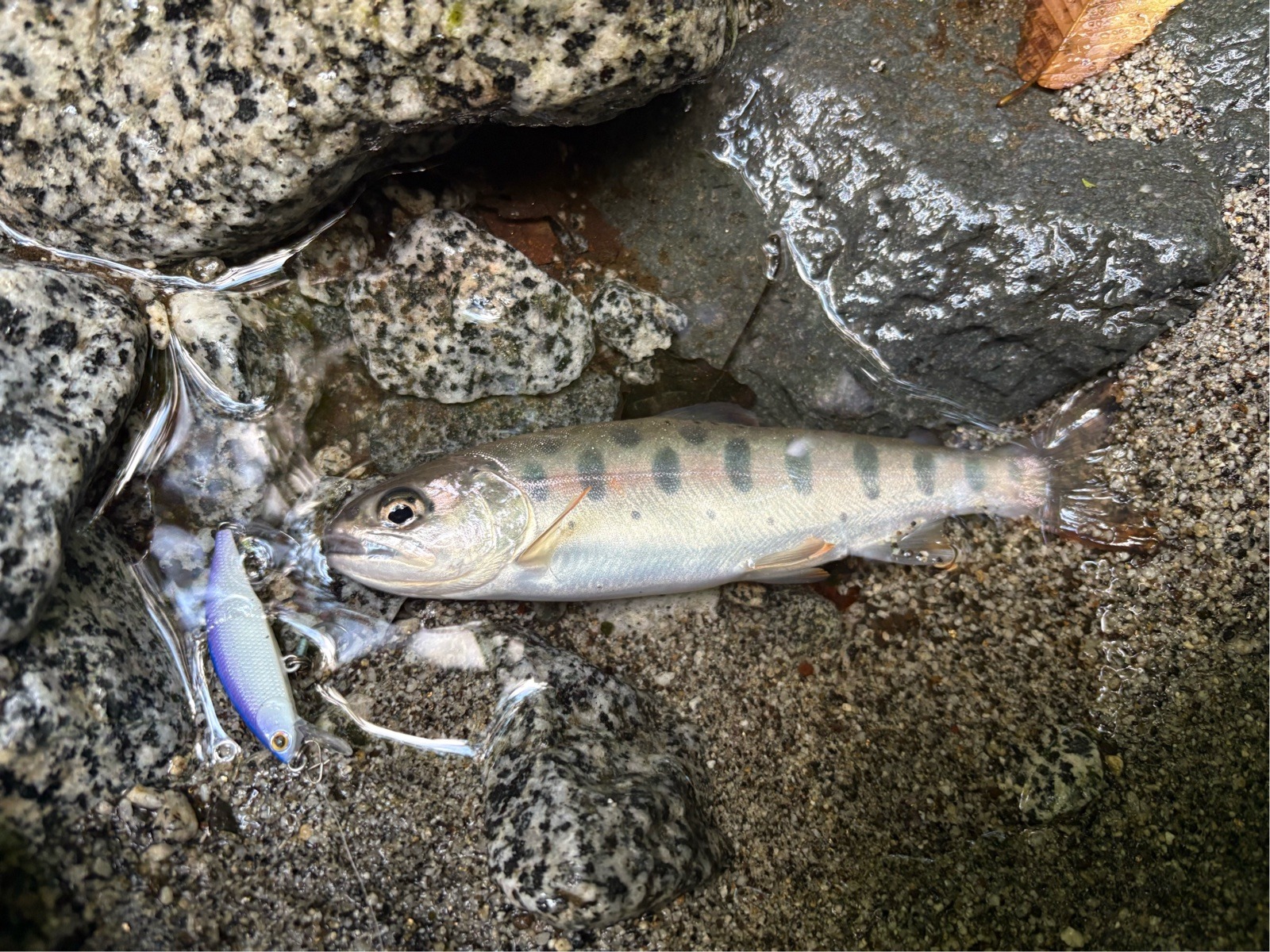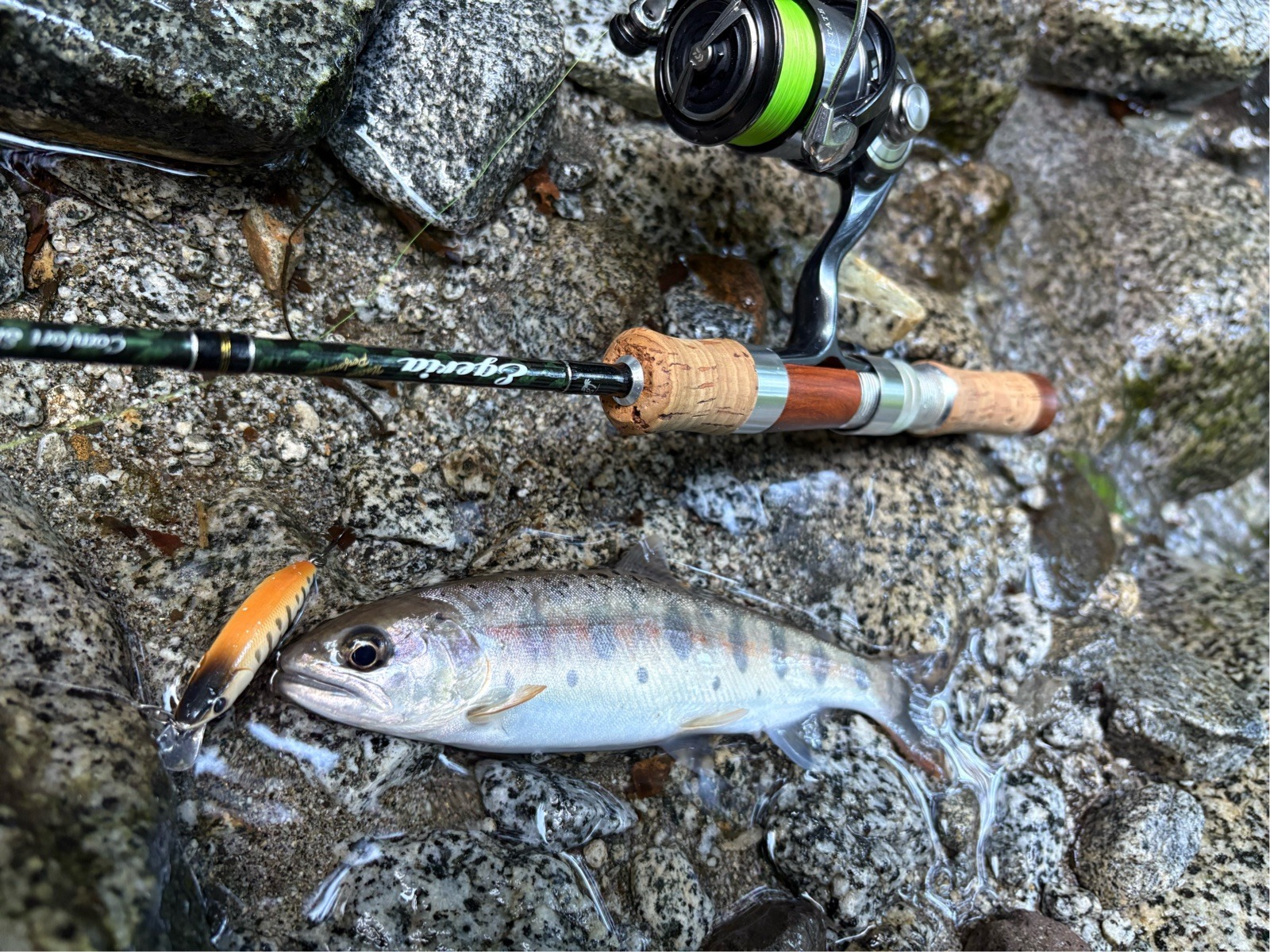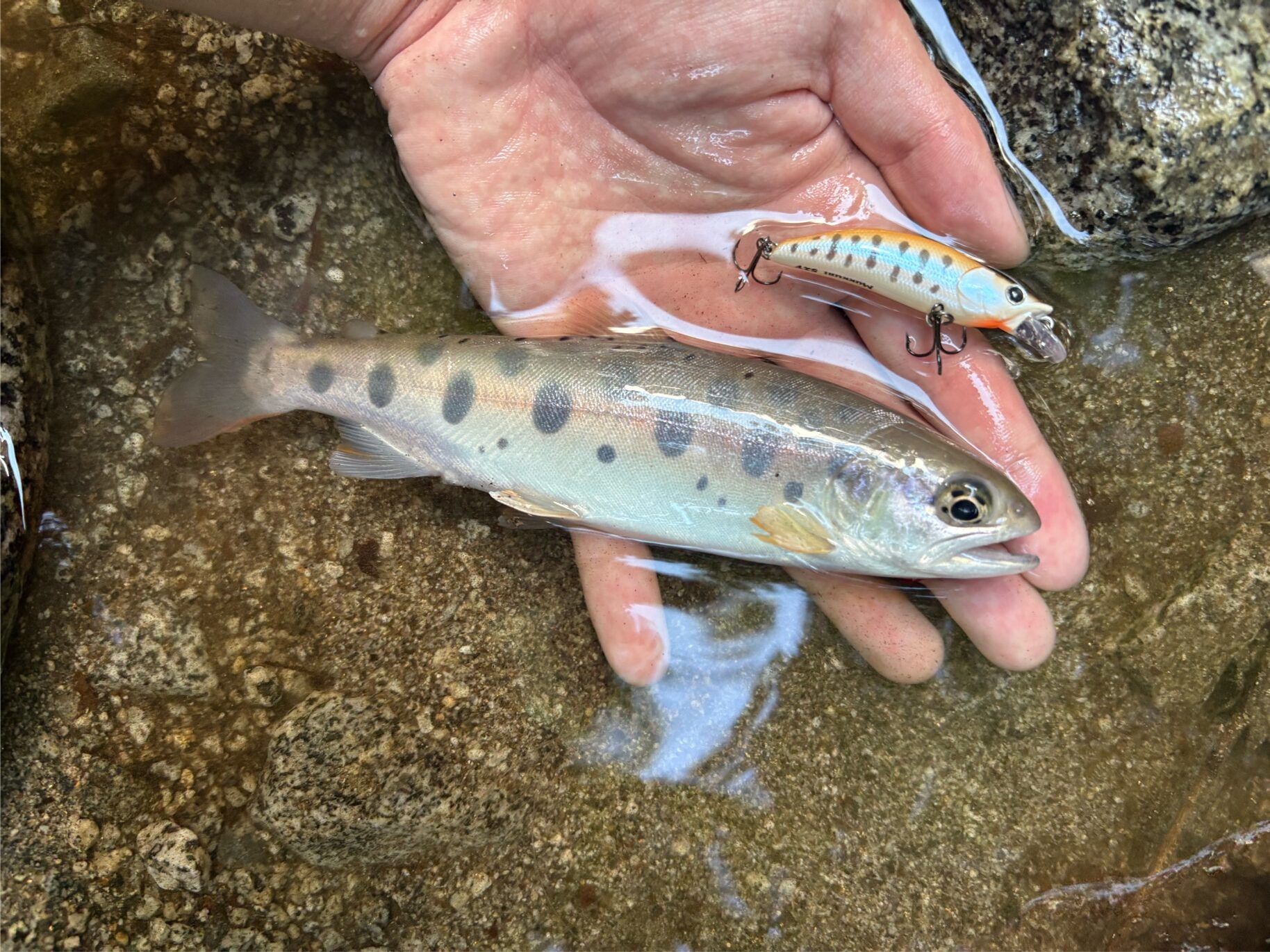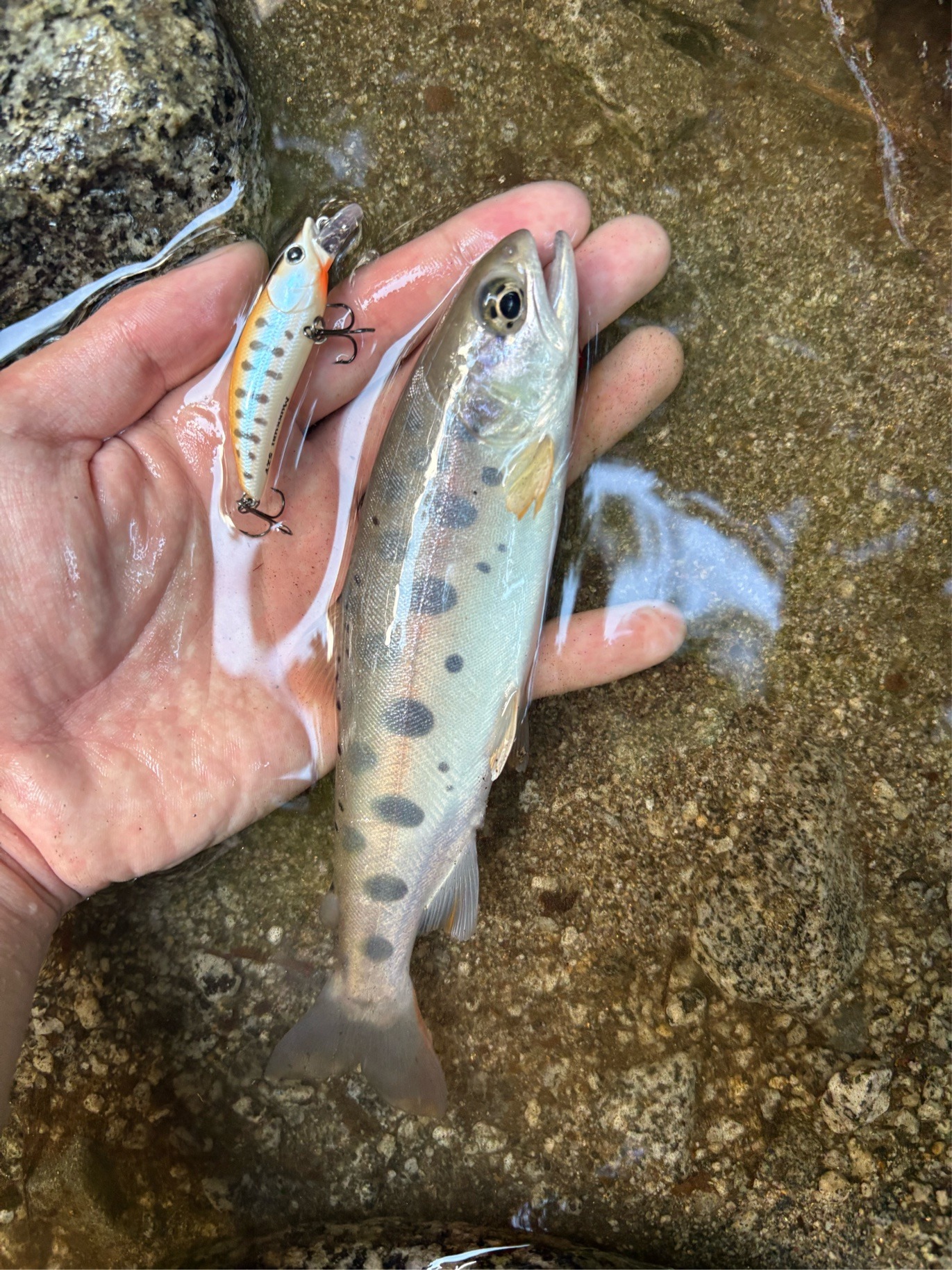 そこから1時間弱チェイスはあまりなく、明らかに魚がいそうな水深があり長く引ける流れのポイントに。 距離をとって岩陰からキャストするとチェイス、数投目でヒットに持ち込めました。