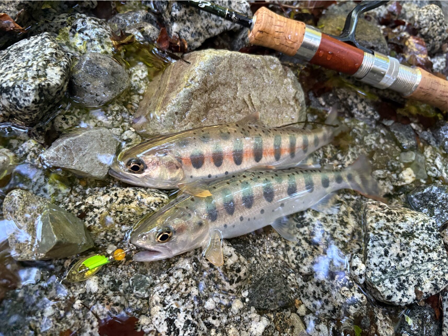 入渓点近くの、行きには魚影が確認できなかった有望ポイントで今日一サイズの24cmをキャッチできたところで竿を仕舞いました。