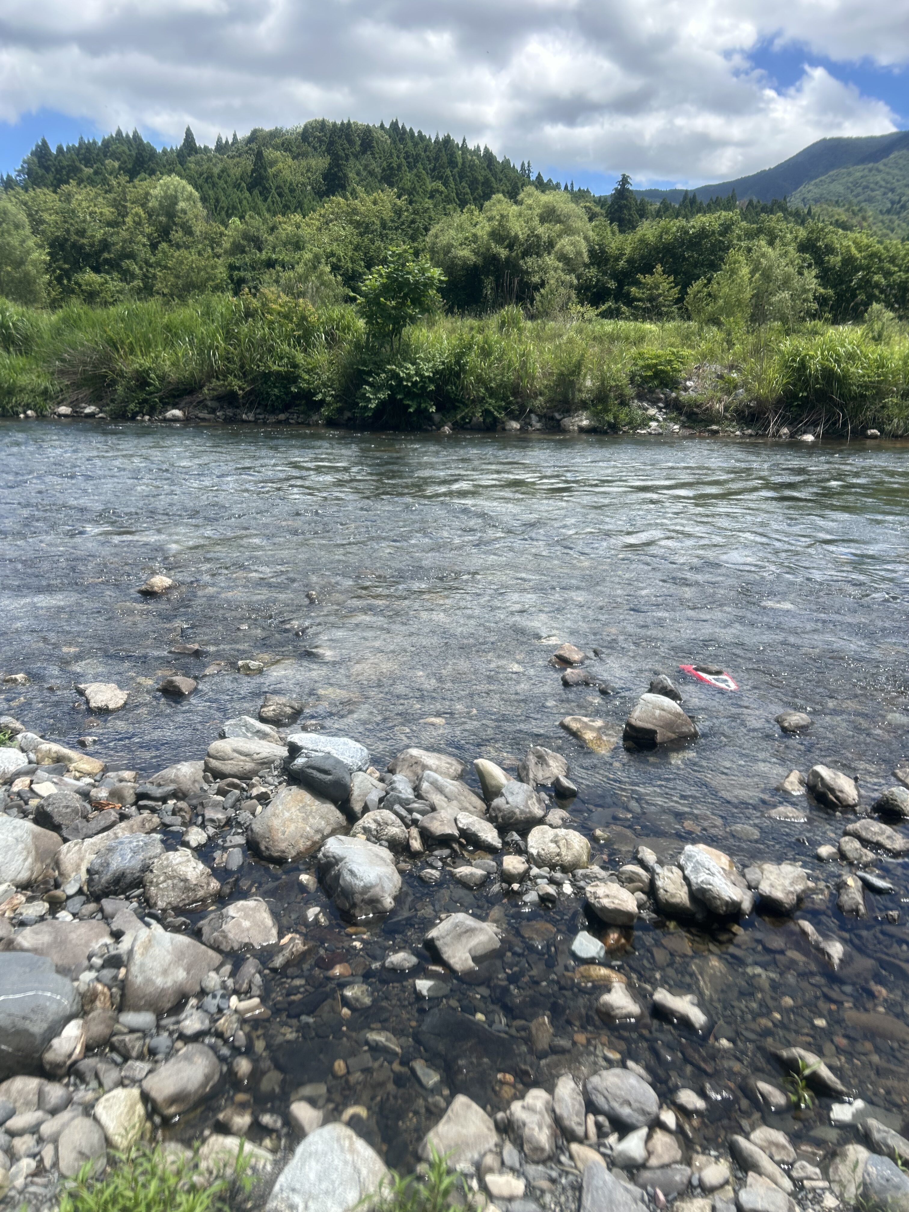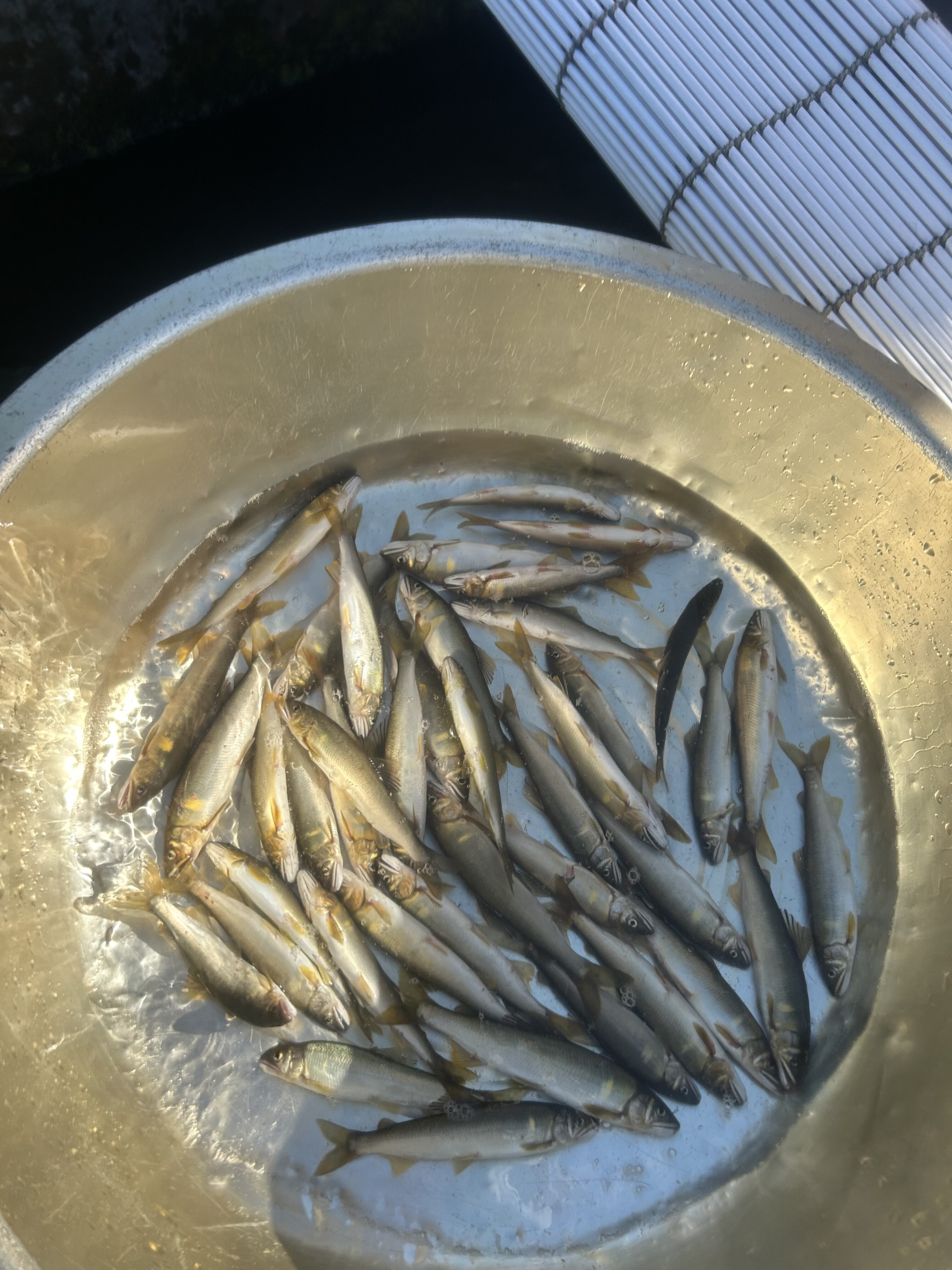 朝6時半着替えを済ませて川へ行ったら既に人が竿一本間隔で立ってます。まじかー。流石やなぁ。下へ降っていきます。いつものお気に入りスポットへ。ここで竿をだします。さぁ行ってこい!とオトリを送り込み、早速のアタリが!バレた!、もう一回送り込んで、またバレた!3本イカリがダメだったのか、掛かりが悪かったです。4本イカリのスピードに替え送り込むとすぐにヒット!オトリが入れ替わりここから湖産の爆裂な当たりを楽しみました。ちょっと石の綺麗なところに入れて、10秒くらい数えたらバチッとあたってギューーンと走ります。これが楽しい。100匹には遠く及びませんでしたが、40匹くらいは取れました。バラシが悔やまれますが、また行きたいとおもいます。