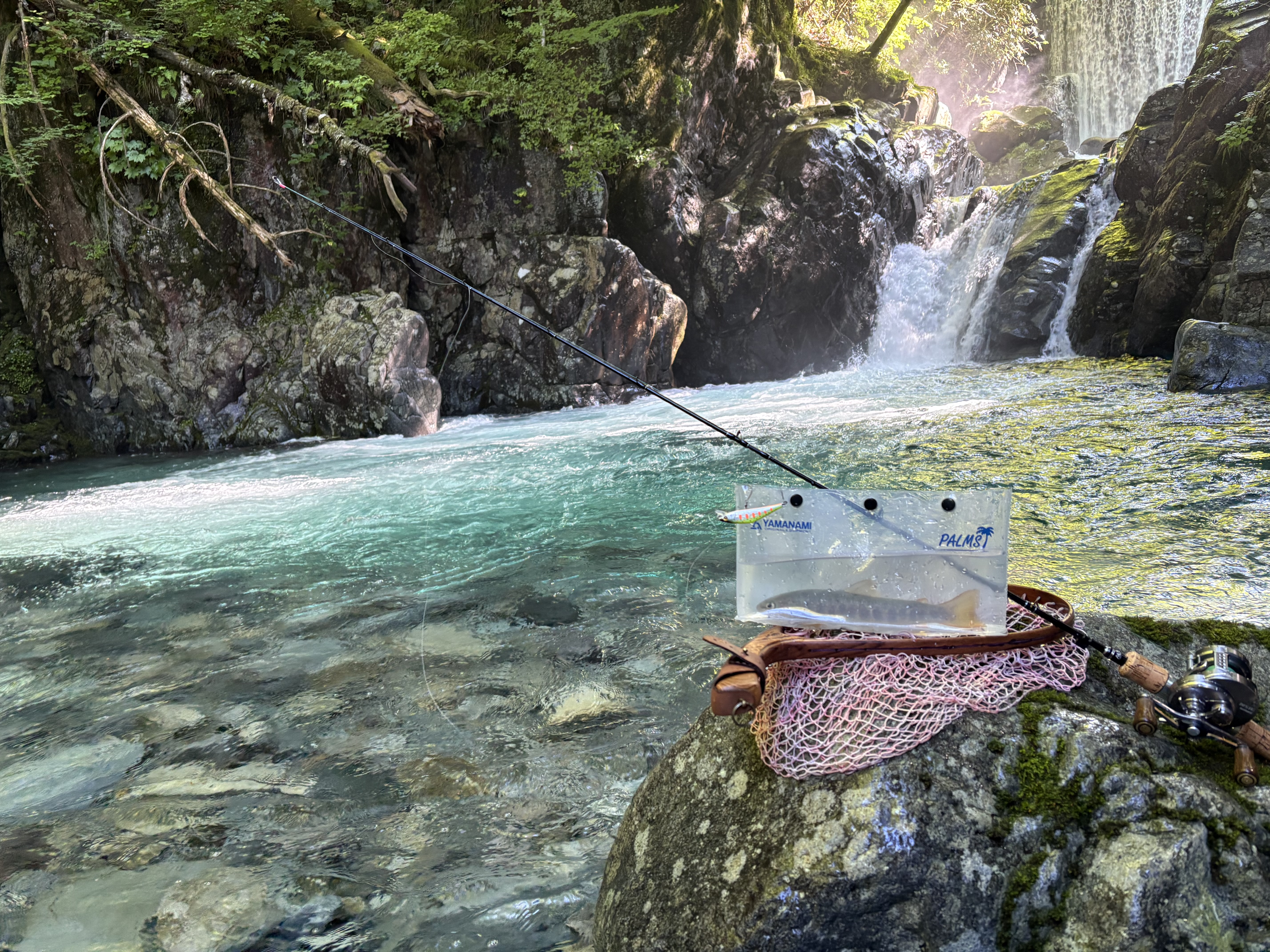 最終ポイントの大きな滝壺。大イワナ狙いで普段渓流であまり使わないスミス:Dコンタクト62。諦めかけていたところ、対岸からの誘いでヒット!