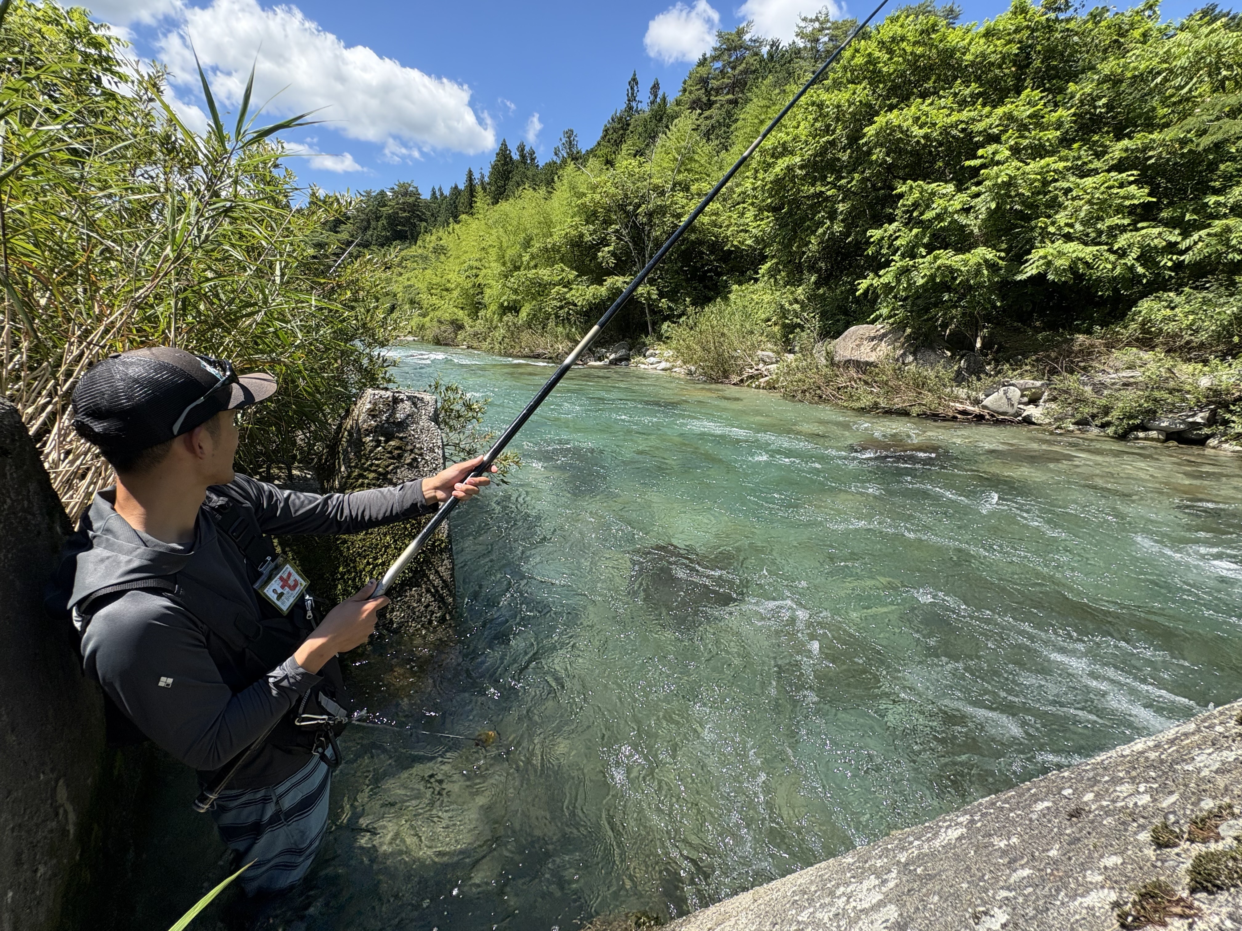 見るだけ予定が結局釣りたくなって、日券購入し1本の竿を交代で釣り、ようやく待望のヒット!囮の入れ替えに成功し、選手交代&釣り人も交代すると友人にも速攻でヒット!さあここからでしたが水量も多くやりにくい場所も仇となり根掛りで鮎と仕掛けを失うこと数回振り出しに戻る結果に。
