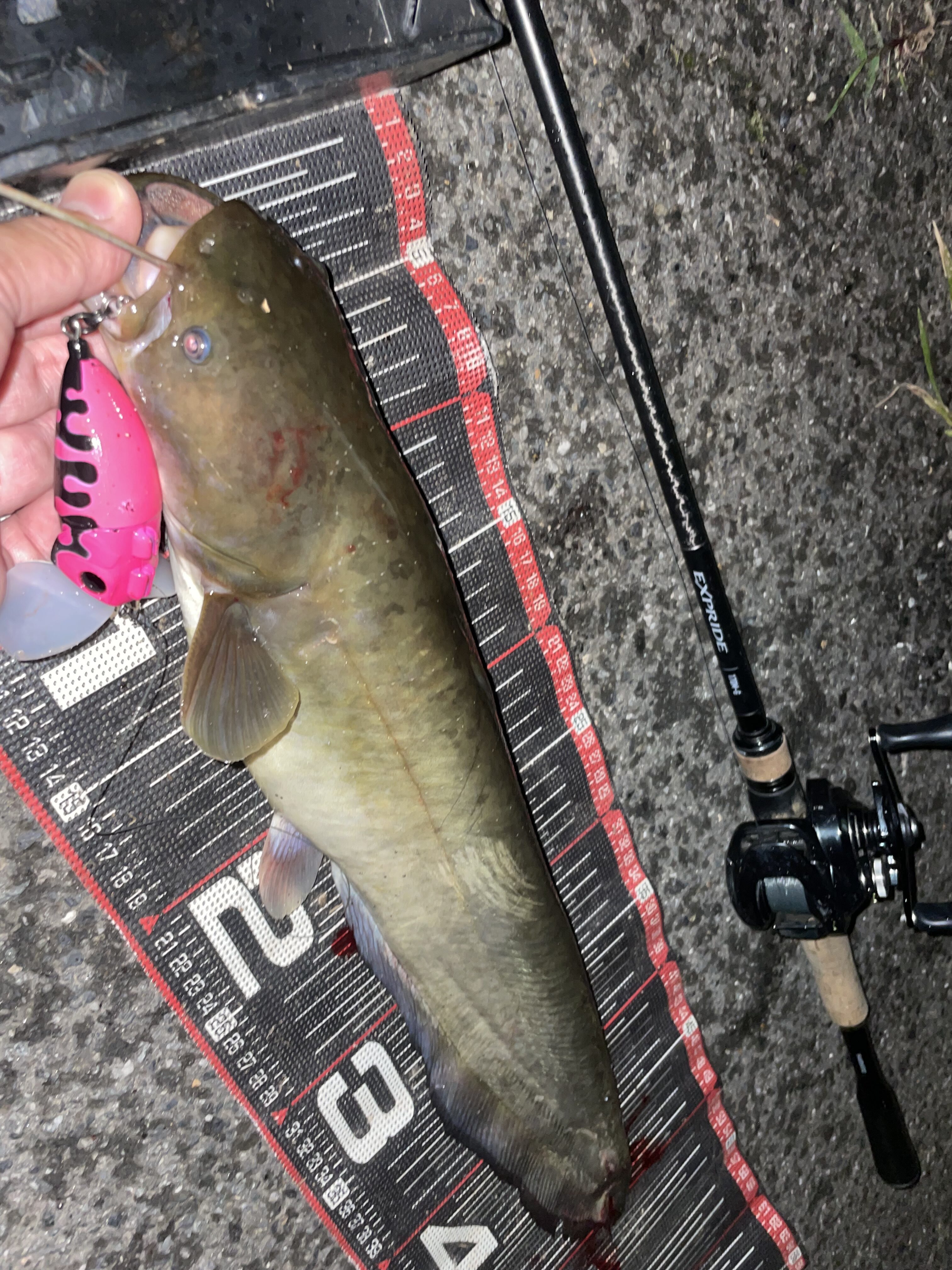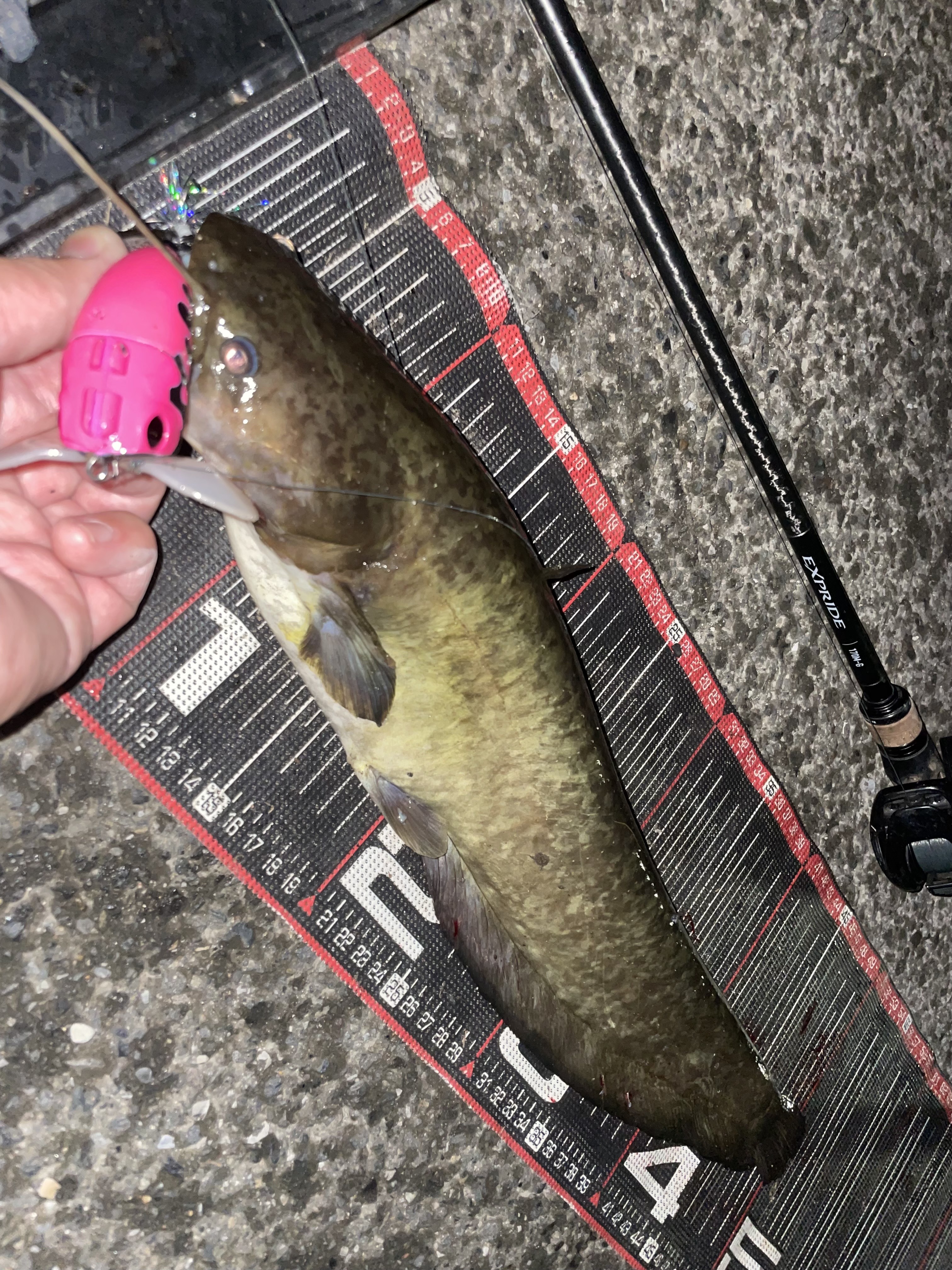 2025.07.22 印刷する ナジーバグ新色で2キャッチ! 魚種 ナマズ サイズ 51cm 数 2本 場所 埼玉県 天候 曇り スタッフ 中村祐 店舗 柏店 釣行日 2025.07.16 コメント 柏店中村です! 今回は勤務後のナマズゲームに行ってきました!前回デイナマ旅で2年連続の100本を達成したということで、記録更新を狙っていきたいと思います!昨シーズンの101本がこれまでのシーズン最多記録。まずはこの記録に並ぶため101本目を狙います! 雨後なので増水していればワンチャンあると踏み、今年開拓成功したポイントへ。早速見てみると水深2cm笑 さすがに厳しい…笑別ポイントへ移動! インレットピン撃ちポイントへ!最初のインレットは不発ののち、カケ上がりのシャローを狙っていくとバイト! 今シーズン101本目となる1本をキャッチ!51cmとまずまず! さらに上流のインレットを狙っていきます!インレット側の岸際、定番の場所を巻いてくるといきなりのバイト!ルアーが弾かれたと思いましたが、掛かっていました! 本日2本目! これで記録更新の102本目!さらにもう1バイトありましたが、フッキングせず納竿! 2キャッチでシーズン最多記録更新でした!今回の2本はどちらもナジーバグでキャッチ!カラーは今年の新色のブラック/ピンクドリップ!これは釣れちゃうカラーですね!柏店在庫ありますのでぜひお買い求めください♪ 使用した釣具 ロッド シマノ エクスプライド170M-G リール メタニウム DC70XG