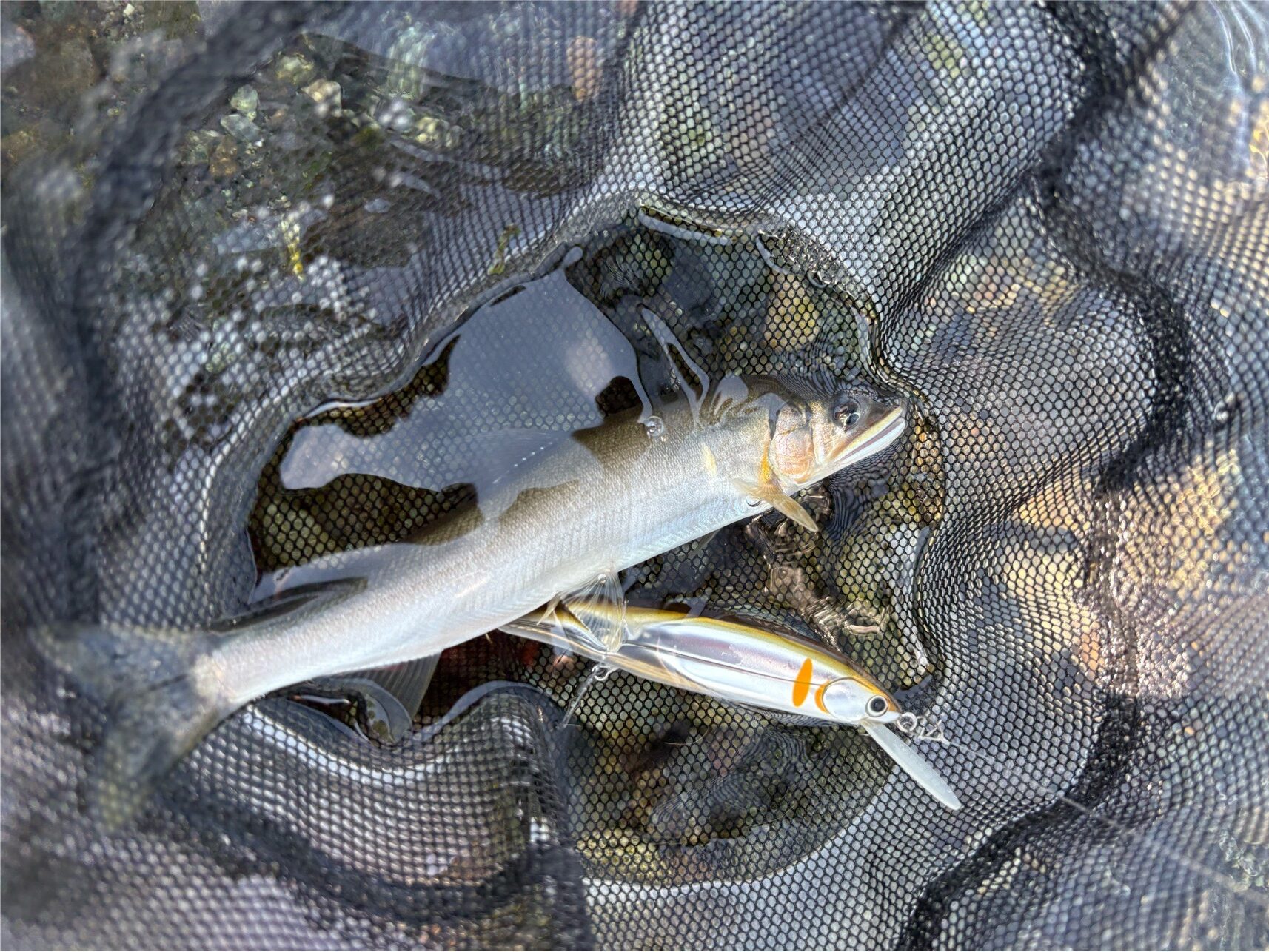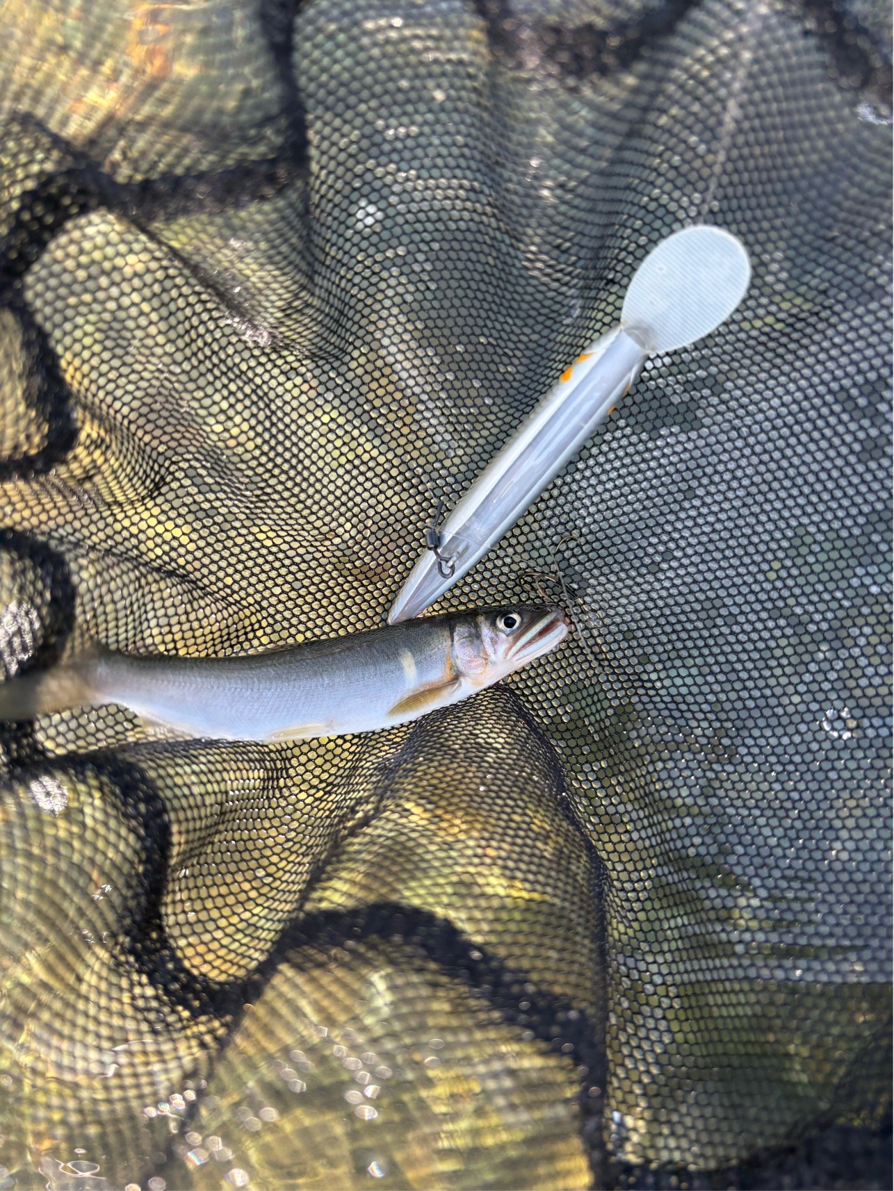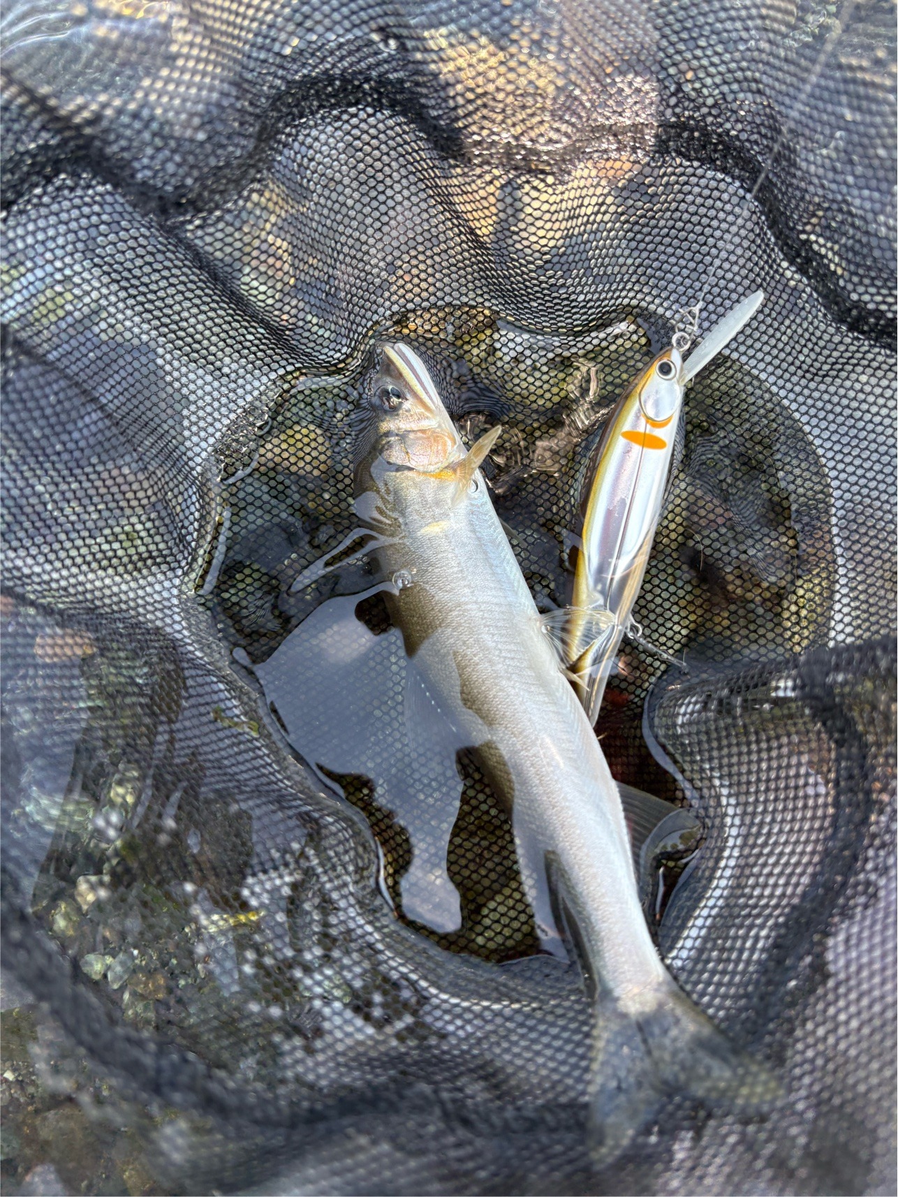 瀬から岸にかけて緩やかに深くなっていて流速もそこそこあり、いい感じに大きめの石が入っている流れを見つけたので、エスケード 80MDFで細かく刻んでいってみると、ようやくまともなサイズがヒット!