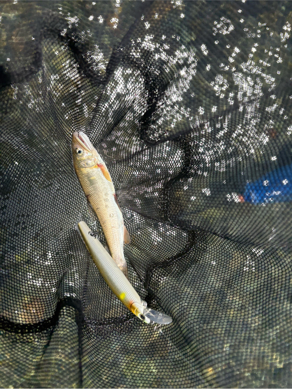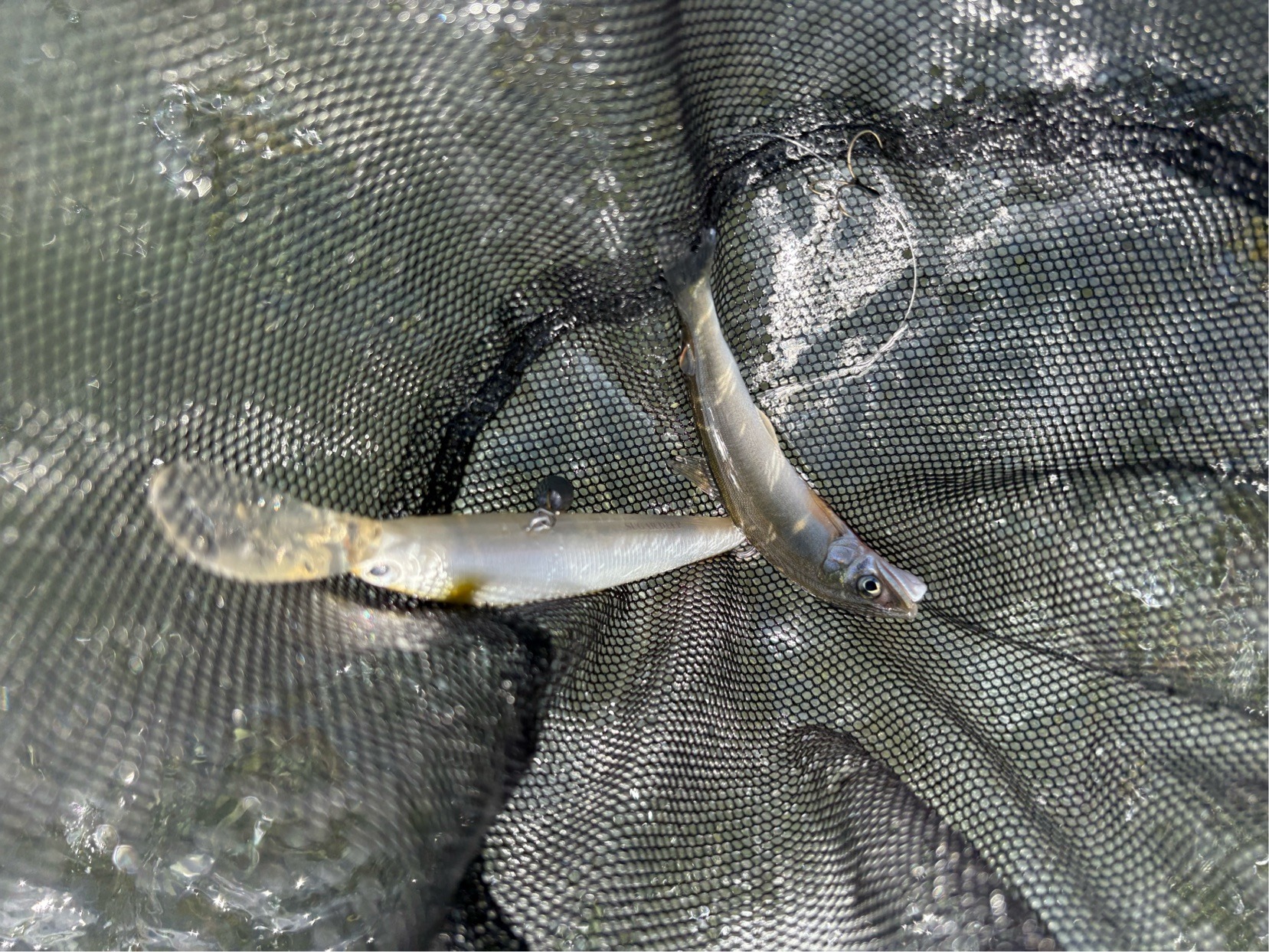 離れた上流の方で友釣りをされている方をヒントに、ボサ際のヘチをやっていくと1匹掛かりました。