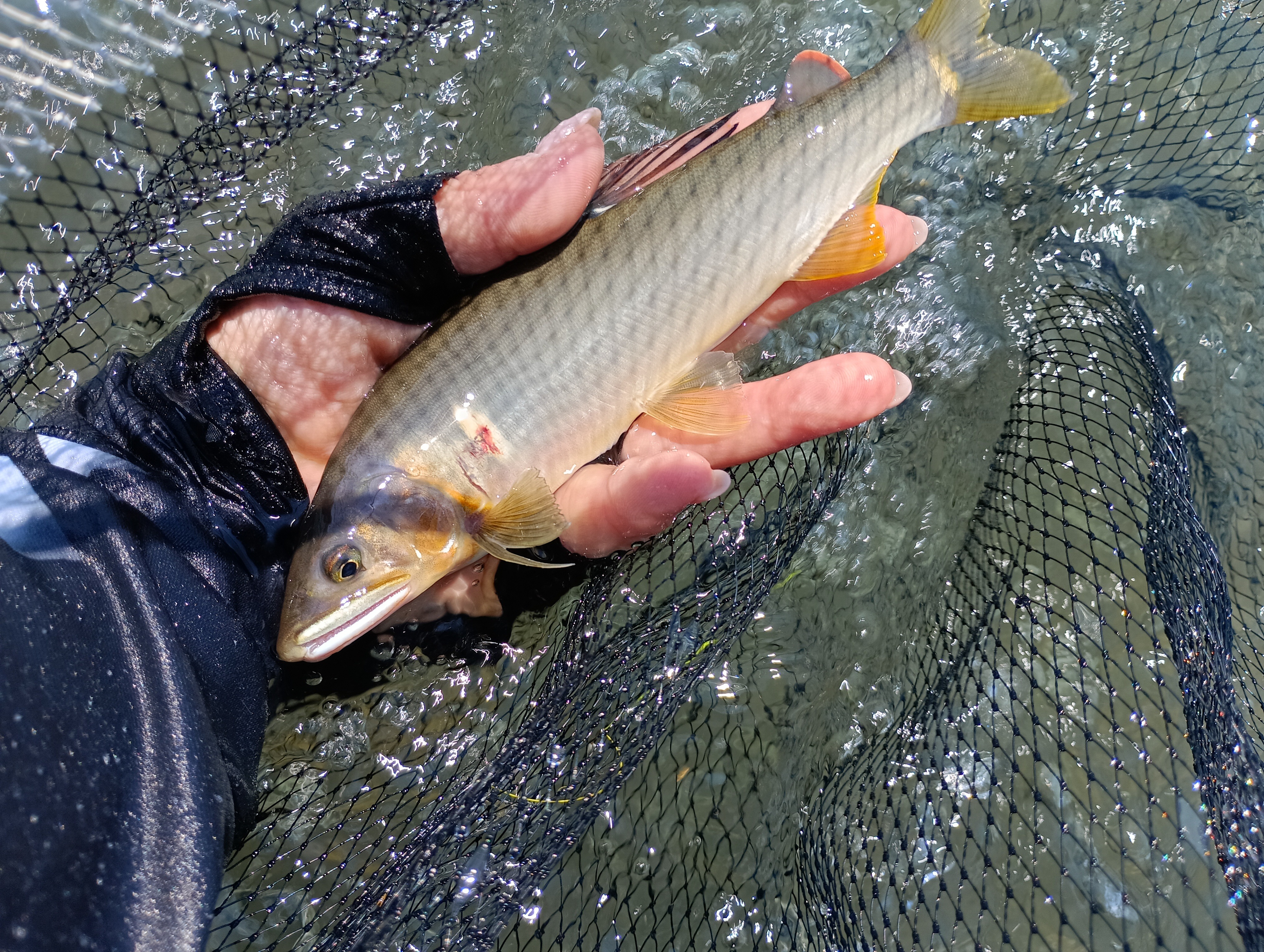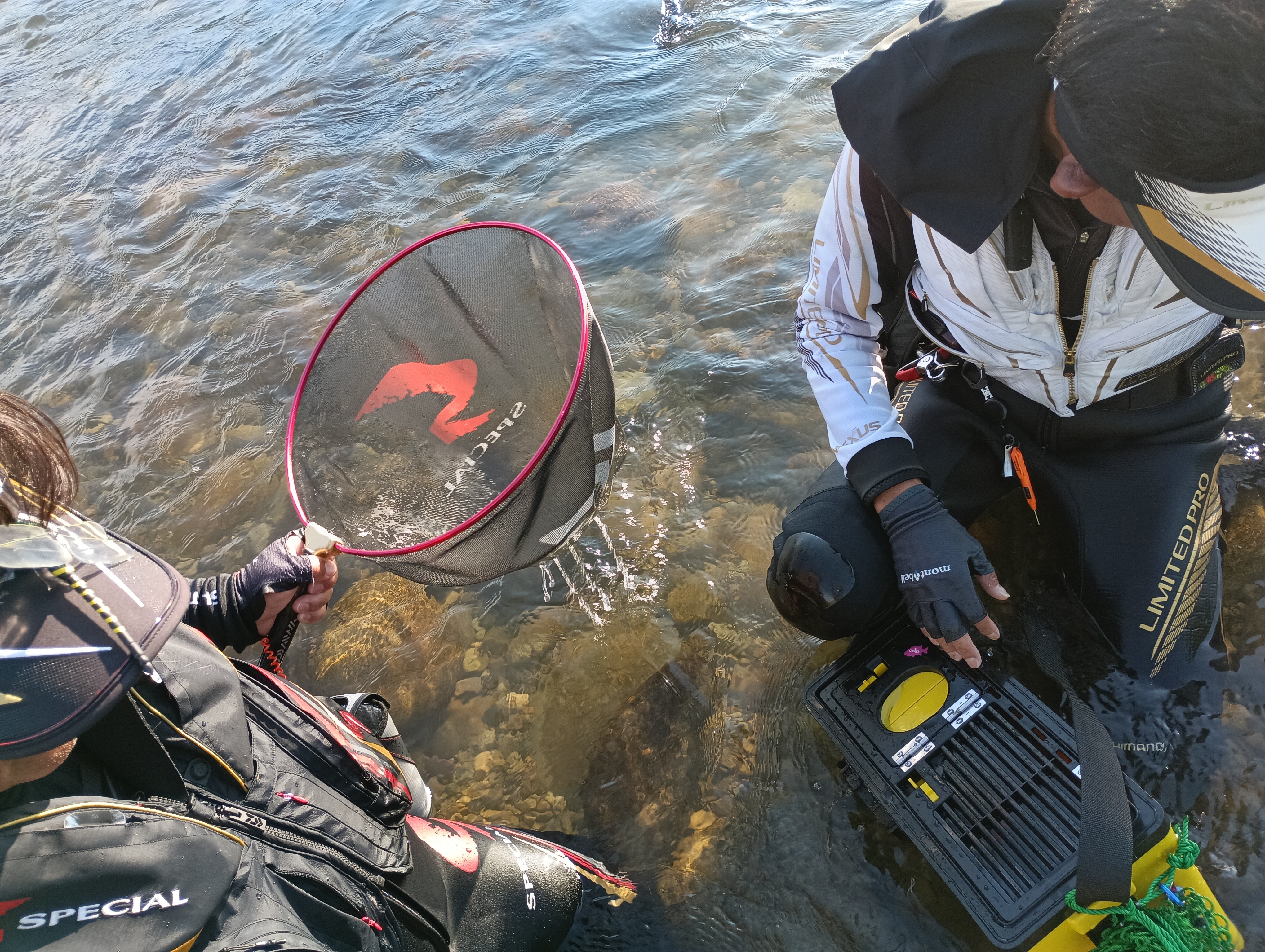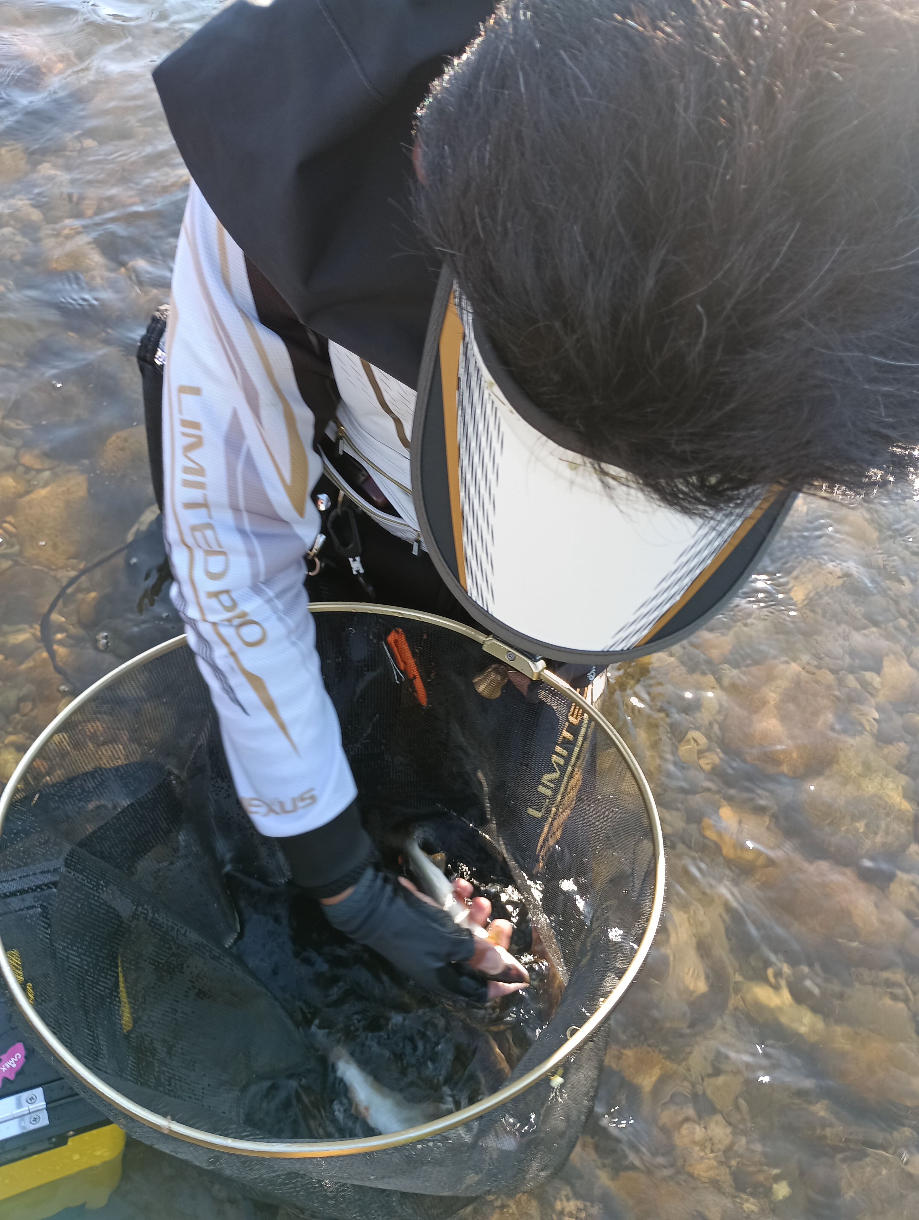 流速はそれほどてもないですが沖は水深が結構あるので浅い緩いところに誘導してキャッチ。