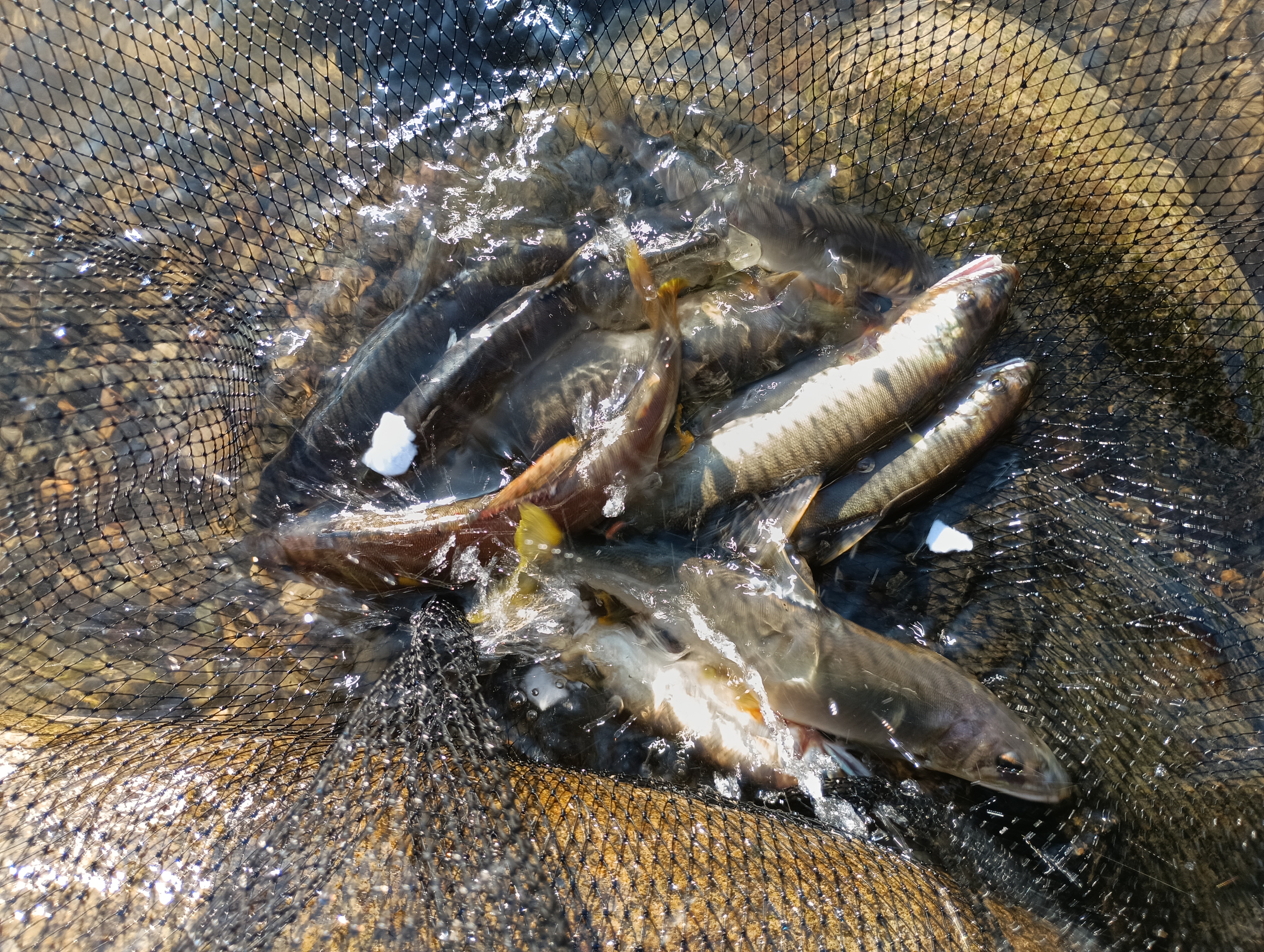 2025.07.25 印刷する 今期初の九頭竜川 中部漁協へ♪ 魚種 アユ/鮎 サイズ 15~20センチ 数 鮎/13匹 釣り方 友釣り 場所 福井県 天候 晴れ スタッフ 平川葉子 店舗 堺店 釣行日 2025.07.22 コメント 朝6時半、自宅を出発し途中渋滞に巻き込まれながら…11時前に、森石囮店さんに到着。堺店お客さんのnさんはもう到着されていました。 用意して川へ。中島というポイントにお連れさんのgさんが居られ囮をピックアップし、吉波というポイントへ向かいます。 駐車スペースに駐車して、川へ。 ソコソコ距離がありますが高低差がないのでまど楽です。 川に到着。久々の九頭竜川。中部漁協は川幅も広く気持ちいい❗ ちょうどお昼時なので、上がられる方が居られ(雑誌で見たことある年配の名手のhさん)朝からは33匹とのこと。 川に出たところは広大なトロ場で遠く上下に瀬があります。 川を下り、一旦浅くなっているところからスタート。 私の上にはgさん かなり下にnさんとhさんが。 少し時間は掛かりましたが一匹目はソコソコサイズ。 少しづつ移動しながら、流します。ぽつぽつ掛かりますがよく引く…💧 流速はそれほどてもないですが沖は水深が結構あるので浅い緩いところに誘導してキャッチ。 今日は単線の007(出来合い)を使ってますが、途中ナカハリスがキャッチの際、飛んでいきました💧 自作の008で頑張ります。 針はダブ蝶6,5を使ってましたが、ナカハリスとともにとんでいき 要r追い星イエロー3本錨7,5で。 黄色いハリスはしなやかなナイロンで、少し垂れるタイプ。流速があると威力を発揮します やや沖に立ち込みながら、時折浅いところも探りぽつぽつ掛かります 夕方になりhさんが釣り上がってきました 腰まで立ち込んでよく掛けてはります。 5時のチャイムが鳴り、竿をたたんで上へ歩きます。腰まで浸かってるので浮力があり比較的、歩きやすいです。 数えると13匹でした。 それを森石囮店さんに浸けにいき、着替えました。 今日は泊まりで明日も中部漁協で釣りをする予定です。 楽しみです♪ 使用した釣具 竿 ダイワ銀影競技ショートリミテッド80t