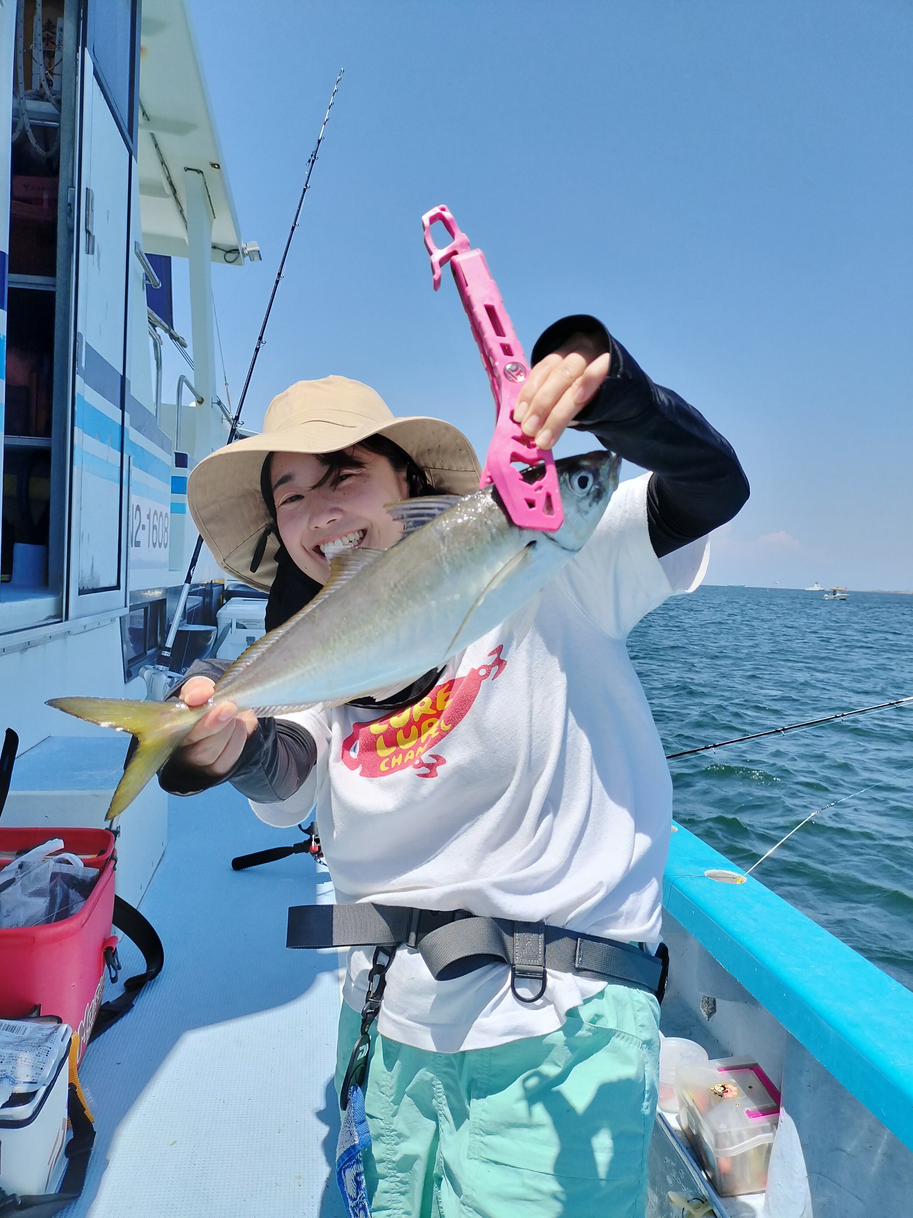 テンヤは水面でバラしやすいのでテンションは緩めずに一気に抜きあげないとダメだよーと船長からのアドバイスをもらい私も無事に本命GET✨
