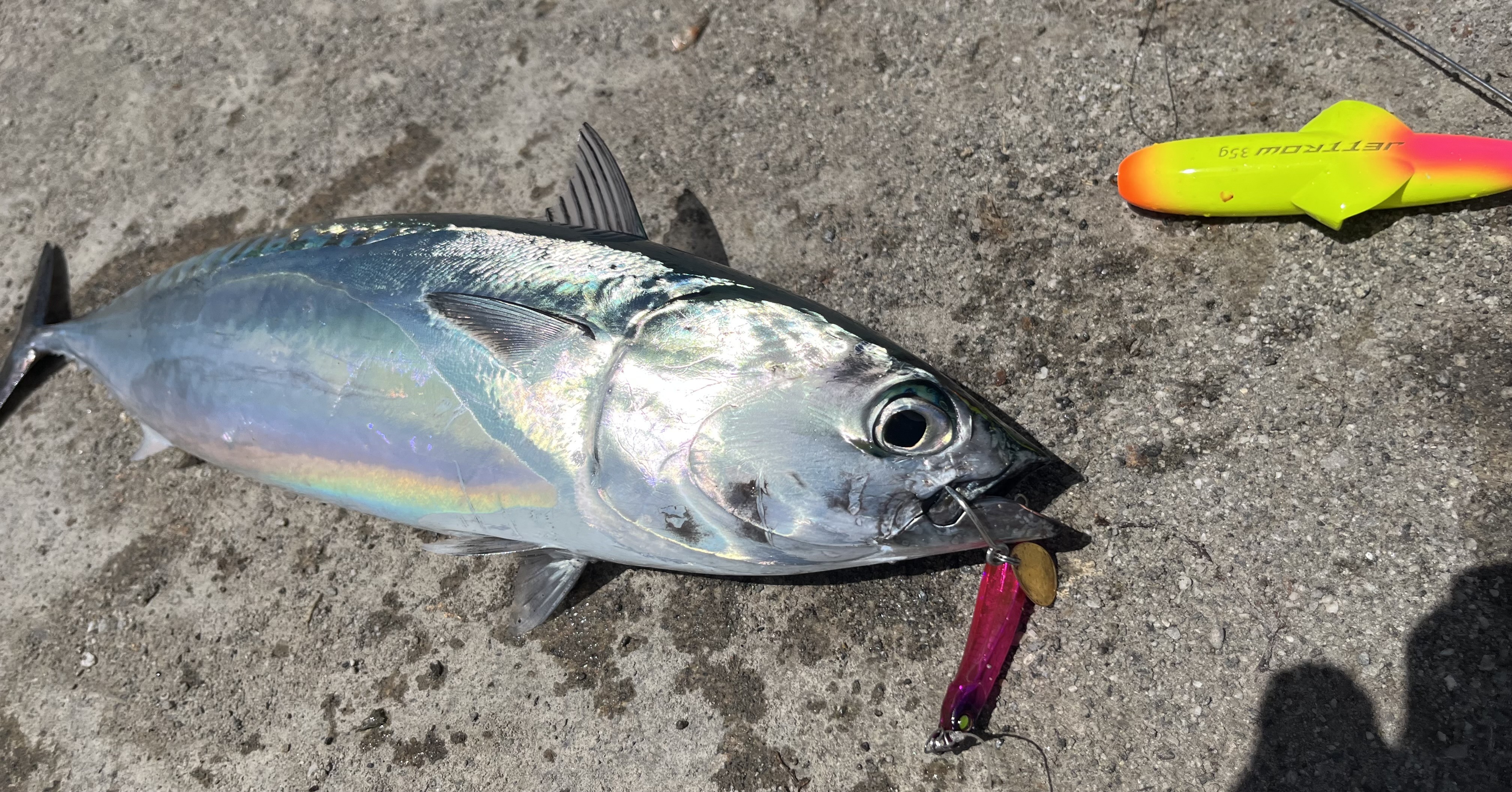 2025.07.25 印刷する 激混みソーダガツオ 魚種 ソウダガツオ 釣り方 ☆ショアジギング 場所 千葉県 スタッフ 陶山蓮 店舗 関東 川崎大師店 釣行日 2025.07.18 コメント シーズン継続中のソーダガツオ狙いに 毎年この釣りはかなりの人がされてるので釣り場は大混雑すると思いあえて朝の混みそうな時間は外し少し遅れて出発 朝9時ごろにポイントに到着するも案外人まみれ… 日が昇り切ってかなり暑いですが魚も人も元気なご様子 なんとか空いてそうなポイントを見つけてエントリー 一定のリズムで同じ場所を回遊している感じだったので先発はブレードジグ 水面直下より少し下のレンジを速巻で誘っていると一投目からヒット このブルブルした感じ懐かしく感じます。 その後も続くかと思いましたが意外と反応悪く、コマセ組の餌に好反応な模様 ある程度飛距離が欲しく、しかしルアーを潜らせたくなかったので偶々持っていたジェットローに活躍してもらう事に ソーダチューンとも言うべきか、大きめのブレードを付けてアピール力MAXに 回遊コースを読み沖から引っ張ってくる動きをしていると面白いくらいにチェイス 数投に一回は釣れる展開になり、ある程度数も釣れたので切り上げる事に 熱中症に気を付けて是非皆さんも行ってみてください‼️ 使用した釣具 ロッド Gクラフト ミッドリバーリミテッド リール イグジストLT4000-XH