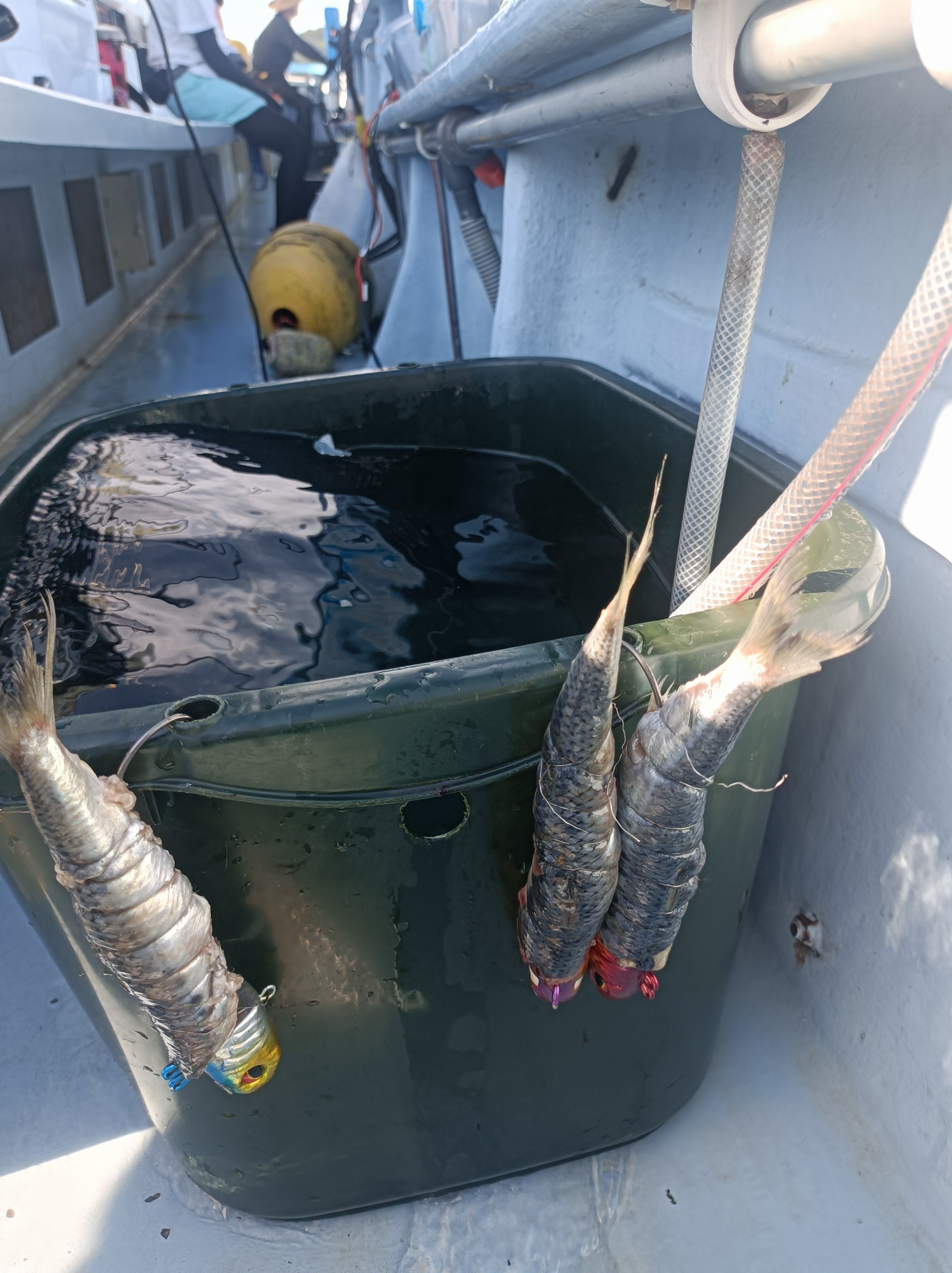 出船前の船上で、テンヤにイワシを付け方→誘い方→取り込み方など、ベテラン様から丁寧にレクチャー頂き、出船早々にポイント着。