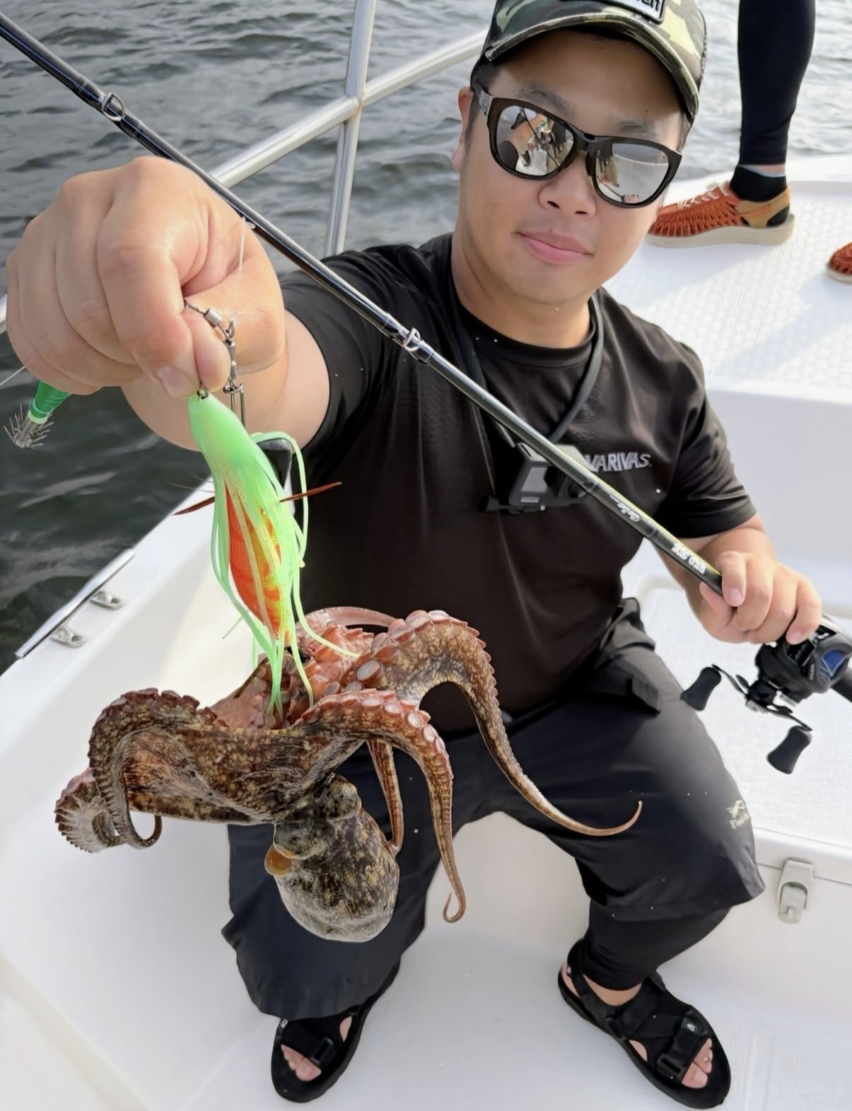 2025.07.31 印刷する 東京湾タコ調査 魚種 タコ 数 タコ/2杯 釣り方 ☆船タコ 場所 東京都 天候 晴れ スタッフ 中谷光太郎 店舗 埼玉狭山店 釣行日 2025.07.23 コメント ブンブン狭山店の中谷です。 今回は急遽お客様からお誘いがあったので東京湾のタコとついでにマゴチも狙ってきました! タコの専用ロッドは持っていないのでバスのビッグベイトロッドを代用 今年はタコ当たり年と言われるほど数が多いですが大きいのはあまり出ていない印象 今回はエギタコ2個づけではなく片方はイカのウキスッテをつけてチャレンジ!さらにタコエギにはタコベイトを装着してアピールを増してスタート 初めて10分程度したところで穂先がぐっと重くなったので巻き合わせで一気にあげて1杯目キャッチ! その後はお客様も順調にタコをキャッチ! みんなでタコのお土産を確保したところでマゴチキャスティングにプラン変更 多摩川加工でマゴチを狙っているとスレでお客様がエイをキャッチ その後場所を変えて羽田周りの砂地をやりますがマゴチのアタリはあってもフッキングには至らず。 誰もマゴチをキャッチすることできずにこの日は終了。 タコはキャッチできたので良しとしましょう! 普段はバス釣りしてる方でも硬めのタックルであればタコ釣りできますのでぜひチャレンジしてみてくださいね! それではまた 使用した釣具 ロッド ワイルドサイド WSC-65XXH リール タトゥーラ200 XHL