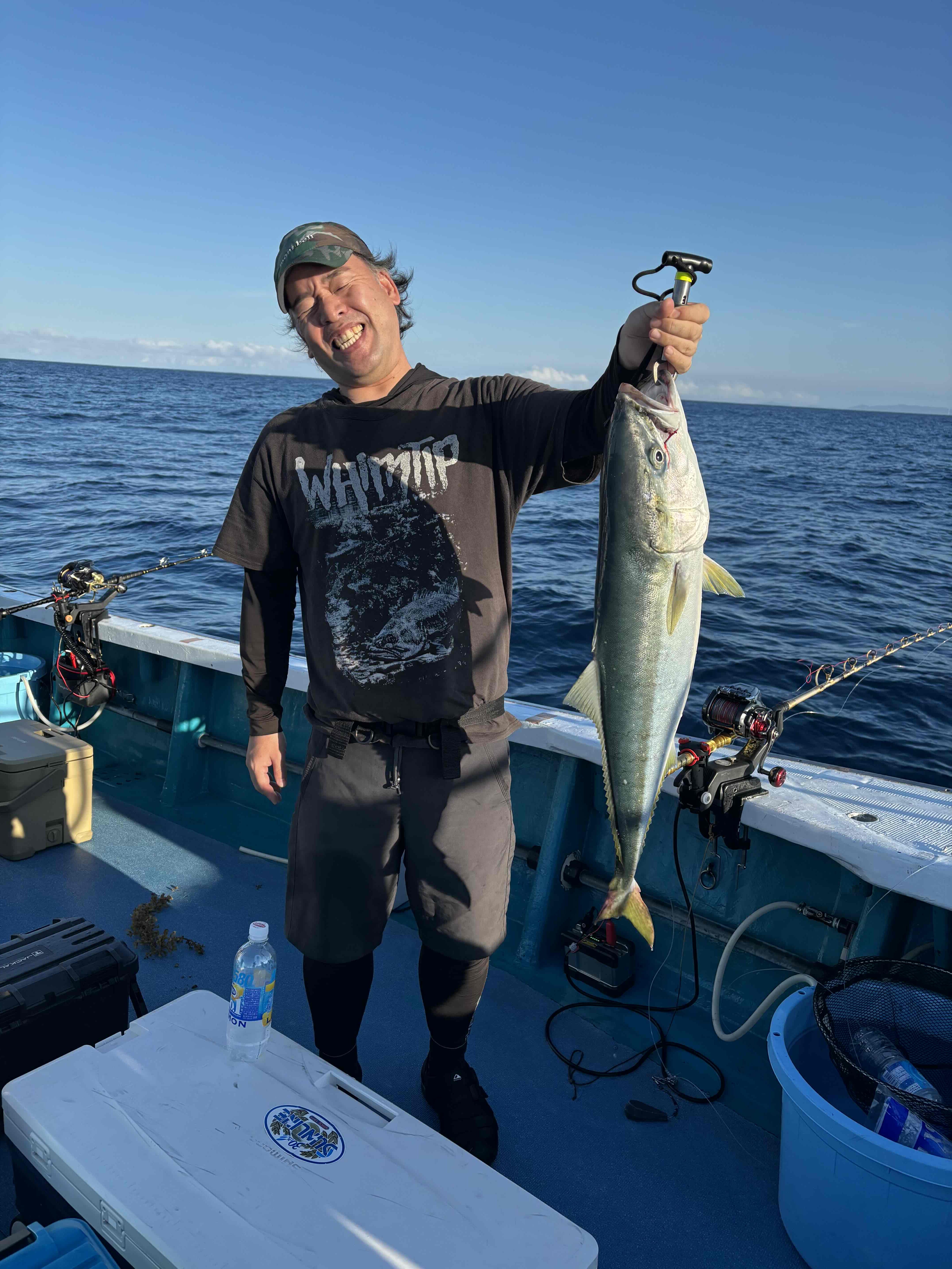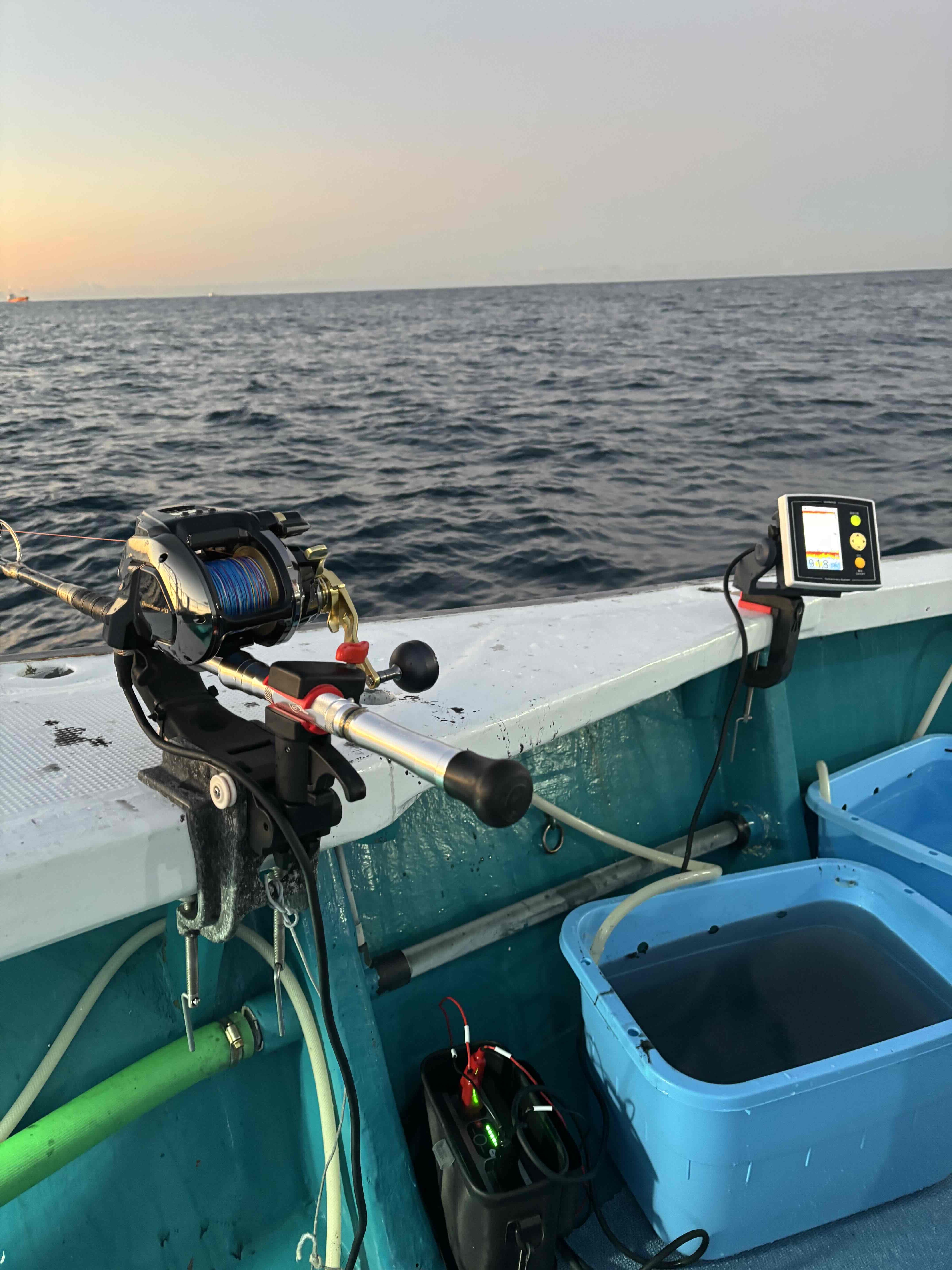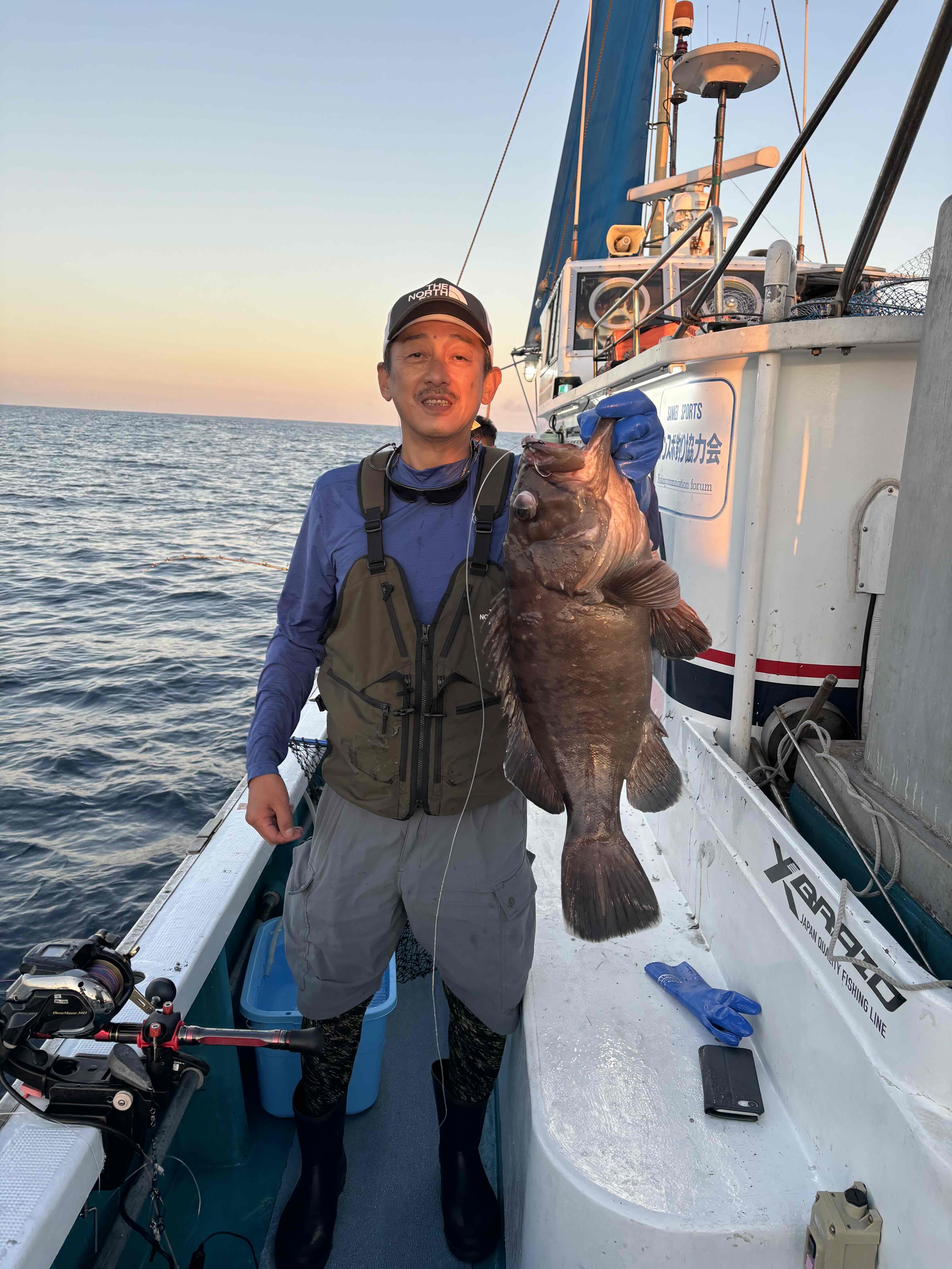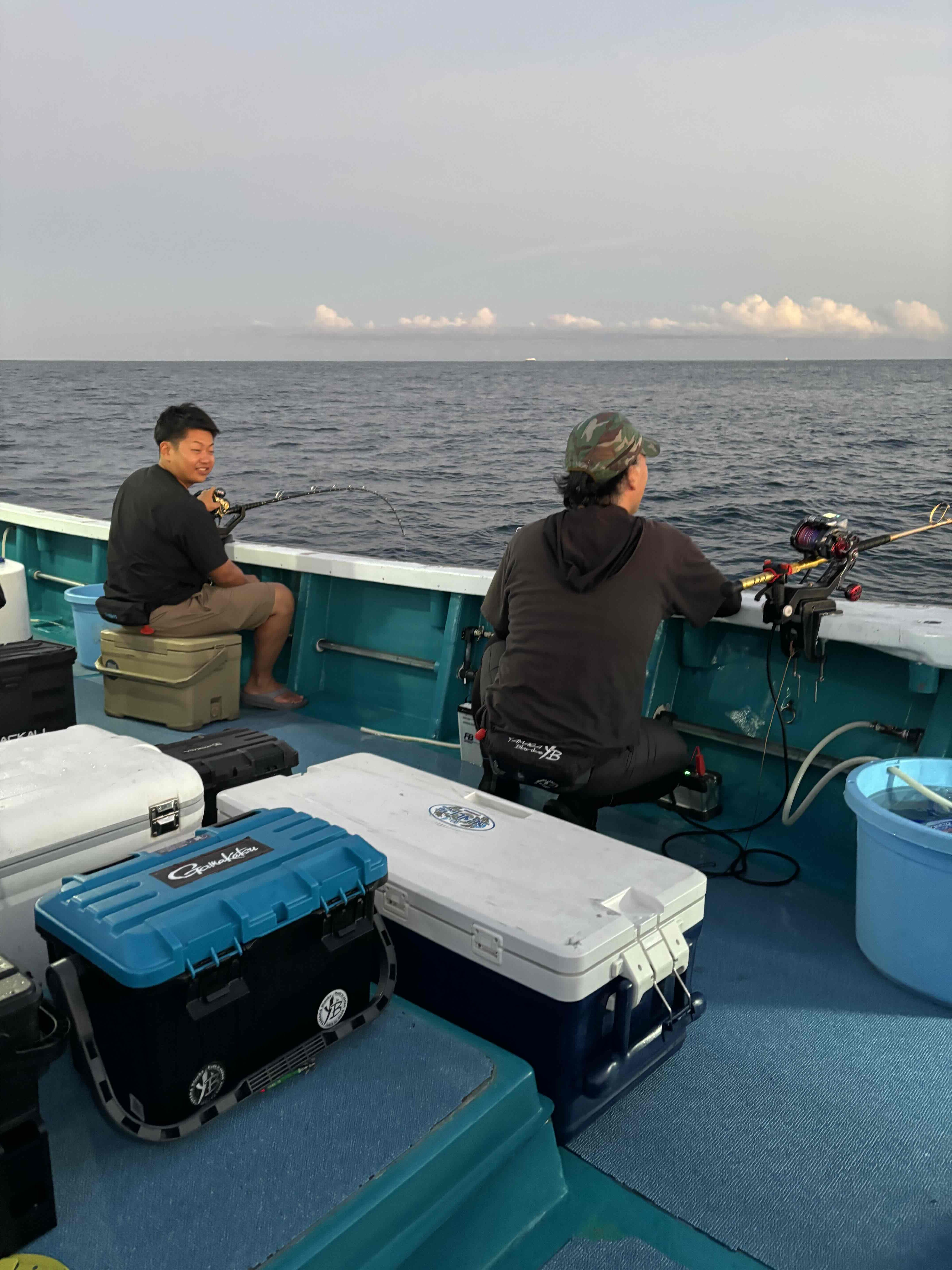 深夜1:30出船 朝の8:30までの大物飲ませ便 今回は堺店お客様での8名での出船 天気も良く釣り日和でしたが台風のウネリが入り釣りにくい状況 イカを釣らないといけません イカポイントまでは30分ほど嫌なウネリで釣りにくい状況イカのアタリは出なく聞き合わせ状態 小さなアタリがあっても乗せきれず苦戦 周りもポツリポツリ釣れるが連続ヒットまでは無くせっかく釣ってもスルメイカでは水温高く直ぐに死んでしまいエサにならない。約2時間の釣行で多い方で6杯 夜が明けるとイカのアタリも無くなり大物ポイントに移動 水深は90mライン 生きたマイカで投入ではアタリがあり船中大型マハタ 大型真鯛などこの釣りでヒットしてくるのは型が大きい魚が多く 期待がもてます。最後の活イカでの流しでアタリがあるも針掛かりまでは至らず。船中追加でメジロ 大きなオニカサゴが釣れ 大物釣りの後半はデッドベイトでの釣りとなり流していきます。小さなアタリはあるもヒットまでは至らず 時間となり終了となりました。 活イカ飲ませ釣りは何がくるか?わからず ヒットしてくるのは大型が多くドキドキ感が楽しい釣りです。 違う船で同じ釣りをした遊漁船が大型カンパチ16キロなど釣っていました。まだまだ期待が持てる釣です。是非チャレンジしてみてください。