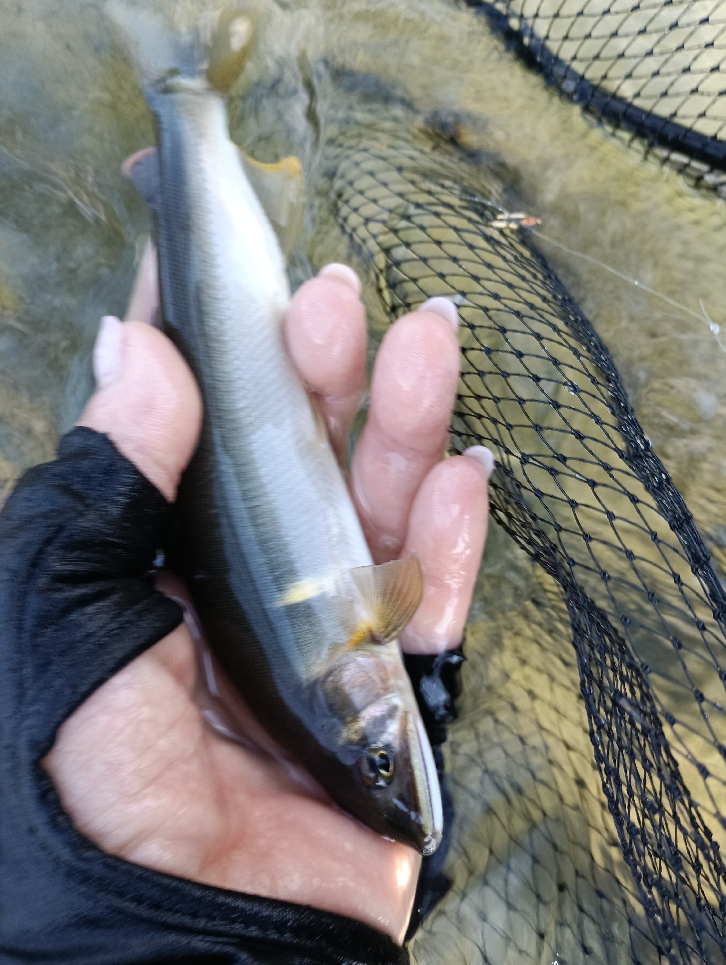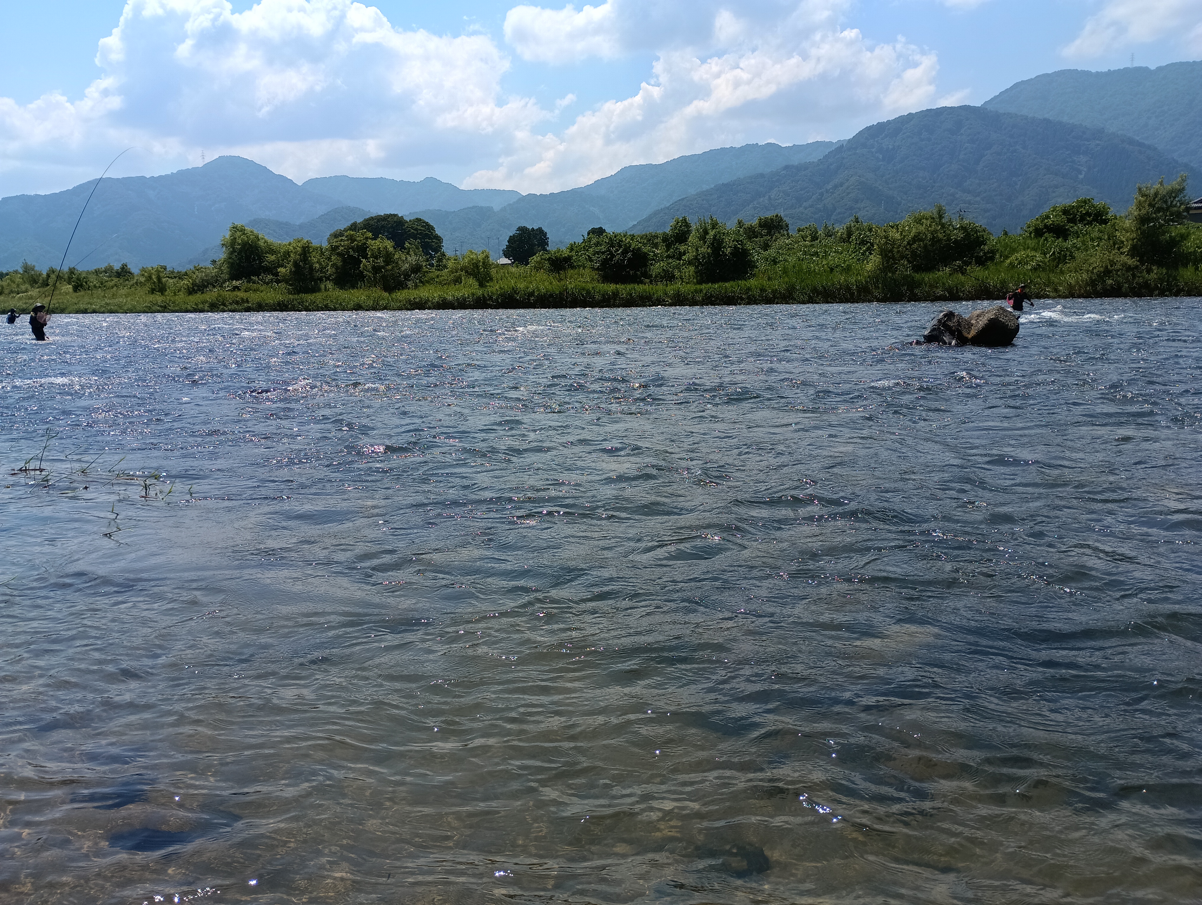 2025.08.05 印刷する 福井県九頭竜川 中部坂東島2日目♪ 魚種 アユ/鮎 サイズ 16~20センチ 数 鮎/17匹 釣り方 友釣り 場所 福井県 天候 晴れ スタッフ 平川葉子 店舗 堺店 釣行日 2025.07.31 コメント きのうから福井入りをし、夜はつむろや旅館さんにお世話になり、別のエリアで釣りをされていた堺店のお客さんと他のお客さんも一緒に夕食をいただき、早めに就寝しました。宿に泊まると、車中泊とは違い、とても体が楽です♪ 昨日の夕方少し釣りをした、坂東島へ今日も入ります。 つむろや旅館さんで今日の日釣り券を買い、 9時半、川に到着。今日はかさ川おとり店前はかなりの人… 少し歩いて下から入川します。 川にはソコソコ人が入っているので 声をかけてポイントに入ります。 九頭竜川は流れが強く、釣り上がる事はあまりありません。なので、上の方に声を掛けます。 今日は午後からかなりの風がふく予定で、午前中の風のマシな時間はaxh85で始めます。 囮をセットして流すとすぐにヒット。風がないから受けやすい。 川の真ん中にテトラが一つあるのでその裏に立ち、右岸側を向いてかかります。 かなり強烈な引きの子は少し下がりますが身切れしました💧 風が10時すぎから吹いてきました💧 ここからキャッチミスが出だします💧 腰まで浸かってるので位置も高く、また引きも強いのでなかなか受けにくい… しばらくすると足が攣りかけてきました 九頭竜川は水温が比較的冷たく、2時間浸かってると足が攣りかけます💧 仕方なく右岸にあがり少し休憩。30分もすると温まり回復するので また川に入ります。左岸からはいってる男性もぽつぽつ掛けてますが、時折大きな子を身切れさせてました 風がかなり強くなり、85の竿では折れそうにくの字に曲がるので💧 一旦お昼休憩を取ることに。 長い目の時間休憩しました。車で休んでると軽自動車が揺れるくらいの風(笑) 午後1時、朝入ったところより少し上から入ります。 人は午後もソコソコ多め。 なごれこみの下から入り、釣り下ります。風が強いので7mの竿を持ちました これなら楽にできます。 テトラがしずんでる下まで下り、右岸はややチャラ、左岸側は強い流れのポイントで沖を向いて掛けて、また、チャラで掛けて…と釣り下ります 7mの竿を持っていても風に煽られてキャッチミスが出ます💧 2時間釣りしてたらまた、足が攣りかけてきたので、今日は上がることにしました。 キャッチミスしたのを全部取れていたら数がのびたのになぁ…と反省しきりです 片付けして着替えて、 中部縦貫道に乗り、山を越え岐阜を目指します。 郡上白鳥に入ったら土砂降りでした💧 白鳥にあるかみほの湯という温泉施設がとても気に入っていて、再訪しました。 お風呂にゆっくり入った後は、今日はこちらで車中泊です。 明日は、馬瀬川上流で開催される、オーナーカップ鮎全国決勝大会に堺のお客さんが出るので応援&観戦に行く予定です。 使用した釣具 竿 ダイワ銀影競技axh85 竿 シマノ友鮎7m