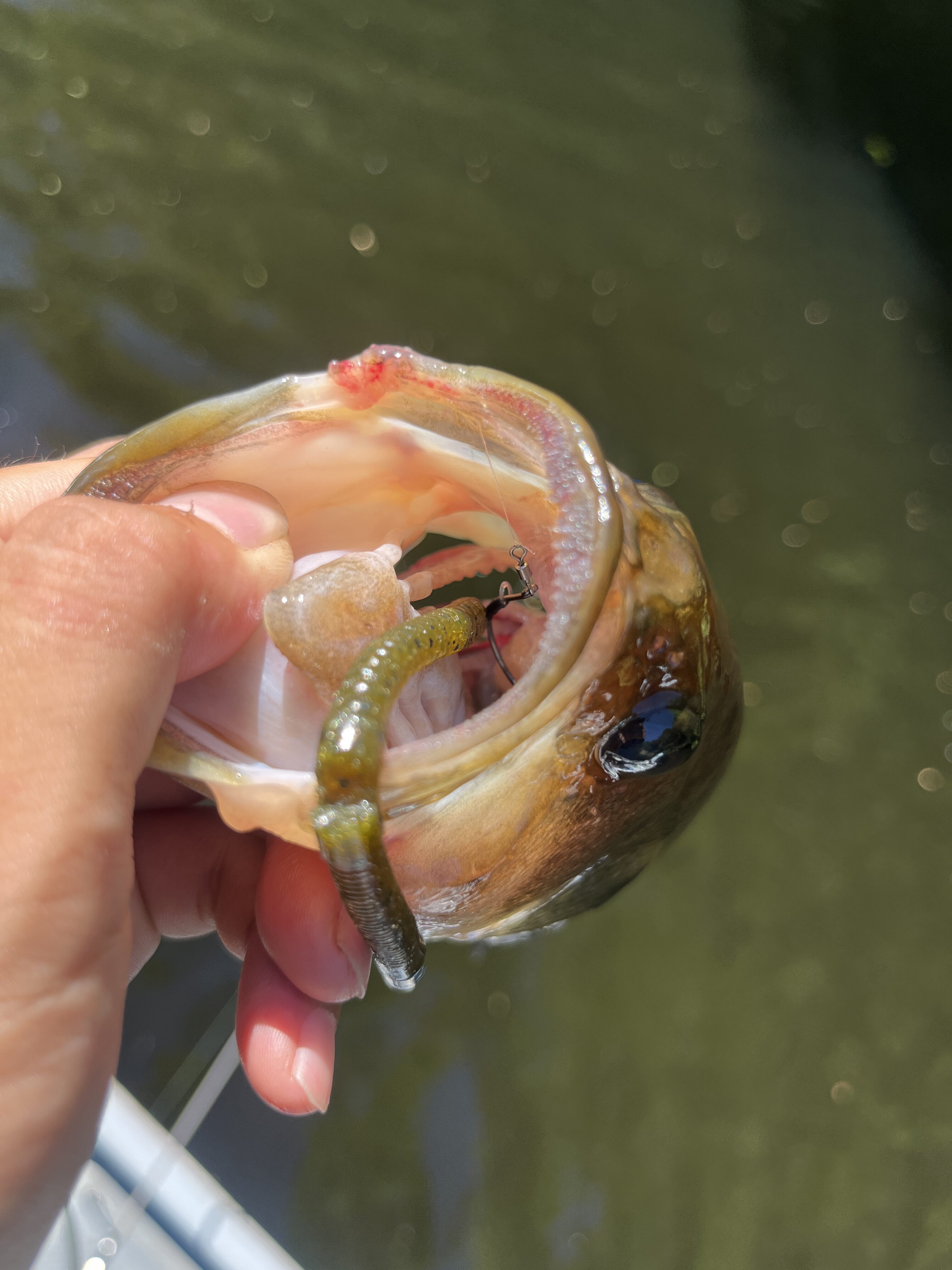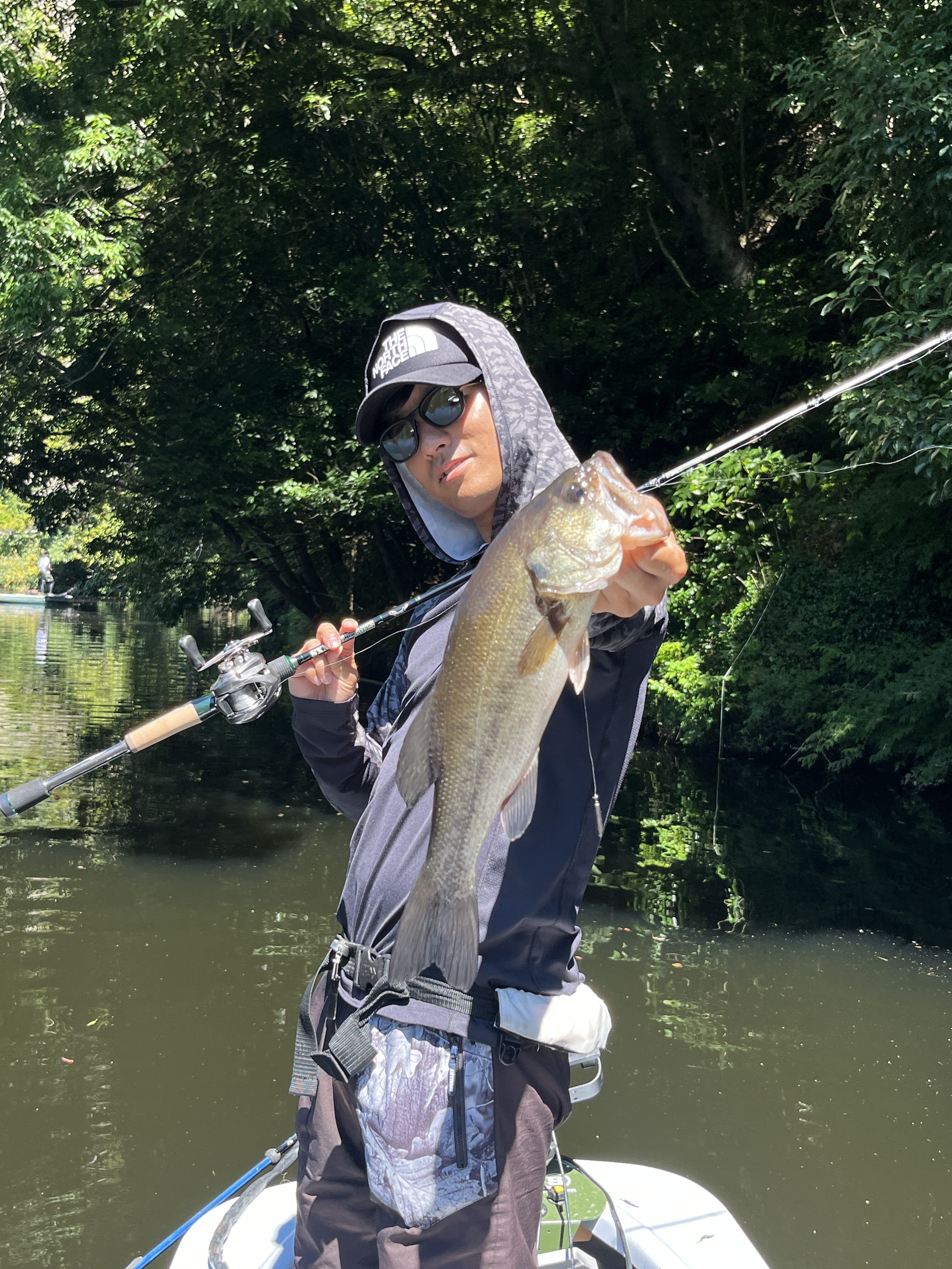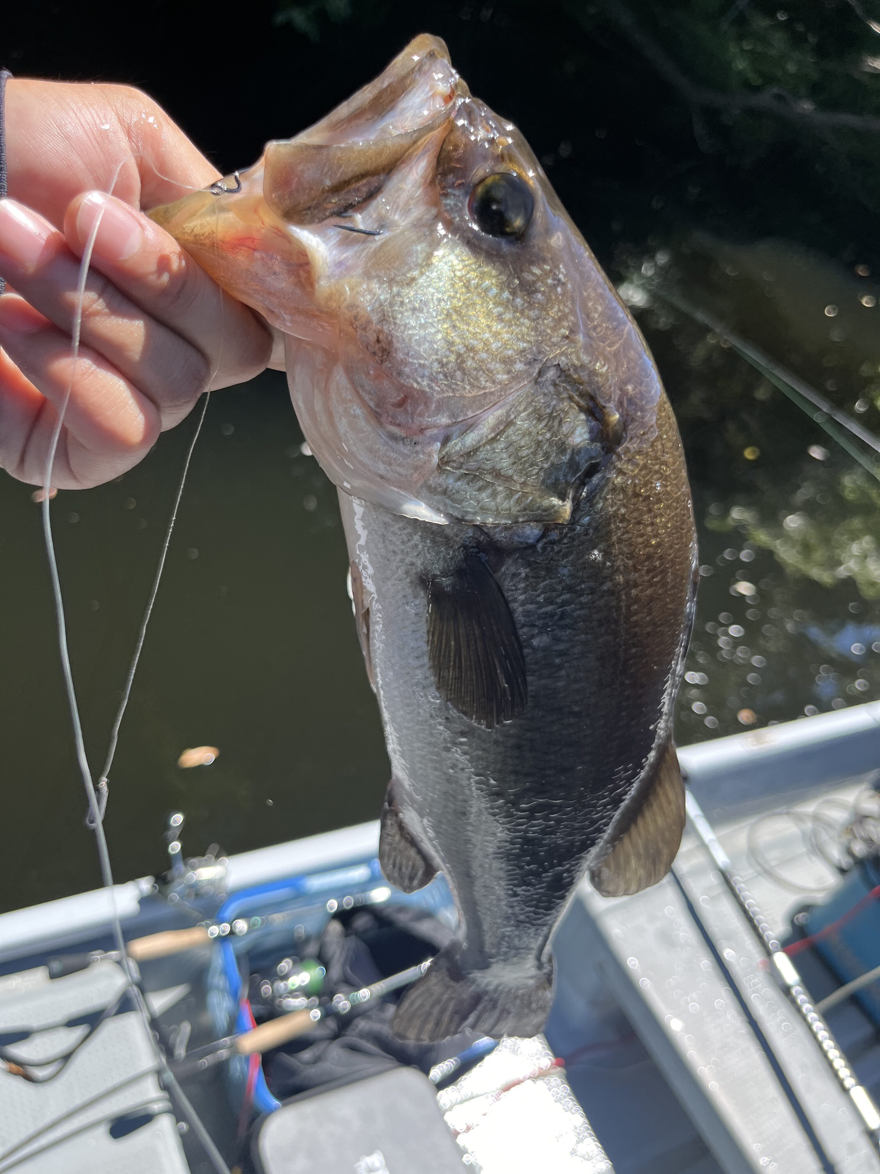 朝は涼しくて快適!出船してすぐ本湖へ!ギル系ルアーをグライドアクションさせて流していきます。すると速攻でバスの姿が!ほぼ毎回のキャストで1匹付いてきますがなかなか食べてくれません…その中でも特大サイズがまさかのバイト!もフックアウトでさようなら👋泣