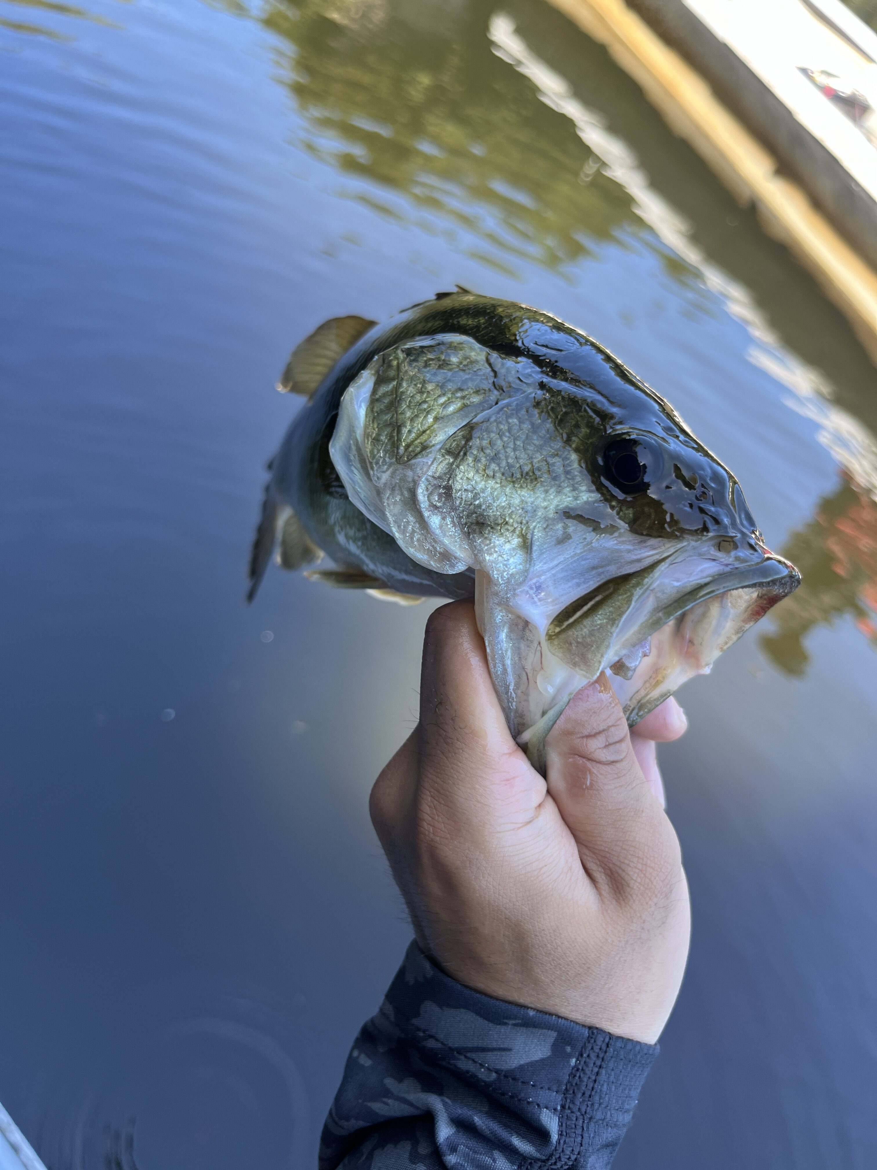 その後はすっかり日が上り、周りは釣れてるとの情報が入ります!ここは切り札のダウンショットを投入。今回はリアシートにバス釣り初心者の方が同船してるのもあり、とりあえず魚を触りにダウンショットを投げてもらいます。するとこれが連発!1投1匹の世界!無事魚も触ってもらい、またギル系へ!相変わらずチェイスはすごいですが今一つ口を使わない…ルアーをベローズギルに変えてフォールさせることに。これはすぐに反応!サクッとキャッチ!その後は続かず、昼上がりの為帰路へ。帰り際必殺のラッシュウェーブ4インチのカバーネコでポコポコ追加してもらい帰着となりました!