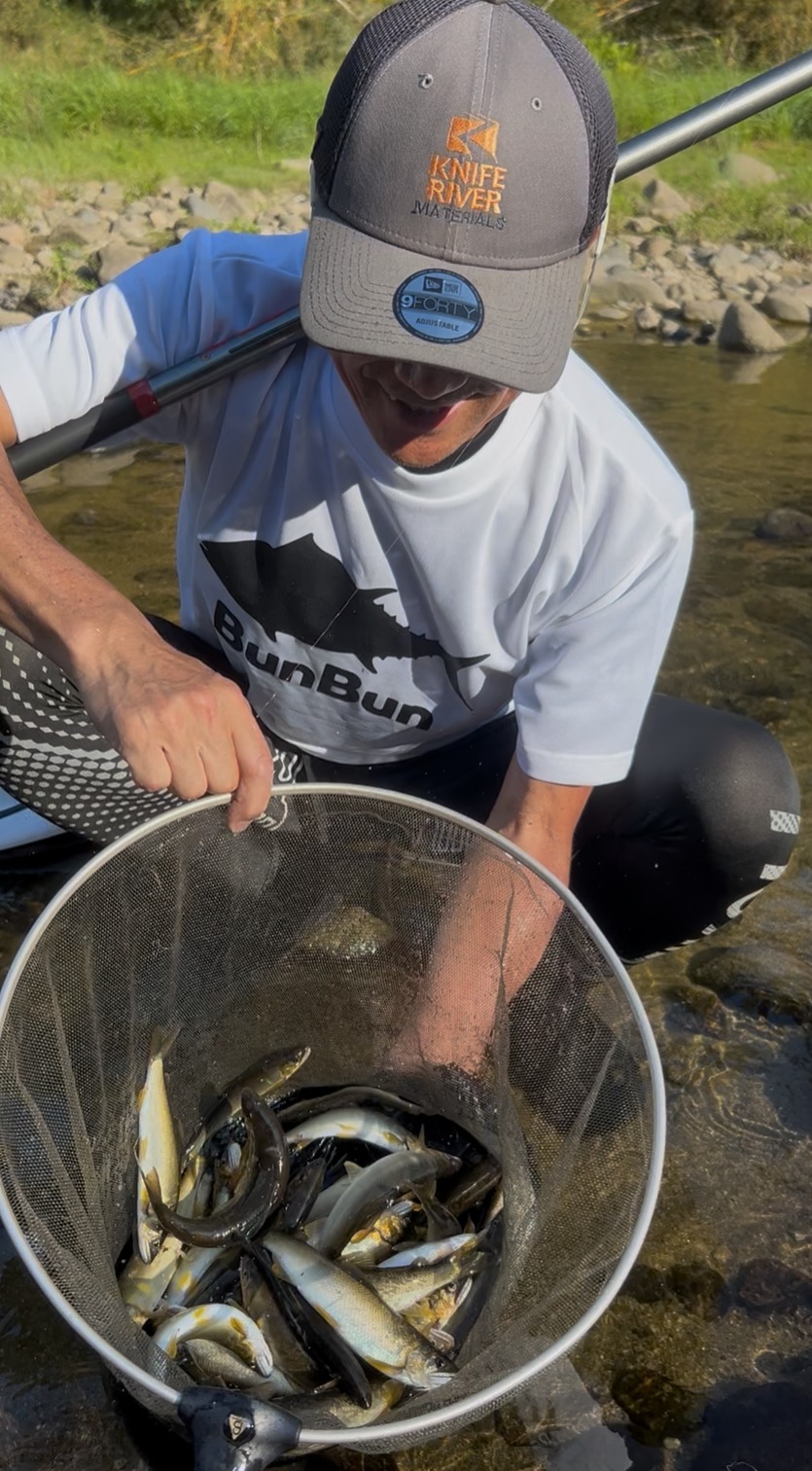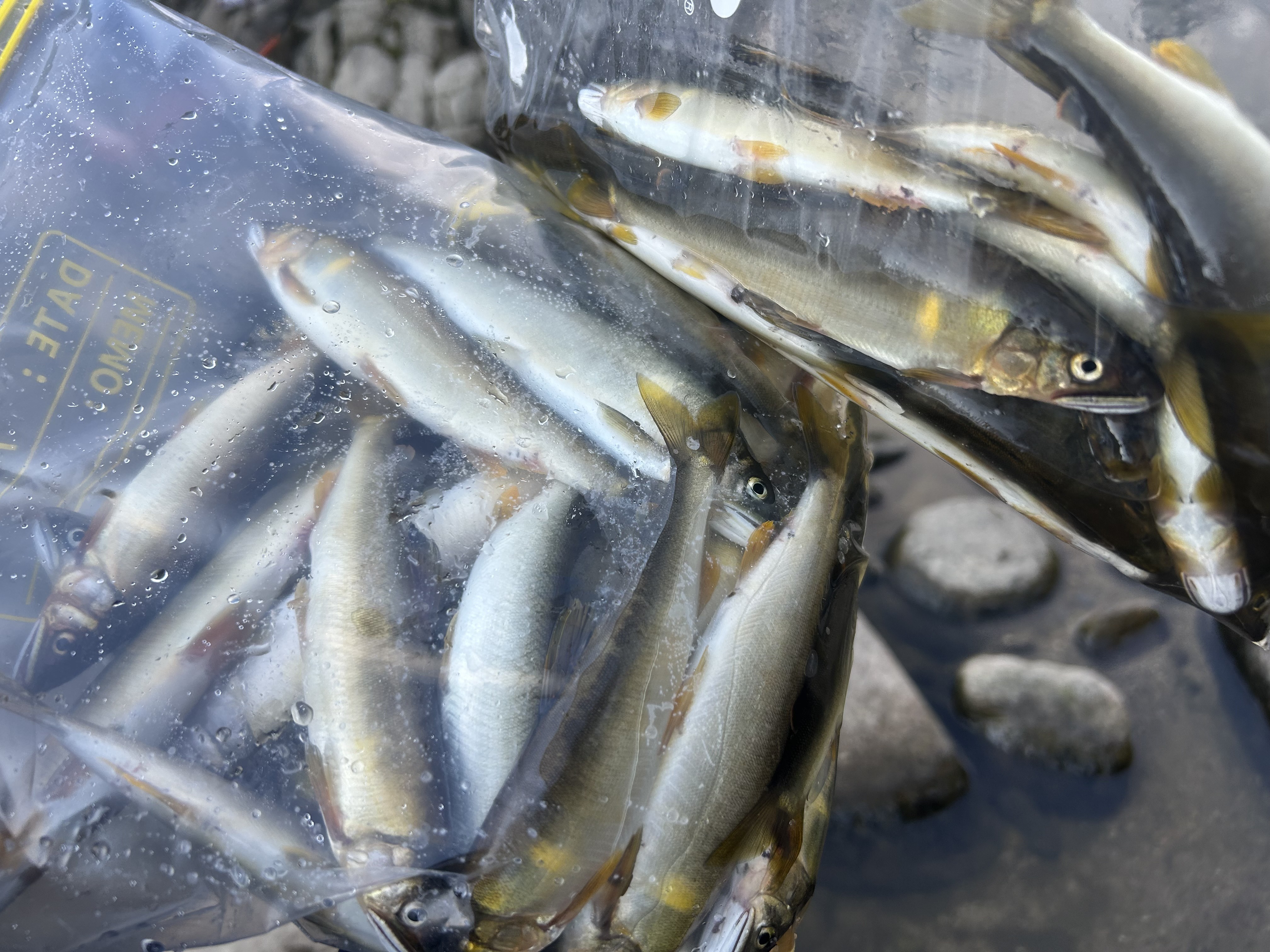 何とか1匹目をキャッチし、その後ポツポツと続きます。鮎は追い星クッキリの綺麗な鮎で、大きさ関係なく釣れたら嬉しいかぎりです😃