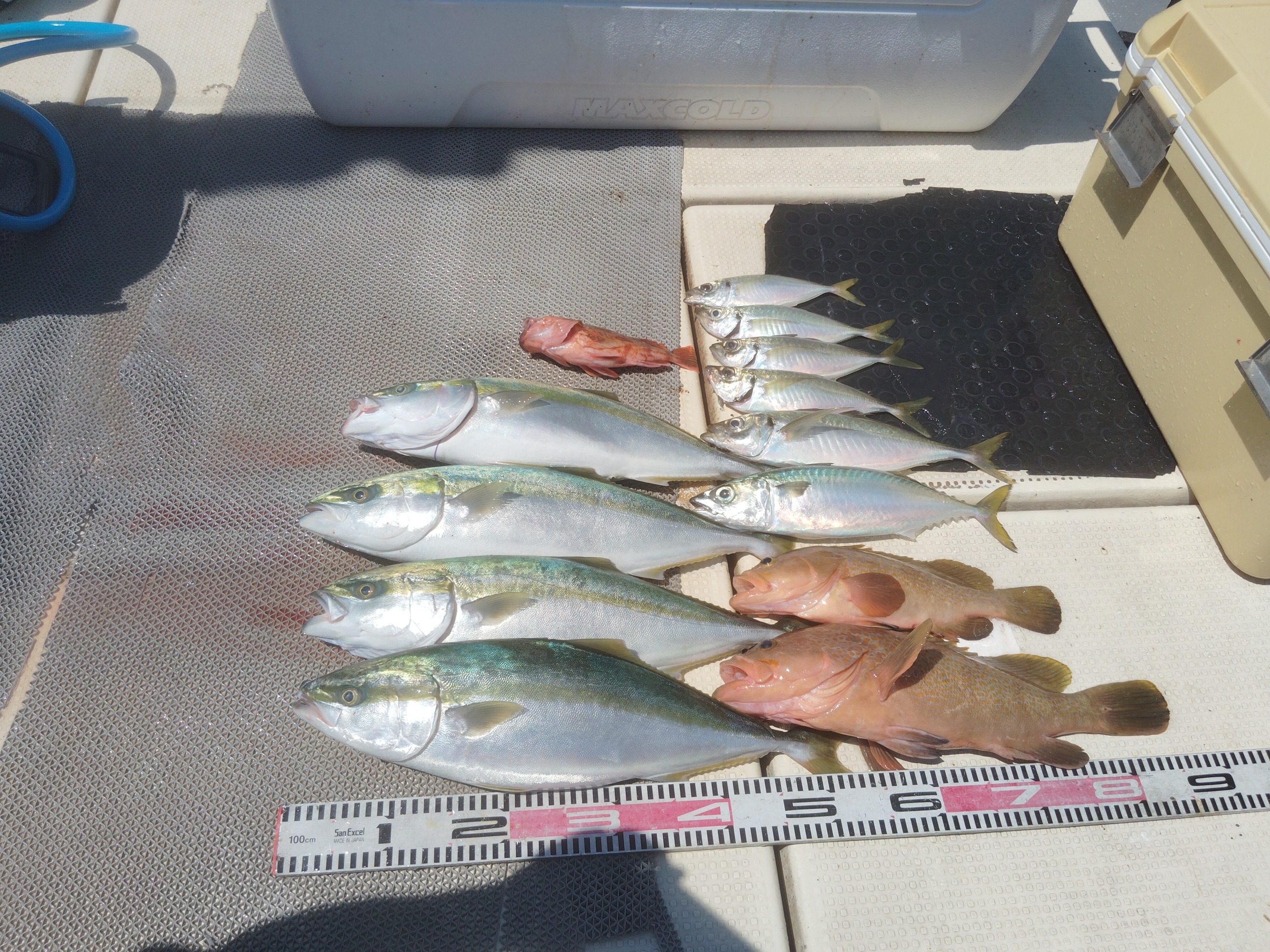 1投目2投目は反応ありませんでしたが3投目から、船の真下にベイトが集ってるのが見えてエサなしでも鈎全部にかかります。エサの小魚はアジとサバ。