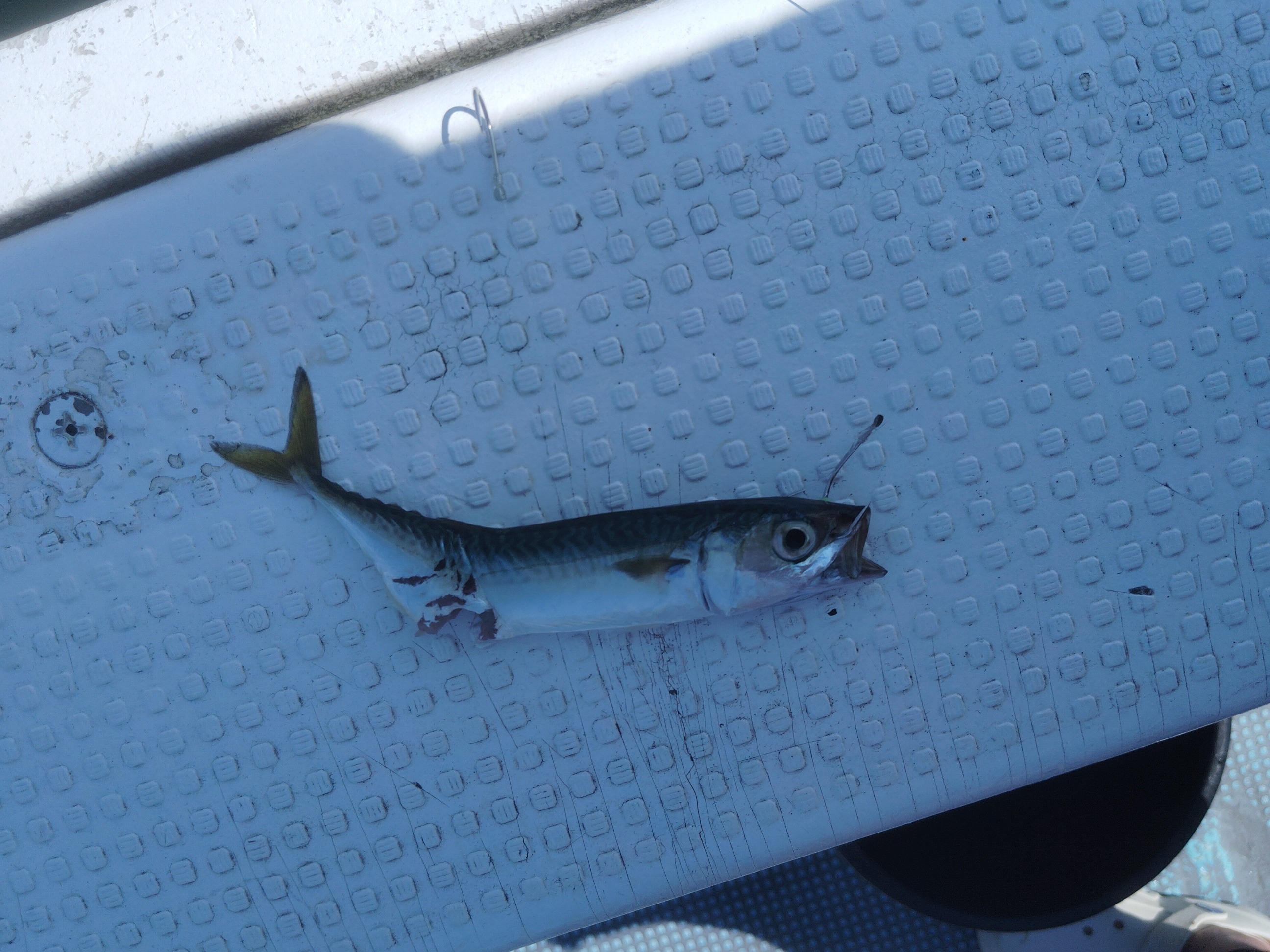 1投目2投目は反応ありませんでしたが3投目から、船の真下にベイトが集ってるのが見えてエサなしでも鈎全部にかかります。エサの小魚はアジとサバ。