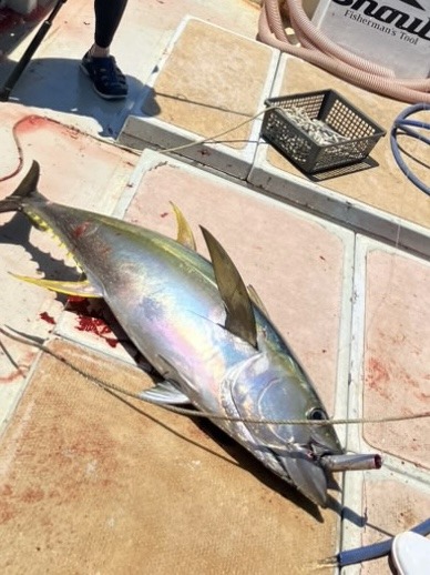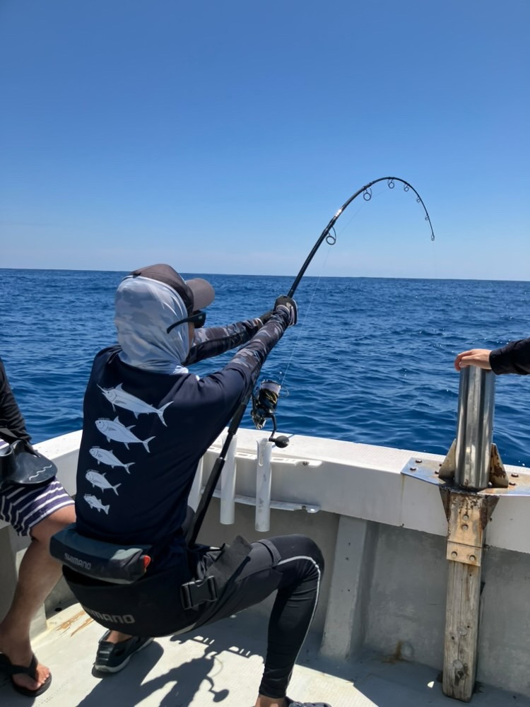 冷静に魚を走らせて5回横にフッキング。魚が止まったところで銀バルに入れて1対1の真剣勝負。思ったよりすぐ船下まで寄りましたがここからがキツイところ。船の下に潜るやなんやらで少し苦戦しましたがなんとか水面に浮かすことに成功💯上がってきたのは30kgのキハダマグロでしたが無事取ることができてホッとしました❗️