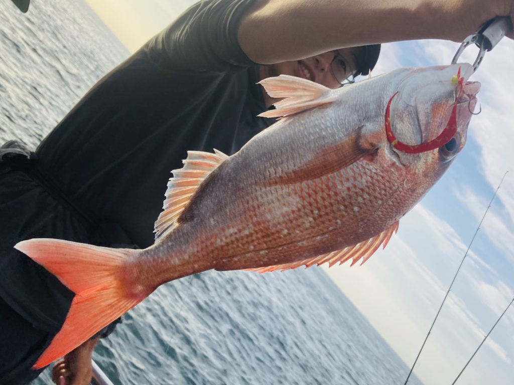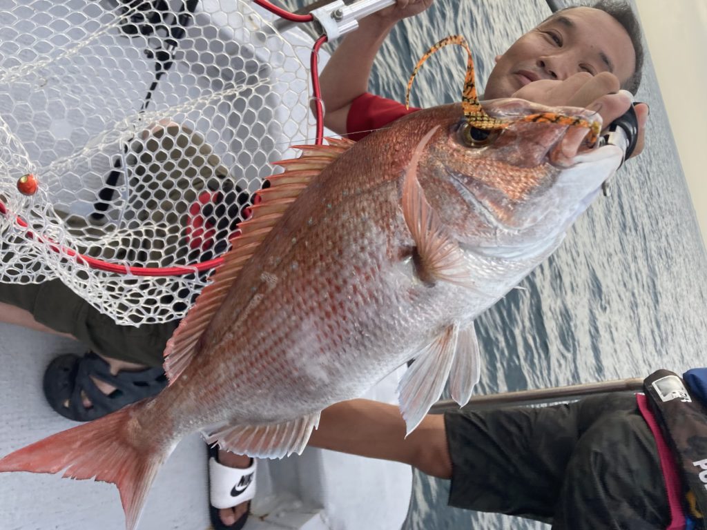 2025.08.14 印刷する 夏の明石沖タイラバ、釣果安定しています♪ 魚種 真鯛 釣り方 ☆タイラバ 場所 兵庫県 天候 晴れ スタッフ 嘉田康司 店舗 堺店 釣行日 2025.08.08 コメント 1週間ぶりのタイラバはいつもの虎ノ介さんへ西昆陽店厨師匠と行ってきました。出航前の場所決めジャンケンで厨師匠が勝ってくれたので左舷ミヨシを確保!さすが師匠、朝からいい仕事してくれます♪ 朝一のポイントは橋の東側5~60mラインからスタート、当日は各所とも2枚潮きつくシャローエリアもあまり行かなかったため終日80gのヘッドで通しました。アタリのほうは朝からコンスタントに出て塩焼きサイズから40半ばくらいまでのサイズがコンスタントに釣れる状態。鯛龍ノロシ、ジャッカルマスターカーリー、スタートマジカーリーとローテーションしていく中どのネクタイでもアタってきますがカラーはオレンジゼブラに集中、またノロシの80やマジカーリーjrではサイズも小さめ、ノロシ120やマスターカーリーミディアムだと釣れてくるサイズも一回り大きくわかりやすい1日でした。 アタるパターンもほぼ底ベタ、着底から5巻きくらいまでが勝負で基本デッドスロー、1回だけ速巻きの10巻くらいでアタリましたがそれ以外はすべて5巻きまでとこちらも攻めやすいパターンでした。昼前には失速しましたがやはりミヨシだと攻め方も色々工夫しやすく最終8枚といい感じで終わることが出来ました。 当日はネクタイ有利な状況でしたが、前々日の午後便では厨師匠がジグで60アップ2枚含む50アップばかり6枚という釣果を上げておりベイトの付き具合によってはジグ有利な日もあるので当分はタイラバとタイジグ、両方を持参されたほうが良いと思います。 使用した釣具 竿 紅牙エアーN69MHBTG リール オシアコンクエスト200PG ライン PE0.6号、リーダー12ポンド