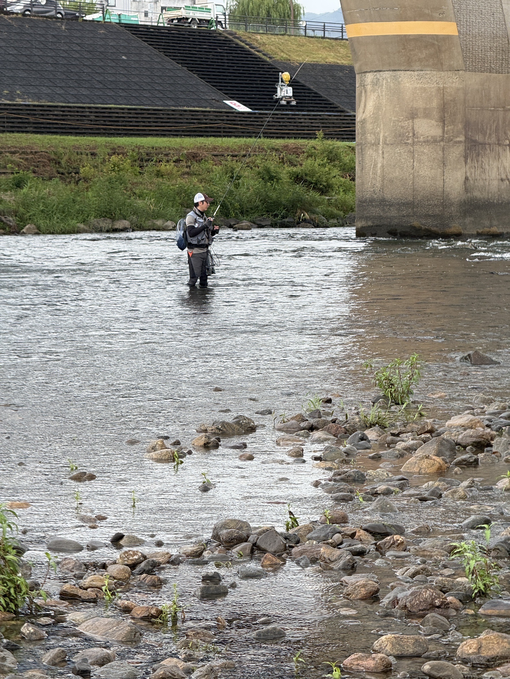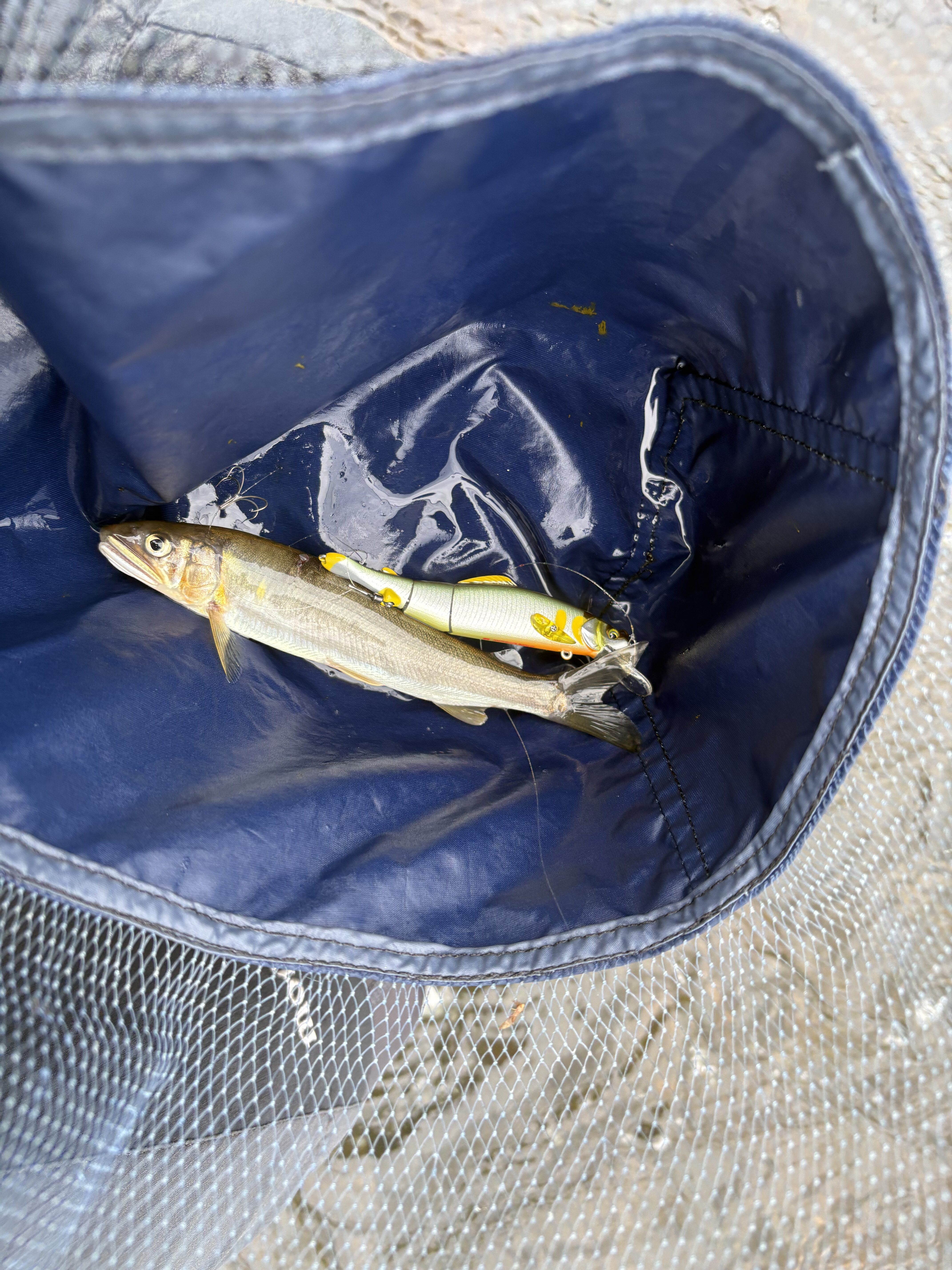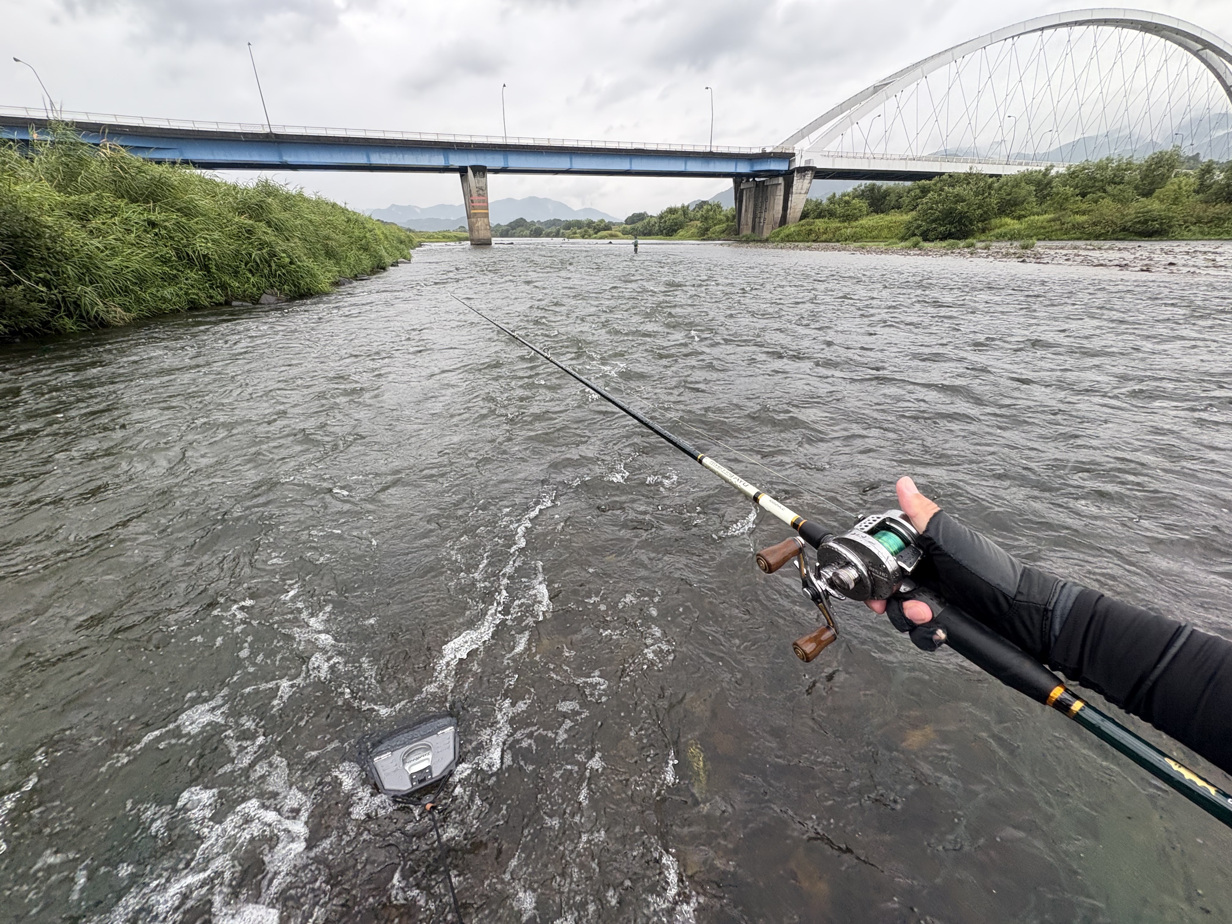 2025.08.14 印刷する Aer you Riverring? 魚種 アユ/鮎 サイズ 18 数 7匹 釣り方 ☆アユイング 場所 近畿 京都府 天候 雨 スタッフ 碇山篤志 店舗 本社 釣行日 2025.08.10 コメント こんにちは、碇山(いかりやま)です。 雨予報の由良川。漁協で遊漁券を購入し話を聞くと、高水温と渇水で鮎の成長が遅いらしいが鮎は多いようで近くの場所へ入る。 今回はプロックスのリバーリングアユのベイトモデルをお借りして実釣。 スピニングと違い糸の出し入れが非常に便利!同じ場所を何度も狙ったり、根掛り時に糸を送り込んで外したりとメリットは非常に多い。 さて実釣の方は、流れ込みの絡む瀬で待望のヒット! バラシも多く、やっとヒットしたと思ったらこんなゲストも 午前中いろんな場所を攻めるが反応がなく、移動しようか?と思ったところで何気ない場所で突然ヒット!僕にもヒット&バラシと実はこの辺りがアツイのか?そのまま下流のポイントを探ることに。 小型のヒット&バラシが続く中、瀬の下でデカイのが当たるようで、そこを狙うと いいサイズが釣れ、時間を空けて狙うとさらに追加。 もっと強烈な引きのヤツも来たがバラシ。 ここで大雨になってきたので橋の下に避難しつつ、さっきの場所を探り追加。 天候不良の中でもアユイングが楽しめました。 流れや水深によってルアーの使い分けで反応も異なります。雨天もあってか?控え目な色が反応良さそうでした。 使用した釣具 ロッド プロックス リバーリングアユ 1002MLC リール シマノ コンクエストBFS HG L ルアー ダイワ アユイングミノー94SF、95SS、ジャッカル オトリミノー88、パームス エスケード100MDF