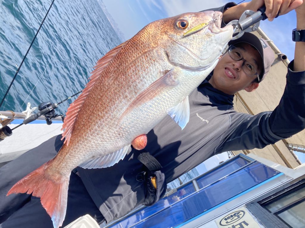 その1流しでアタリ!なかなか底から離すことができない鯛。粘り強くやりとりであがってきたのが66センチ!
