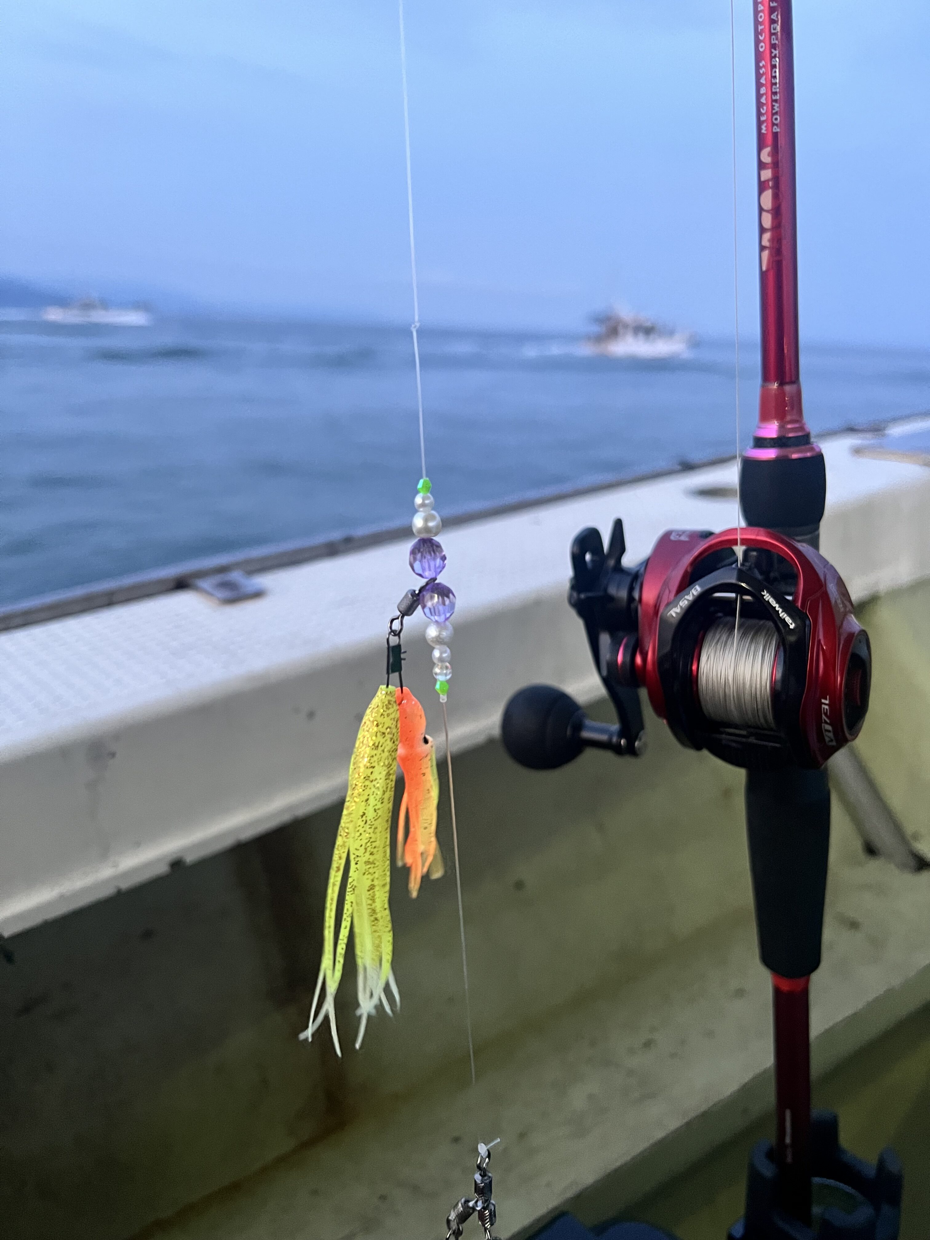 2025.08.14 印刷する シーズン後半の船タコ 魚種 タコ サイズ 200g〜960g 数 20杯 釣り方 ☆船タコ 場所 兵庫県 天候 晴れ スタッフ 鍾宥杰 店舗 堺店 釣行日 2025.08.09 コメント つり具のブンブン堺店の鍾宥杰です 本日、シーズン終盤の明石船タコ釣りの調査に行ってきました。 今回お世話になったのは久しぶりの丸松さんでした。 明石の船タコ遊漁船といえば丸松さんでしょう。人気がありすぎで、なかなか予約が取れない船ですね。 朝4時30分から受付開始、5時ジャストに出船、瀬戸内海のポイントまで約25分くらいの距離でした。 ポイントに着いたら、早速タコエギを落として、タコの反応を捜査。場所はやや深めの27メートルでした。 明石の船タコは5月1日から解禁、もう三ヶ月連続叩かれて、今はシーズン終盤なのでなかなか厳しい状況が続いて、釣果は大分落ち着いたらしいです。 開始してから1時間くらい、タコの反応がなく、船中の20人の中では僅か2杯くらいしか上がっていませんでした。船長もプレッシャーを感じ、三回ポイントを移動してくれまして、それでも釣果が上がりませんでした。 そして、8時くらいに岡山沖の超浅場に移動、そこから全員ボコボコ釣れて、凄く楽しかったです。サイズはちょっと小さめですが、数はまあまあいい感じでした。 結果は20杯。最大サイズは960gでした。 もうこれで冷凍庫はパンパンになります、来年のタコシーズンまで、少しずつ消費していきます。 使用した釣具 竿 タコーレ エイトポッド ロッド) 8P-FUNE178-2 リール バサル VT73R