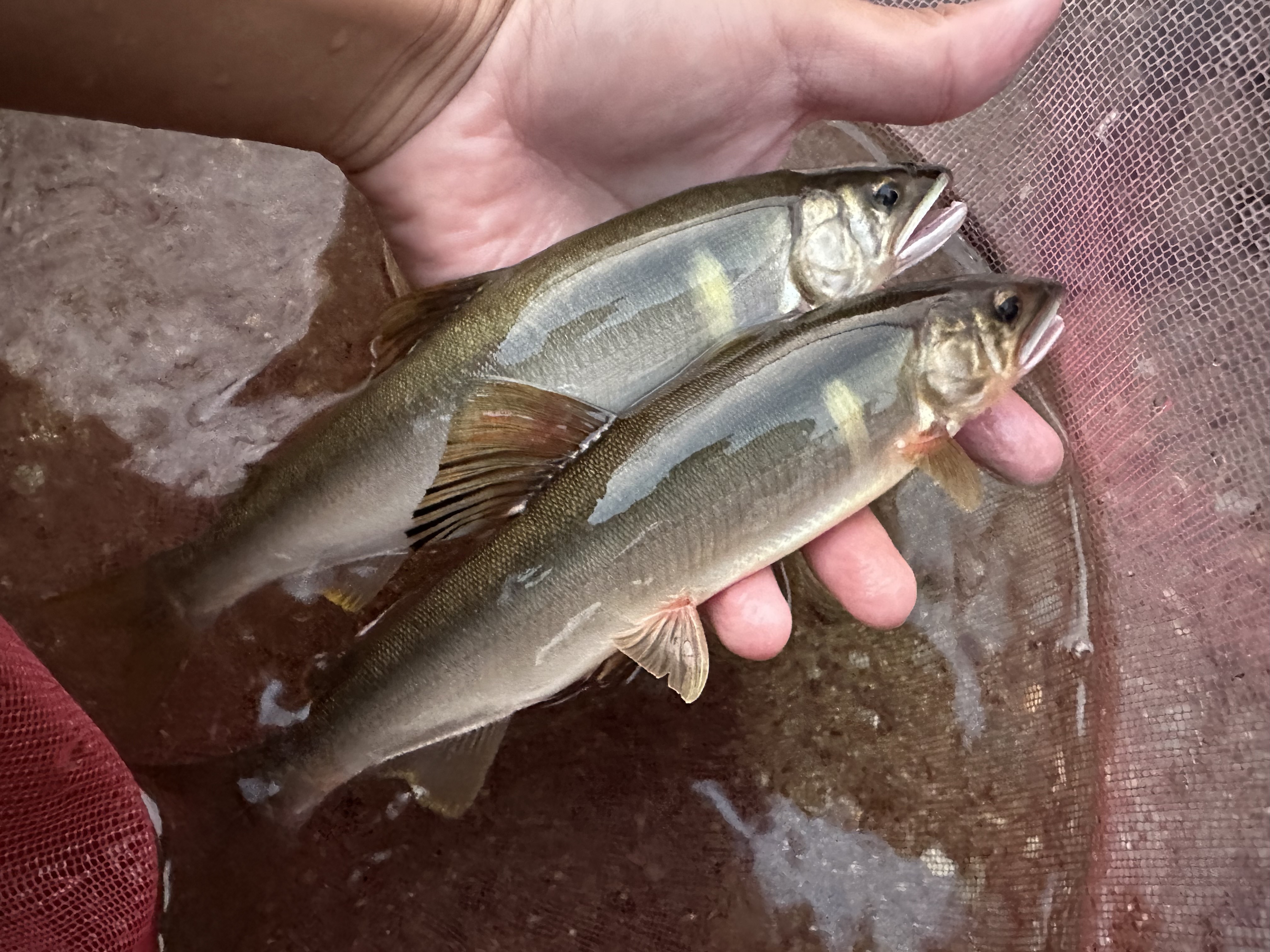 2025.08.14 印刷する 岐阜遠征初日は益田川! 魚種 アユ/鮎 サイズ 最大23.5cm 釣り方 友釣り 場所 岐阜県 天候 雨のち晴れ スタッフ 山上知哉 店舗 大津店 釣行日 2025.08.07 コメント こんにちは!ブンブン大津店の山上です。 8月7日、岐阜店の青山店長と益田川へ友釣りに行ってきました。 朝方は雨が降っており、少し増水して期待できるかな?と思いながら向かいますが、益田川の方はあまり雨が降っておらず、ほぼ平水。 まずは最近25cmオーバーが釣れているというポイントからやっていきます。 トロ場でオトリを入れ替えて、天然で瀬の中に入れる作戦でいきますが、中々掛からず、なくなくオモリを付けて瀬の中へ。 すると早速目印が吹っ飛んで、中々のサイズが! 23.5cmの良型でした!過去最高サイズで嬉しい1匹に! しかしそのポイントでは続かず、青山店長の実績ポイントへ。 昼スタートだったのでポイントに着いたらもう夕方。 天然のオトリでどんどん瀬の中をやっていくと、ポロポロと良型が掛かってくれました。 青山店長はほぼ入れ掛かりで、1時間少々で10匹以上掛けてました。しかもほとんど23〜24のサイズ。 腕の差を実感した時間となりました! もっと大きい鮎を求めて、練習していきます。 使用した釣具 竿 [ダイワ]銀影エアショートリミテッドMT87M 水中糸 アーマード0.1号 針 一角3本錨8.0号