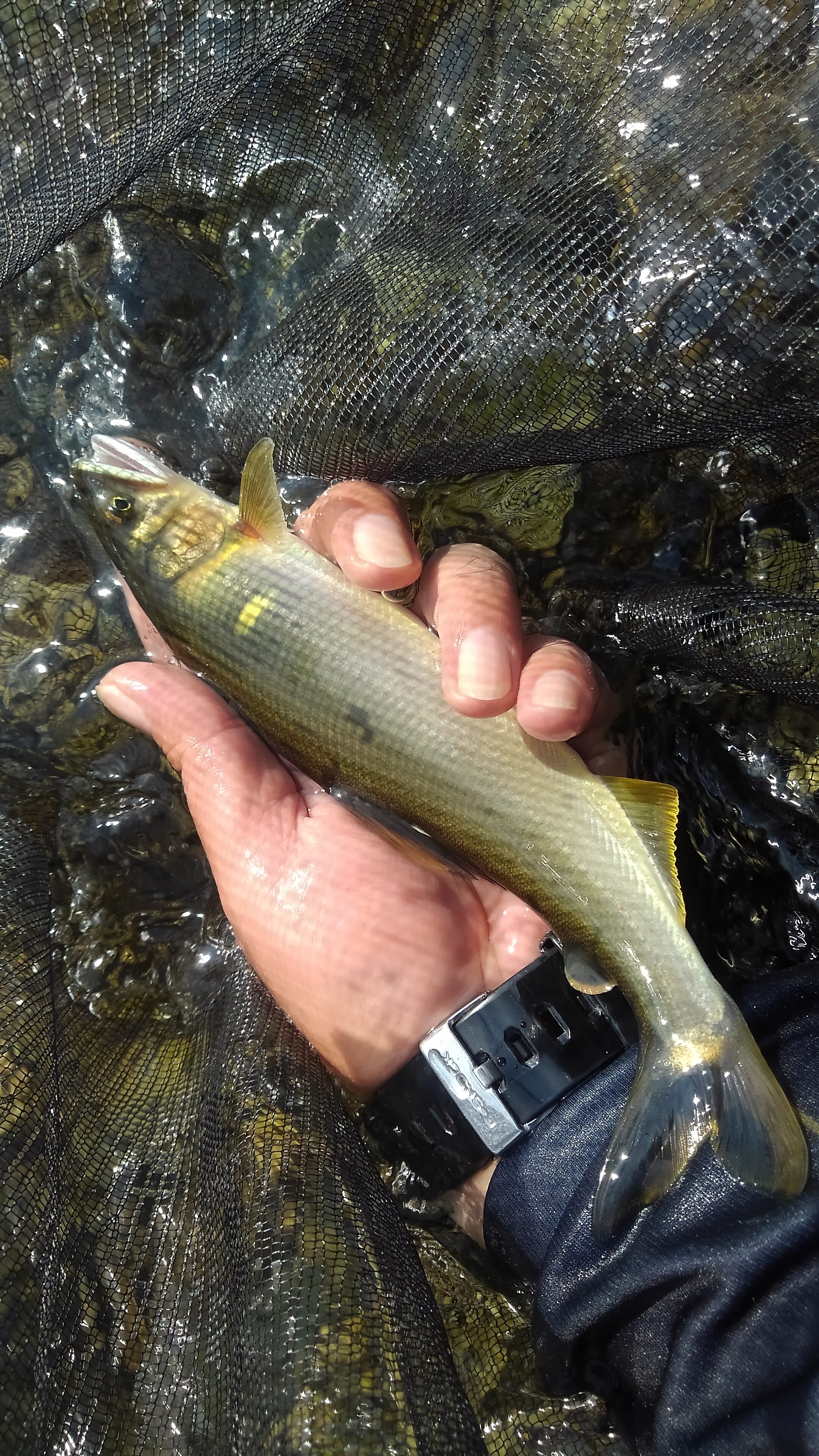 前々回くらい前に入ったポイントより少し上流側へ入りました。良さそうな流れに入れていきますが、反応なくどんどん下って行くと強めの瀬にたどり着いたので、オモリ打って瀬に入れて行きます。少しづつ引いて行くとガツーン!やはり鮎は強いところに入ってました。とりあえず22センチ。オトリ変わってここから、ポツポツ掛かり出しますが、5つほど獲った後反応なくなったので、さらに下に移動して荒瀬に突入するも、全く反応なし。しんどいですが、再び元の場所まで上がったところで一旦休憩。