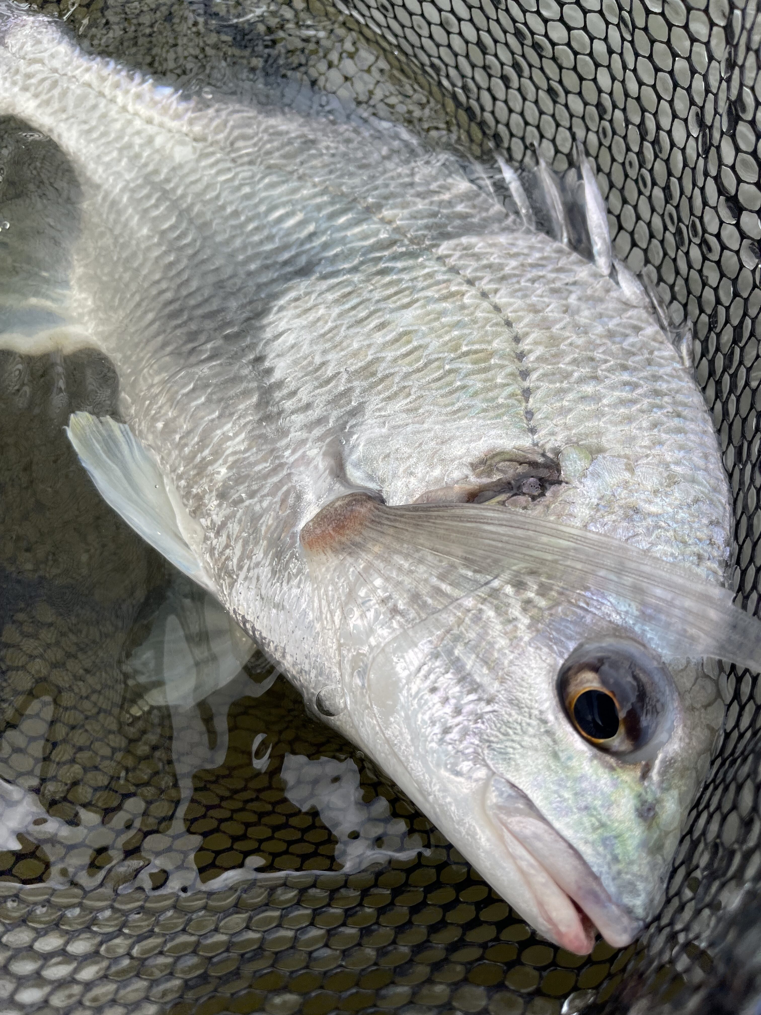 2025.08.14 印刷する 藤本釣行便チニング編in多摩川 魚種 クロダイ/チヌ サイズ 30~40 数 キビレ、黒鯛 計8匹 釣り方 ☆チニング 場所 東京都 神奈川県 天候 はれ スタッフ 藤本教弥 店舗 埼玉狭山店 釣行日 2025.08.07 コメント こんにちは! 狭山店スタッフ藤本です! 今回は川崎大師店スタッフの吉村と多摩川にチニングに行ってきました! 流石に夏のウェーディングはポイントに着くまでに既に汗だくです💦 最初トップで狙ったのですが、 水の色的に出ない感じだったのでボトム攻めに変更。 いつも通り10gフリーリグを投げます。 この日当たりがなかなか出ず、牡蠣瀬付近でようやく当たりがありました! ただ巻ではあまり反応なく、スイミングでの止めのタイミングでの当たりが多かったです! 凄くスローでしたが、最強ワームのアーバンホグはやっぱり釣れます🎣 基本キビレばかりですが、牡蠣瀬を狙うと黒鯛も混じりました🦪 この日連発することは無かったですが何とか8本釣ることが出来ました! やっぱりチニング最高👍 使用した釣具 竿 シルベラード リール アルファス