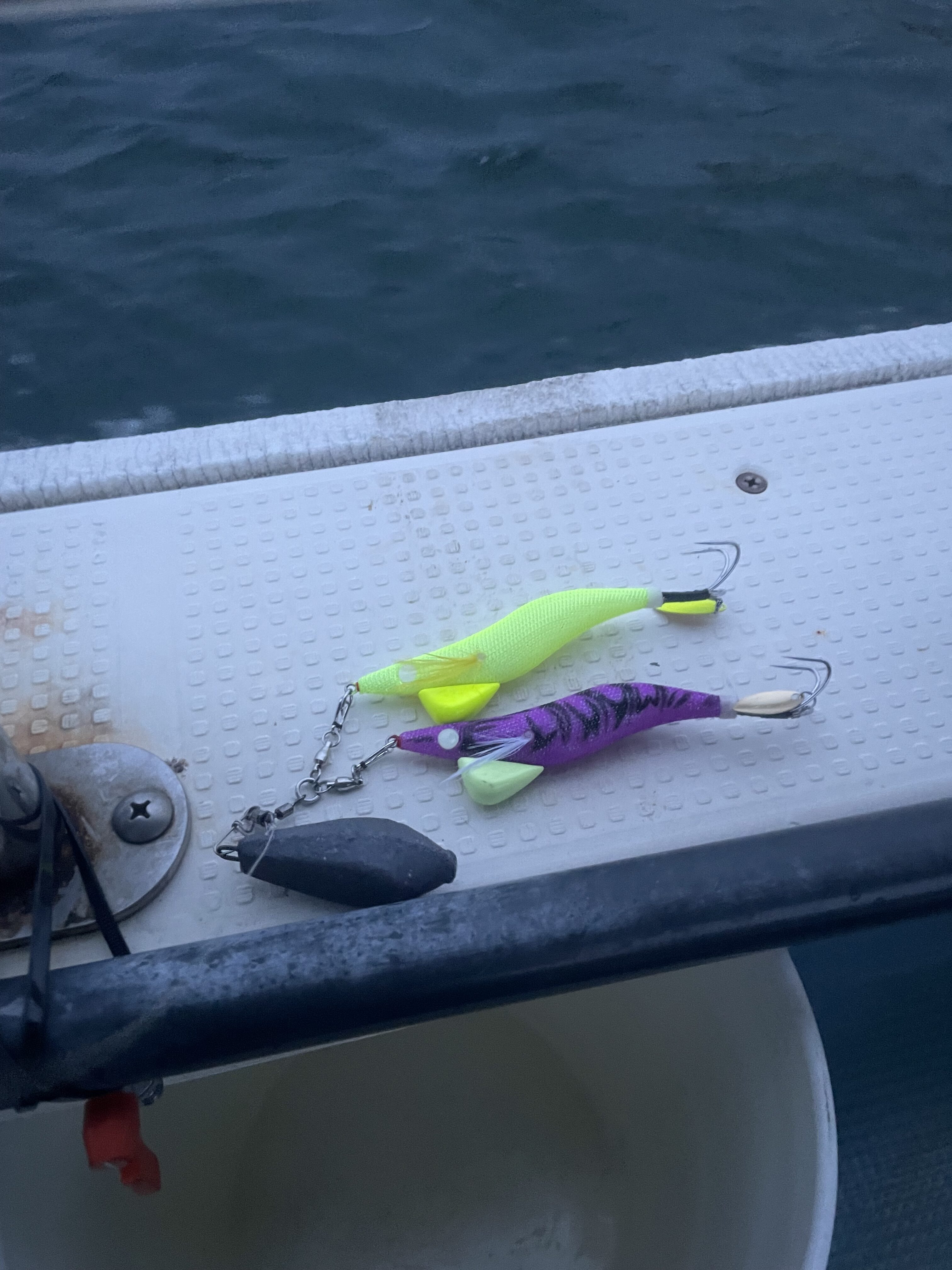 しなし、1流し目で船内1杯目が上がり、期待できるか?と一瞬思いましたが甘かったようでなかなか次の1杯が出ません。カラーローテーションを繰り返し、エギ、スッテを変えてみたりと試しますがこれと言った反応なし😭