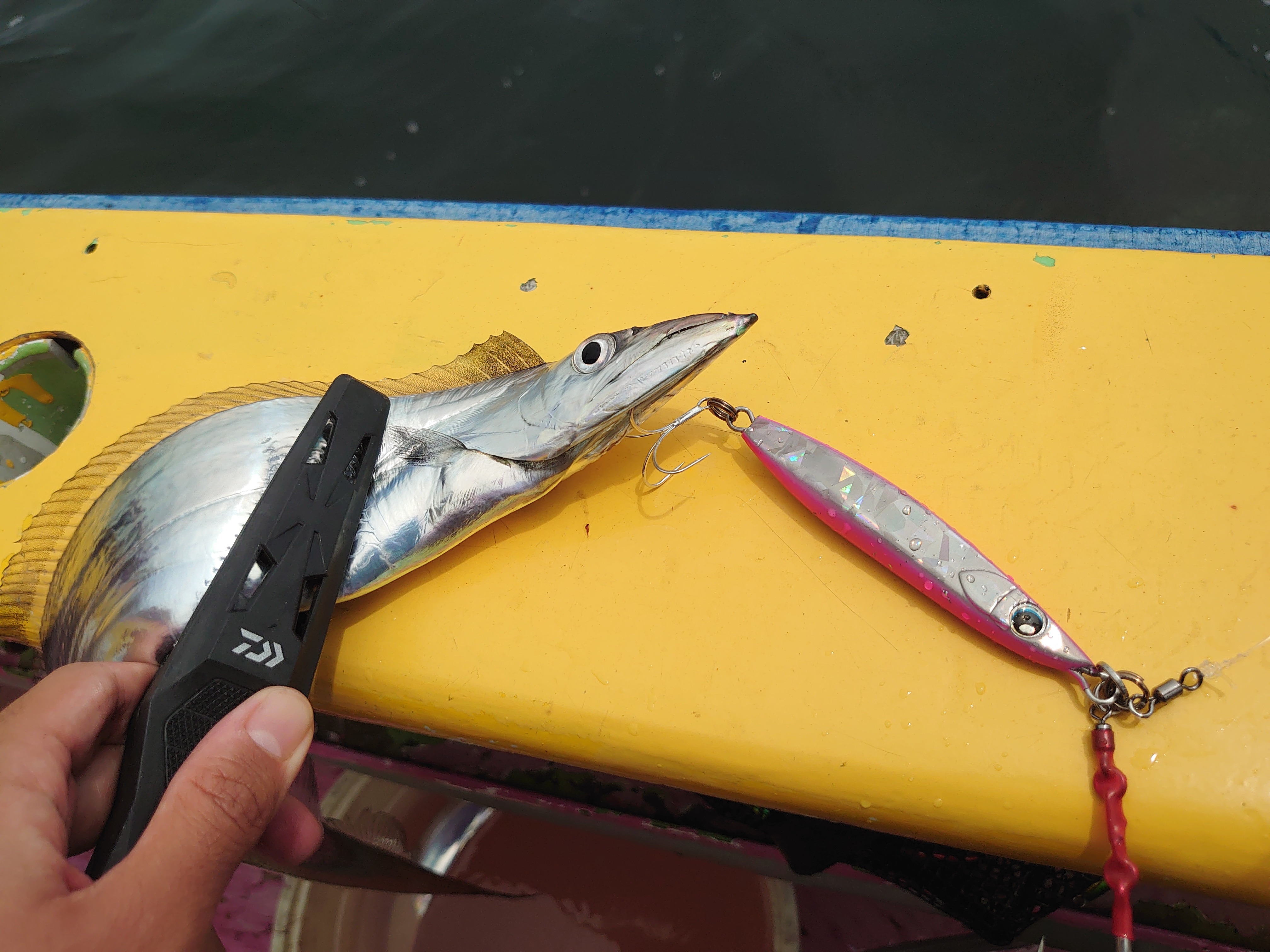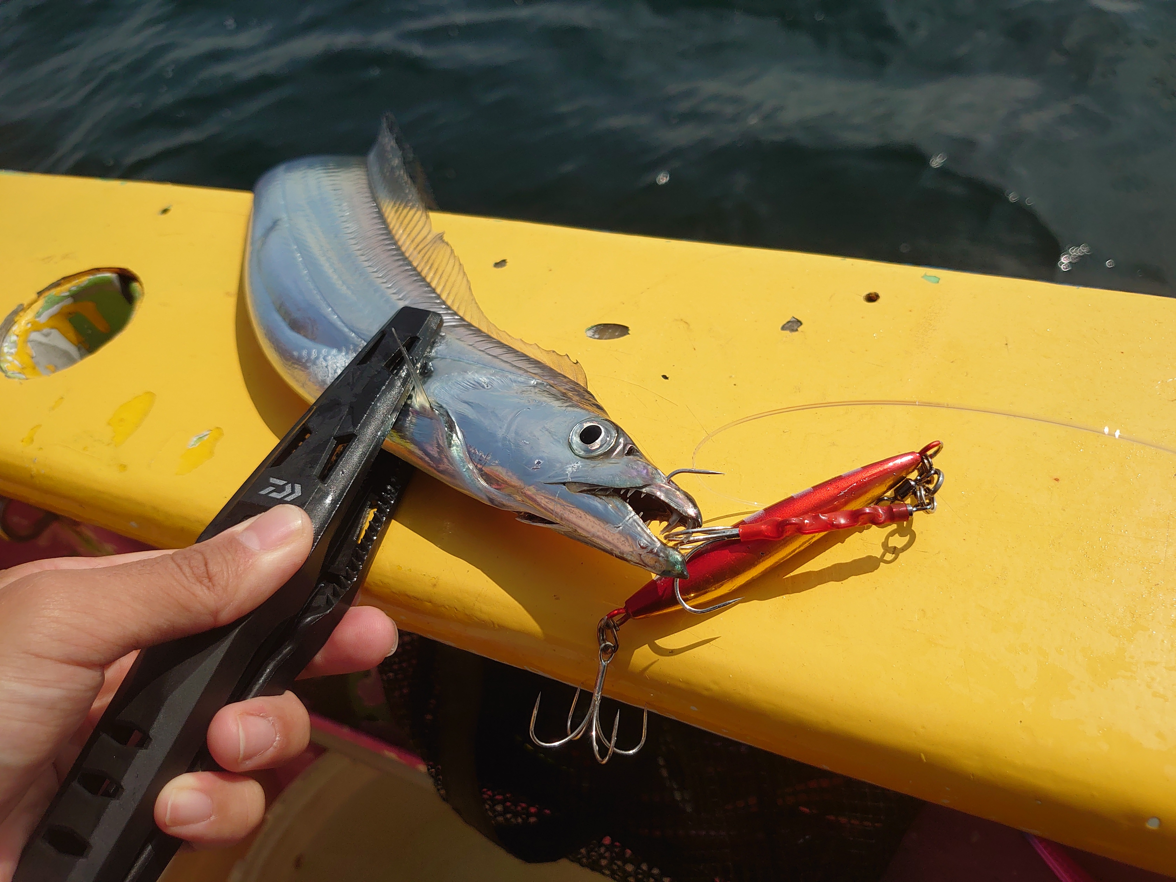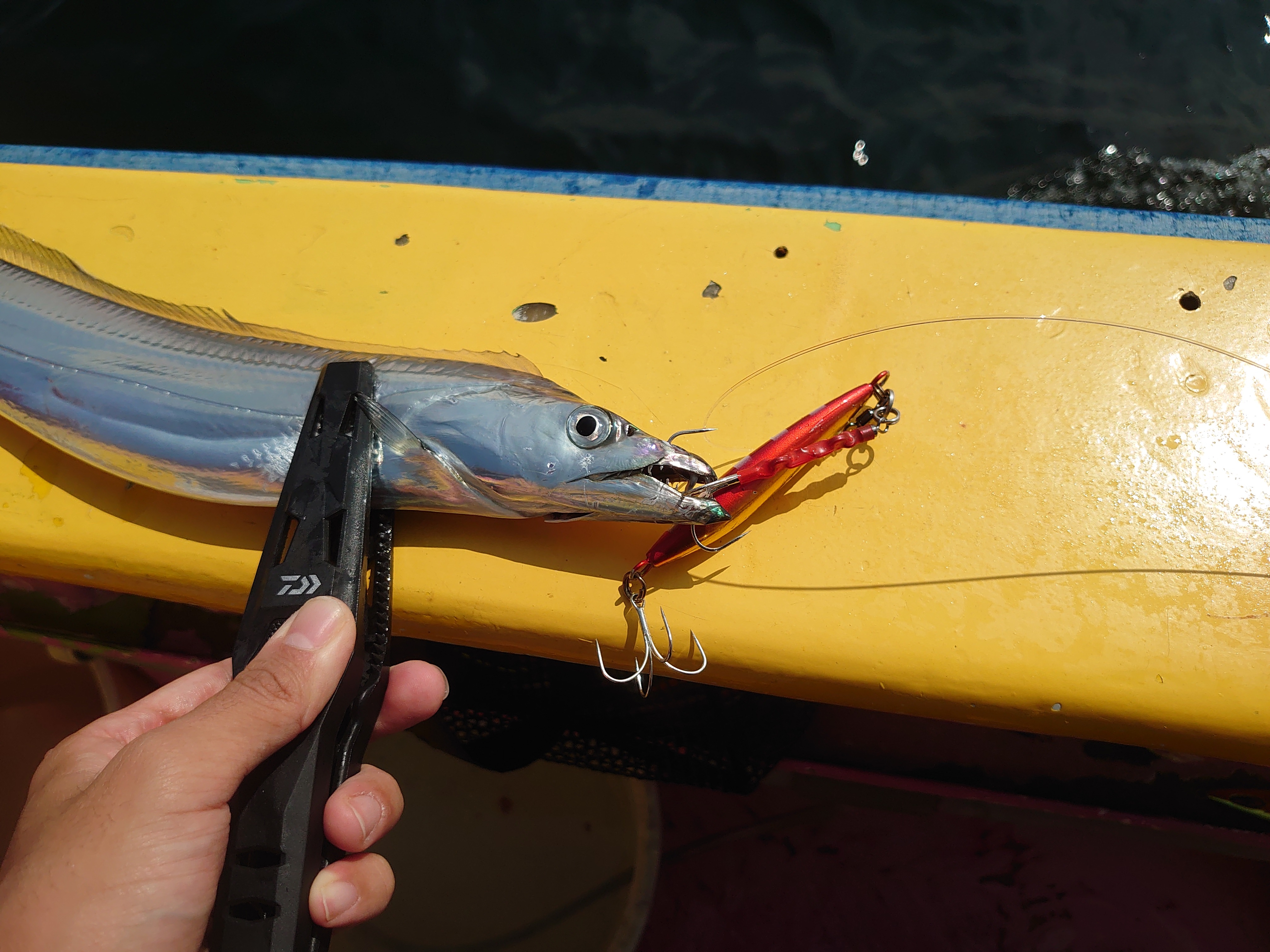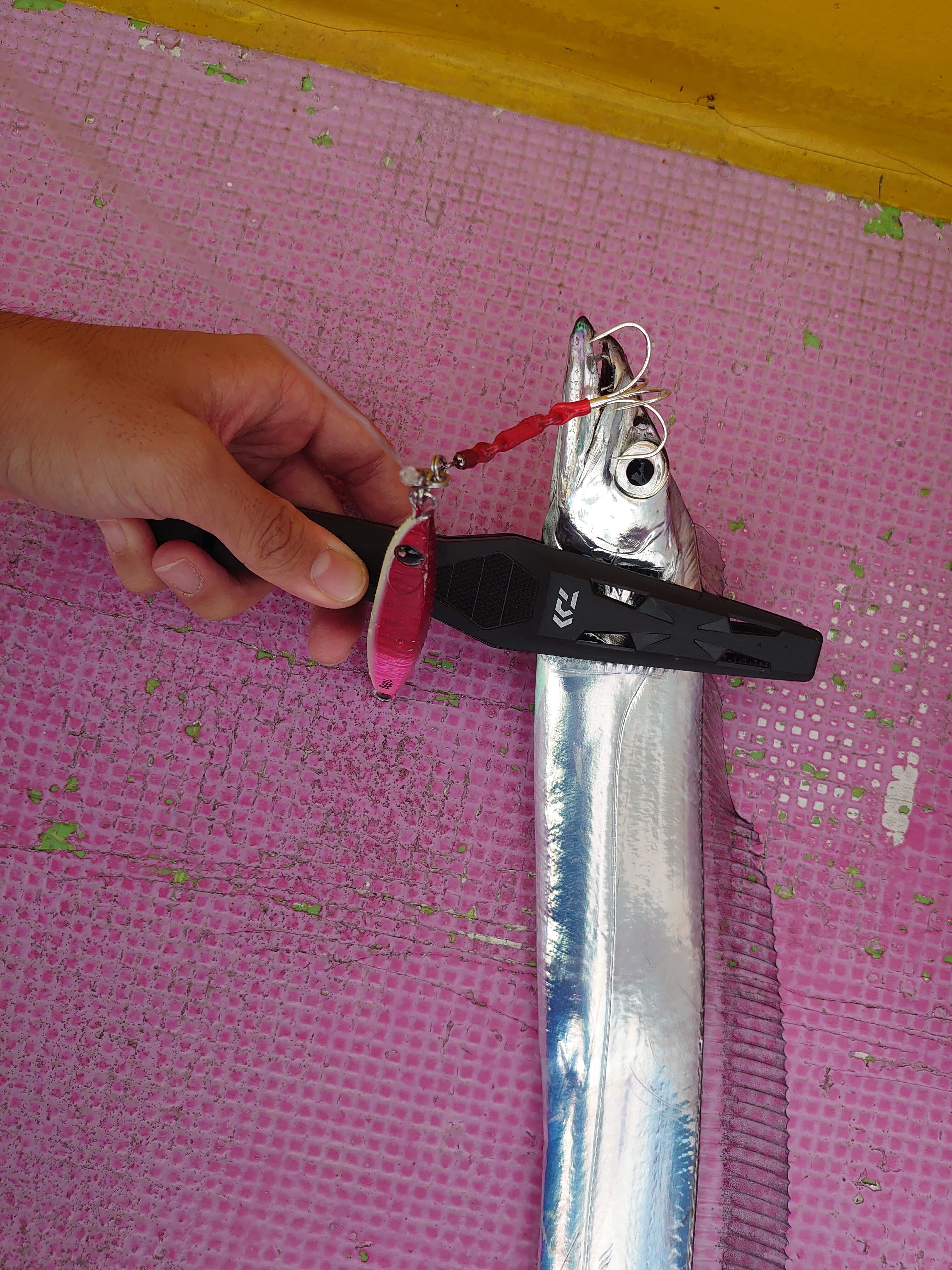 ポイントも変えて、13時くらいにあるカラーが無双状態に!左右の人も同行者もそのカラーで立て続けにヒット!スタッフ一橋は持ってなかったのでどうにかこうにかラスト10分で追加タチウオが釣れ、7匹で終了となりました。