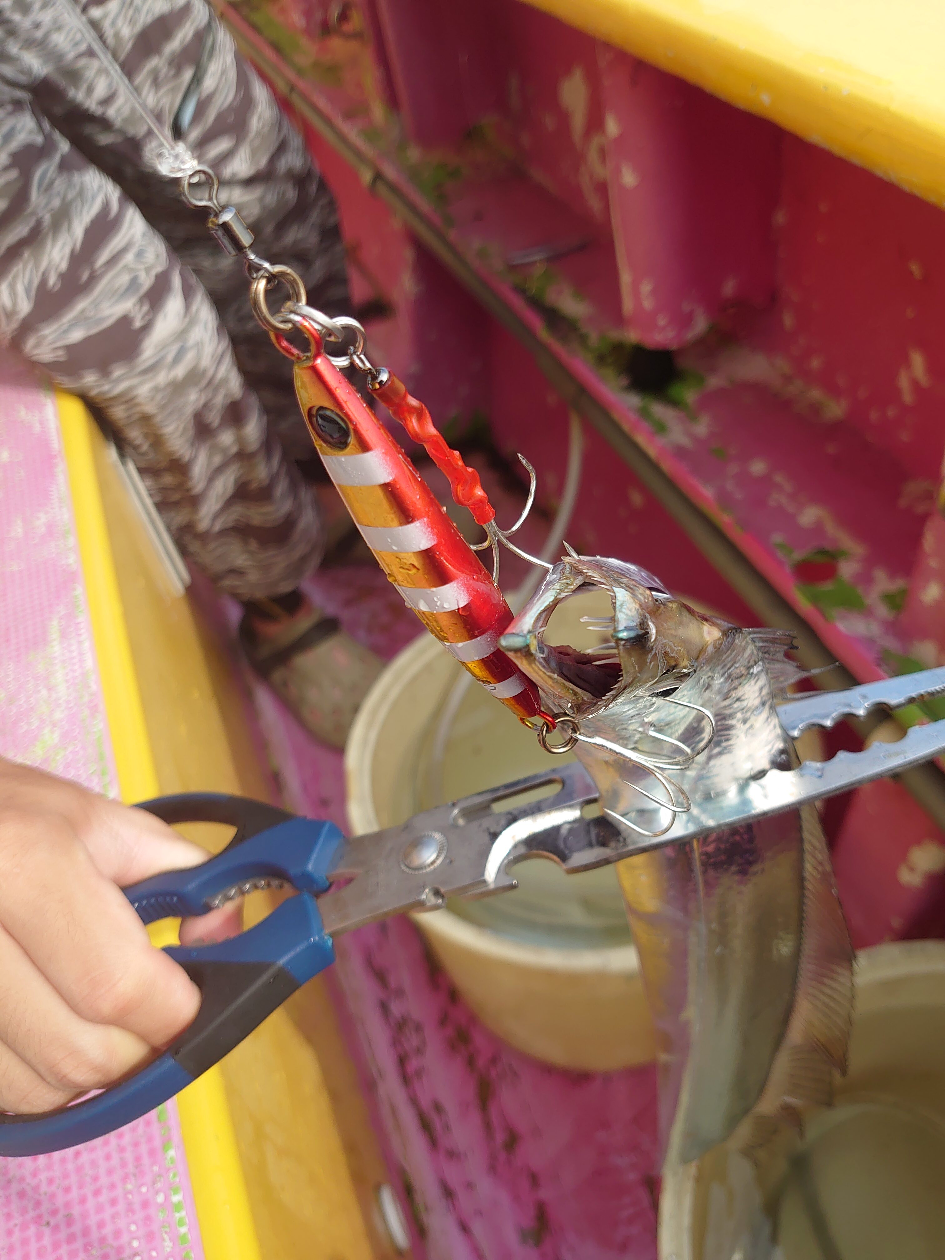 7時頃に出船し、8時くらいにポイント到着!既に大船団となっている中スタートです!朝方は曇っていたため、赤金グローを投入!50mくらいのボトムを取ってフワフワさせながら巻いて来ると早々にヒット!今回は幸先良さそうです。