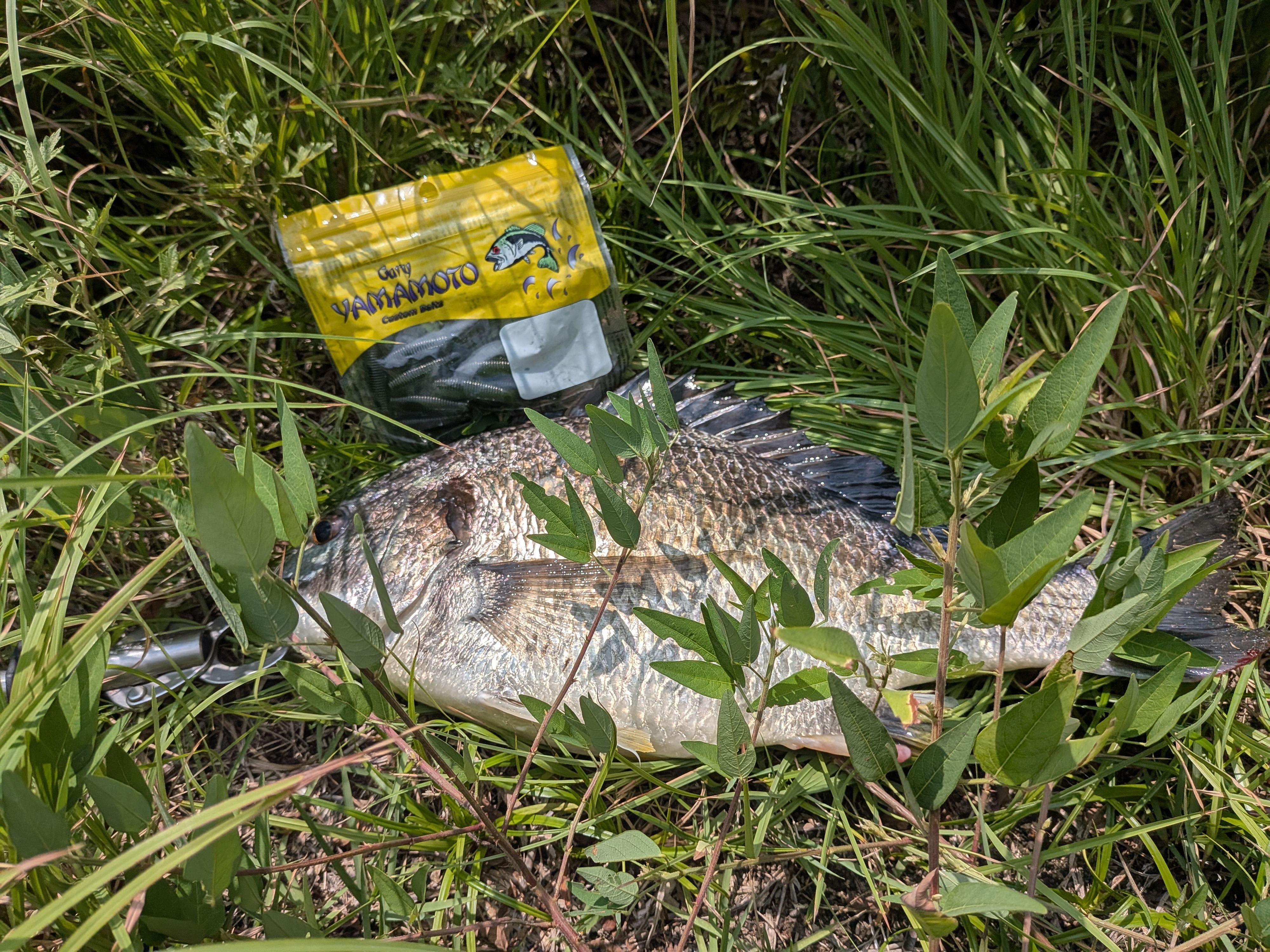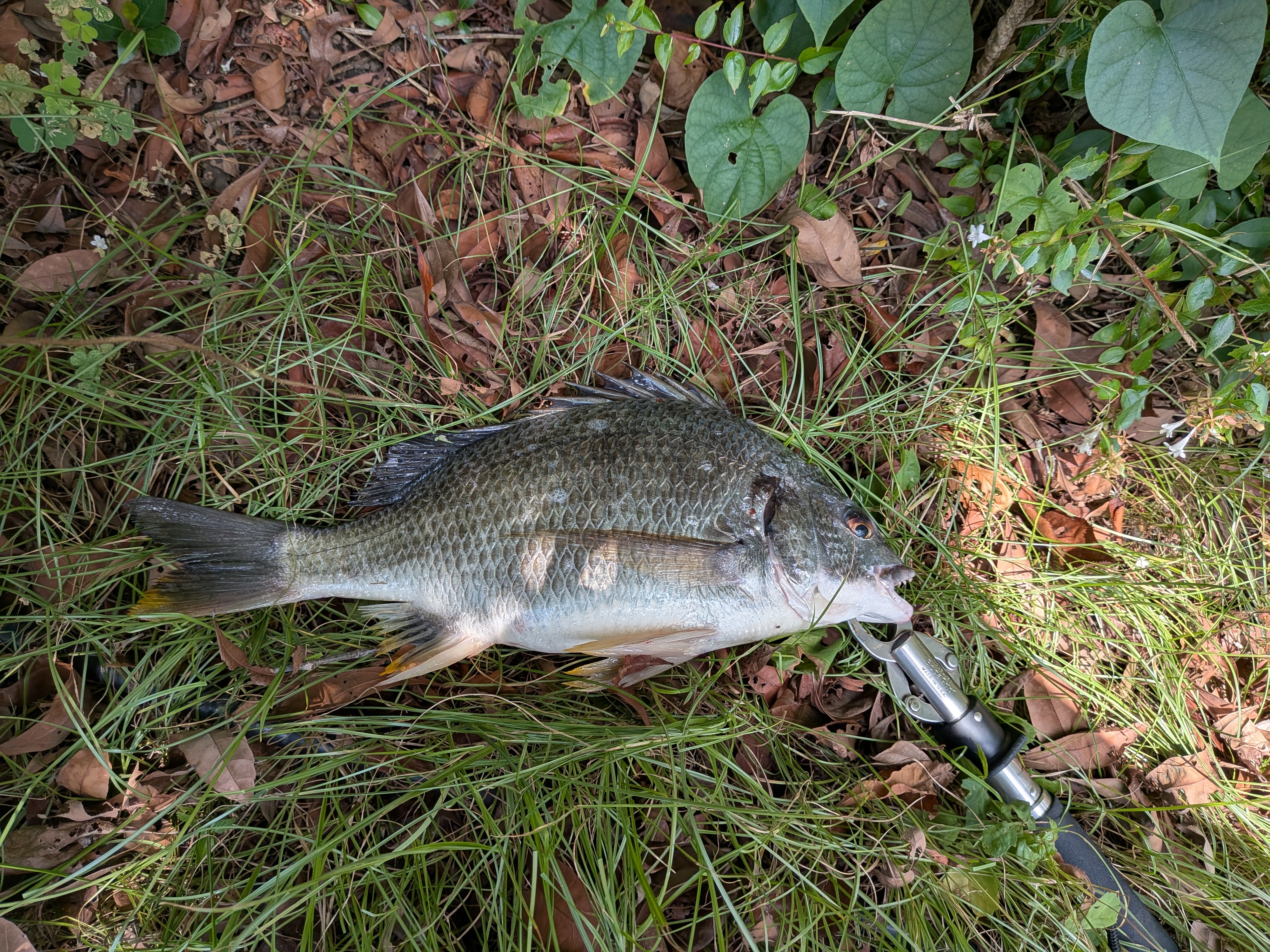 その後一旦昼ごはん休憩を取るとゲリラ豪雨。雨が止んだあともう一度釣りをすると、アタリ乏しく30センチくらいを1匹追加しただけでした。