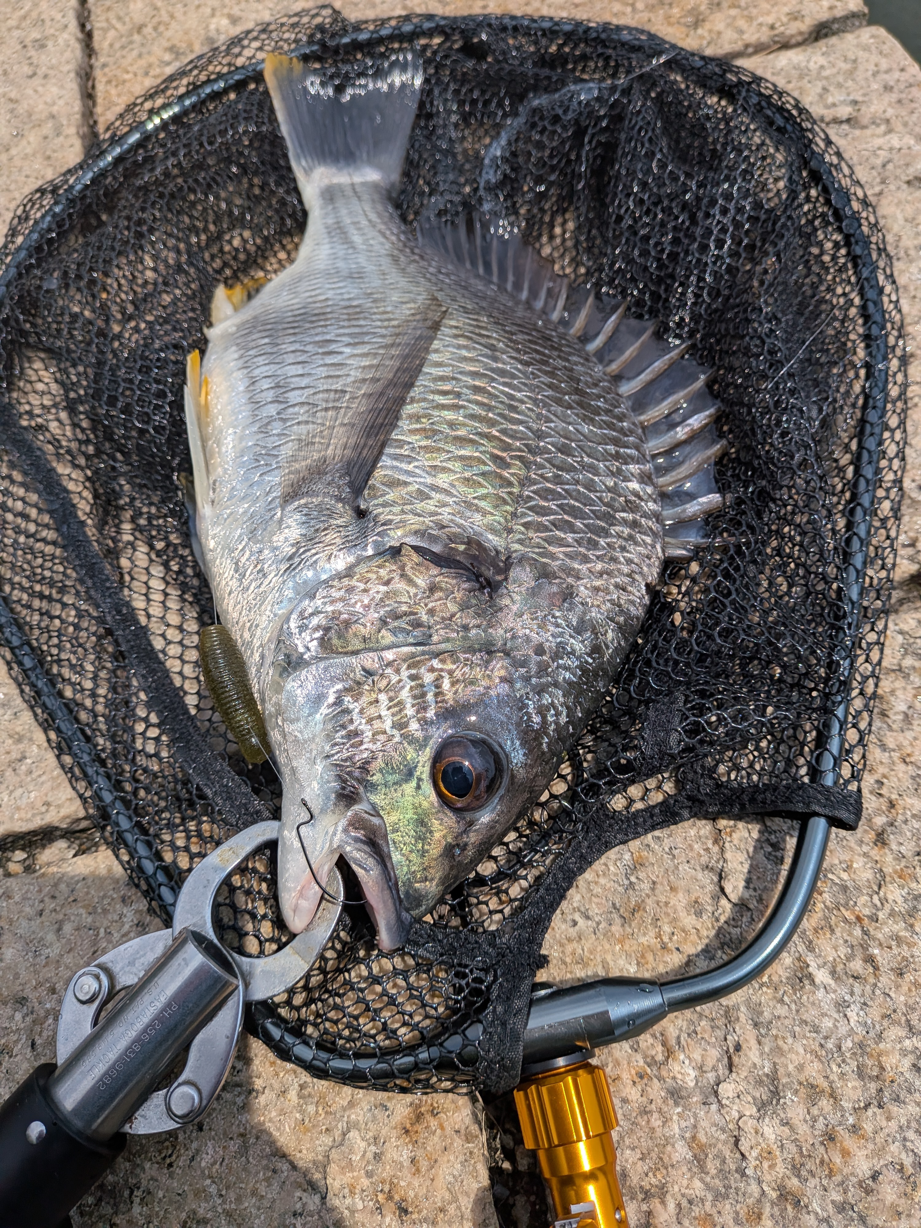 2025.08.18 印刷する 大阪湾岸チニング8月15日 魚種 クロダイ/チヌ サイズ 40〜45センチ 数 キビレ1時間で7枚 釣り方 ☆チニング 場所 兵庫県 スタッフ 厨 宏樹 店舗 関西 西昆陽店 釣行日 2025.08.15 コメント こんにちは。西昆陽店の厨(くりや)です。 久しぶり?にチニングへいってきました。 いつものポイント、風がなく満潮で潮位が高く、濁りも入って条件は最高です。 この良い条件のなか、キビレ40センチオーバーの時速記録更新を狙いたいと思います! 今までの最高記録は1時間単位ではわかりませんが、2時間半で11匹プラス小型1匹で12匹でしたので、時速5匹計算とします。 なので今回はぴったり1時間で6匹以上の40オーバーキビレを狙います! メジャーを忘れてきたのでサイズはすべて目測です。 開始20分で3匹をキャッチ! さらに2匹もなんなくキャッチ! 時速記録更新は楽勝かと思ったら最後の1匹が遠い。 ようやくアタリをかけて目標達成かと思ったら30センチ。 1時間経過まで残り5分ほど。ようやく本日最大サイズが来てくれました! 時速記録を更新!1時間で6匹の40センチオーバーキャッチ!小型は1匹!10分に1匹ペースでした。 やはり条件が良いときにこればいつでも爆釣!すべてイモ40での釣果です。 その後一旦昼ごはん休憩を取るとゲリラ豪雨。雨が止んだあともう一度釣りをすると、アタリ乏しく30センチくらいを1匹追加しただけでした。 使用した釣具 竿 ブルーカレント82B リール SLX BFS XG左 道糸 PEライン0.6号 ショックリーダー フロロライン1.5号 ルアー イモ40