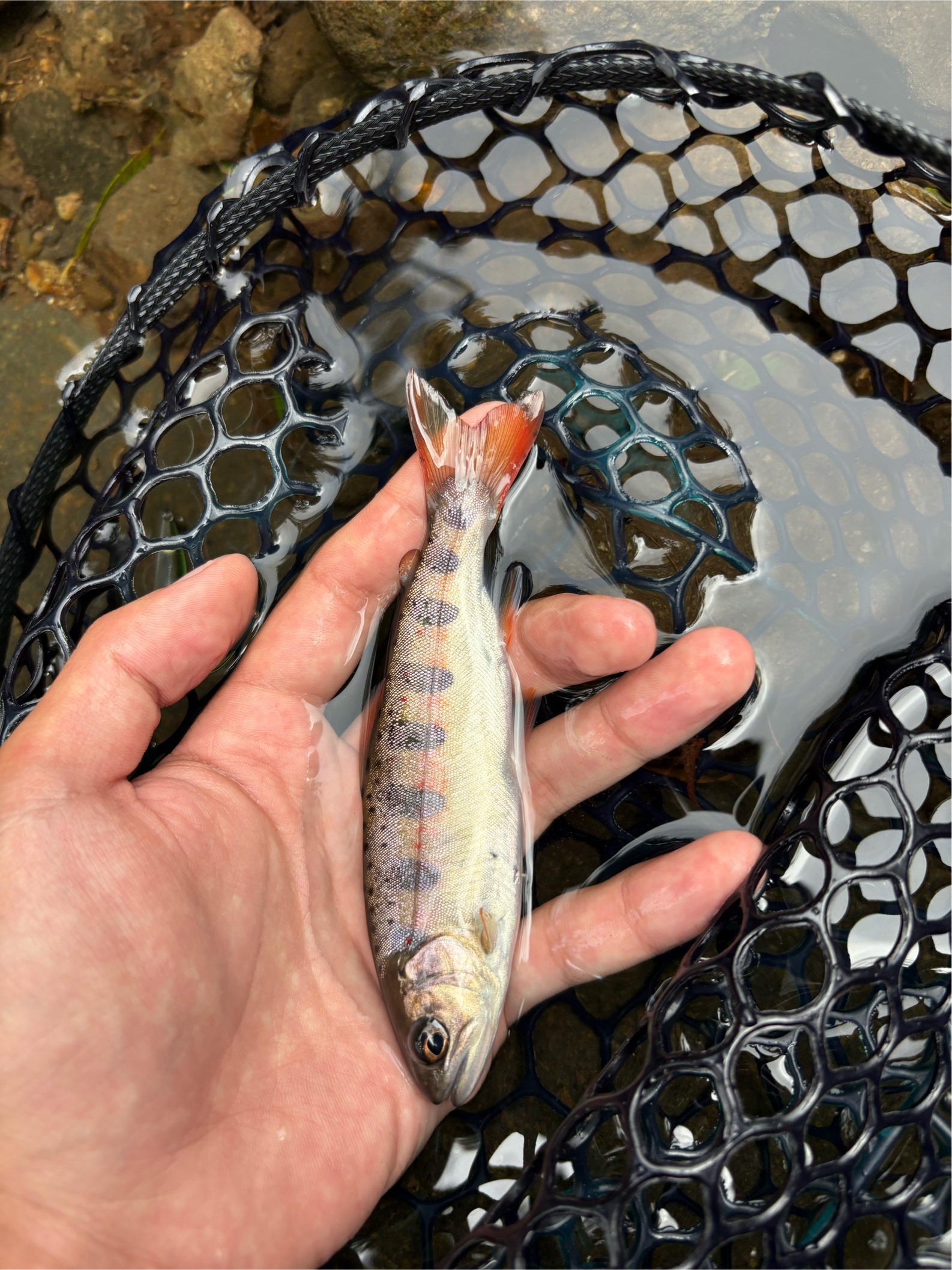 今日釣れたアマゴは尾鰭両端の赤が強く、各鰭先端の白がはっきりしており、いつもの水系のヤマメとは違った雰囲気の魚で楽しめました。