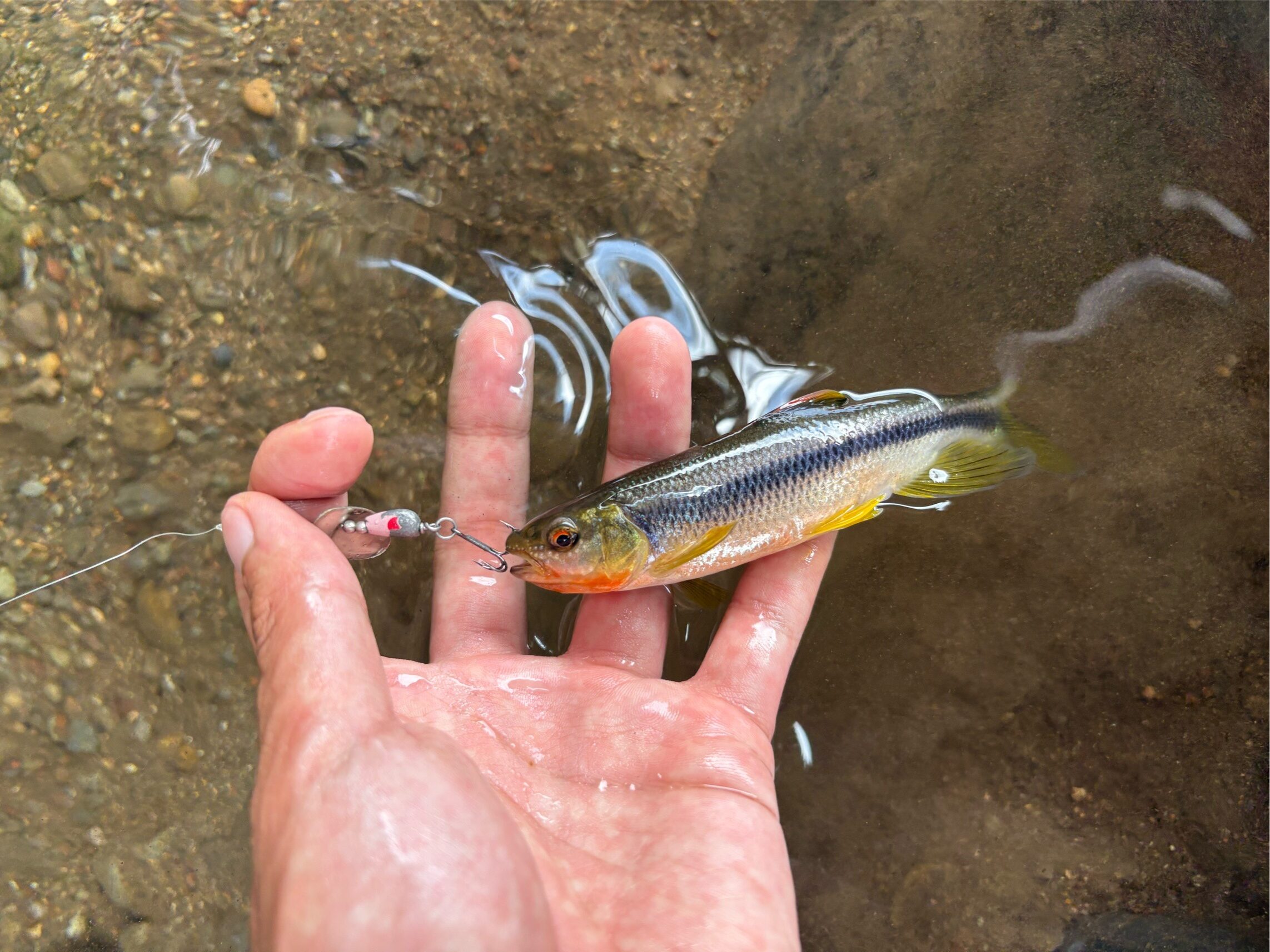 短時間やったところ、カワムツ2匹とタカハヤ、ボトムノックスイマーのダートに尺はありそうな魚(アマゴかわかりませんがトラウト系)のチェイスくらいでした。