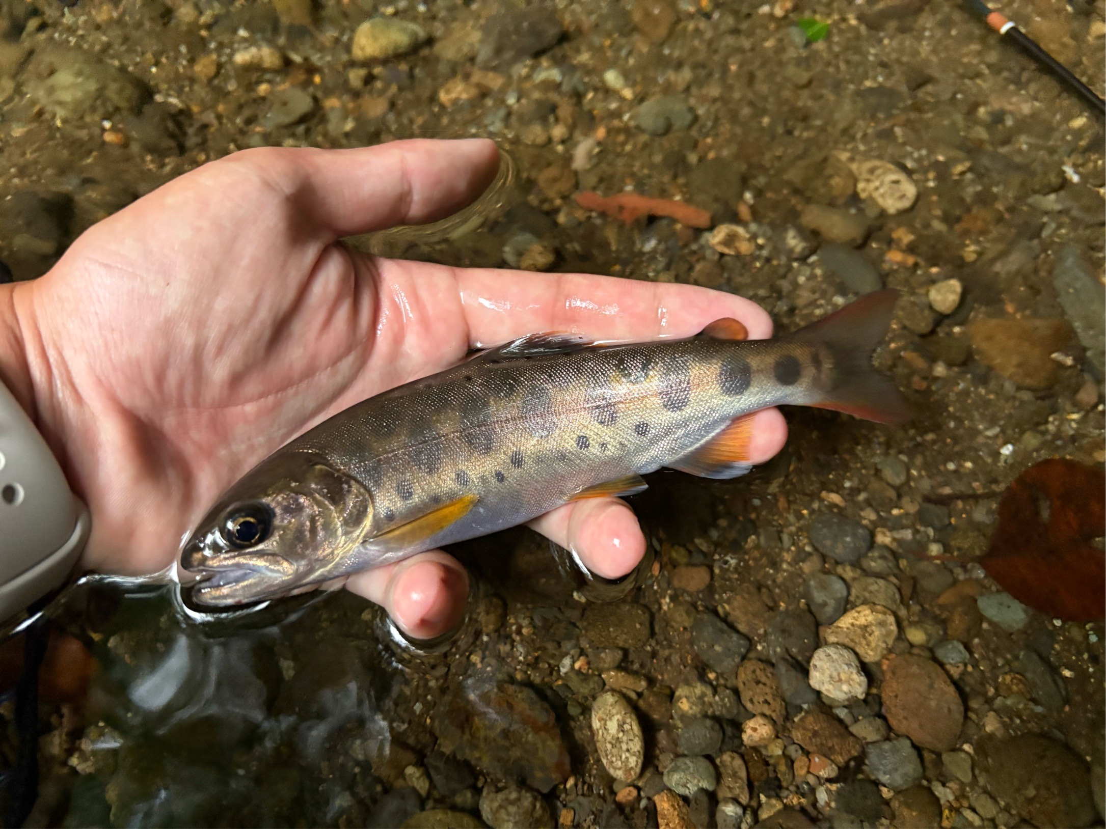 釣れた魚をみると朱点がないアマゴ? 水系、地域的にはアマゴの場所なのでたぶんアマゴです。 逆に朱点のあるヤマメもいるそうなので、見た目だけでは区別できないですね。
