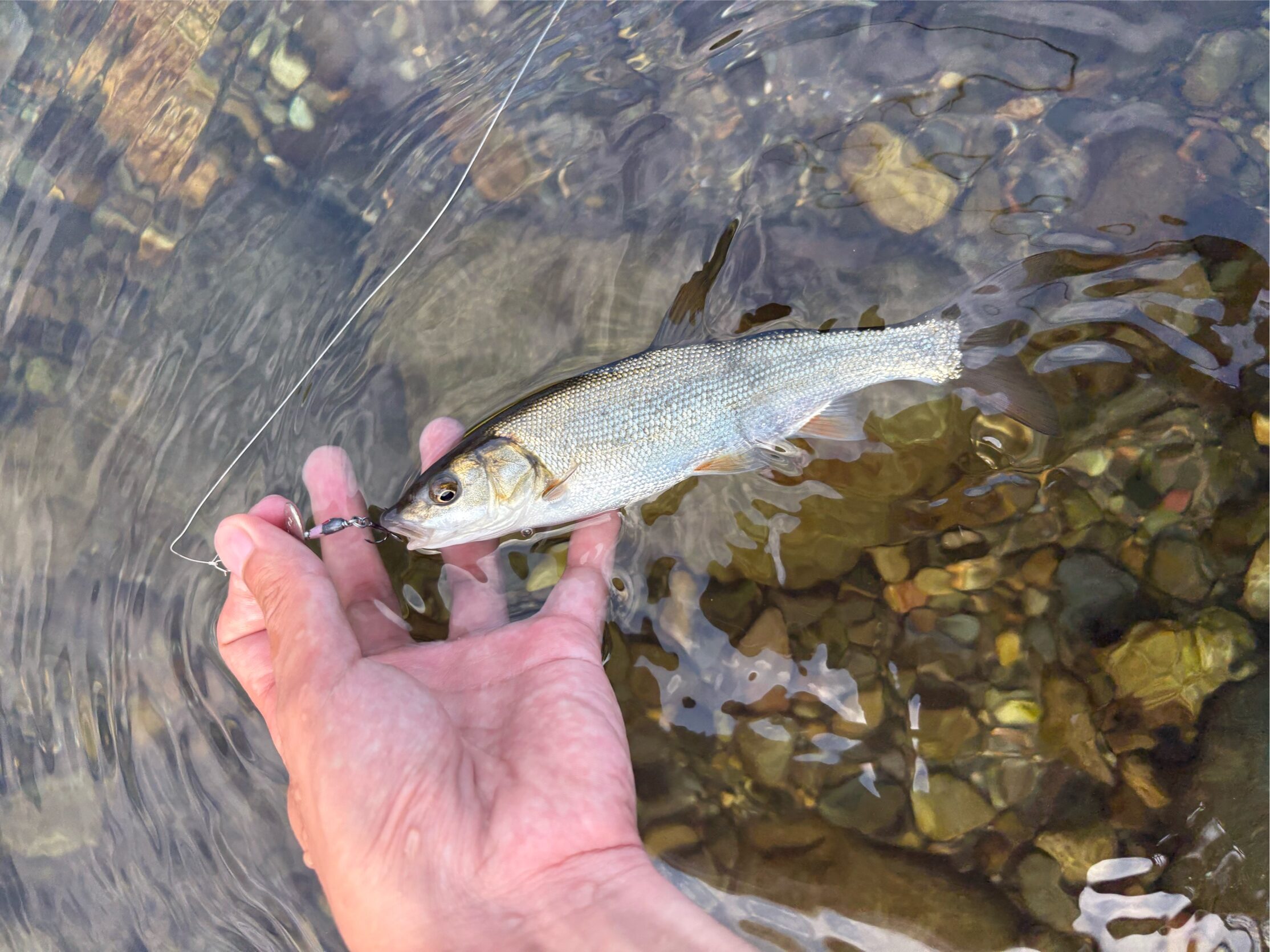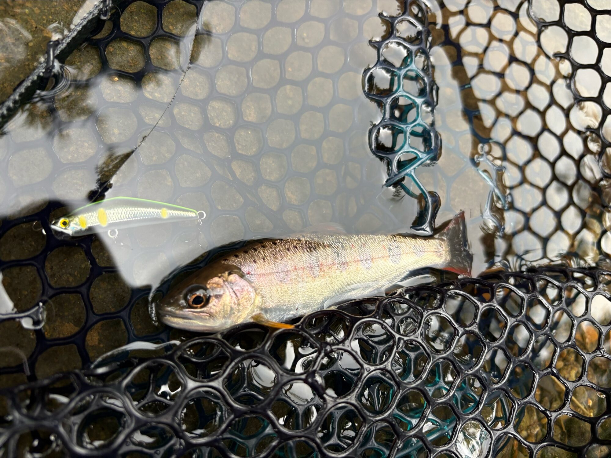 アップに投げ流れに同調させ巻いていると、突然巻きが止まりダッシュ、ゴンゴンとした引きで尺アマゴがきたのかと思ったものの、、、