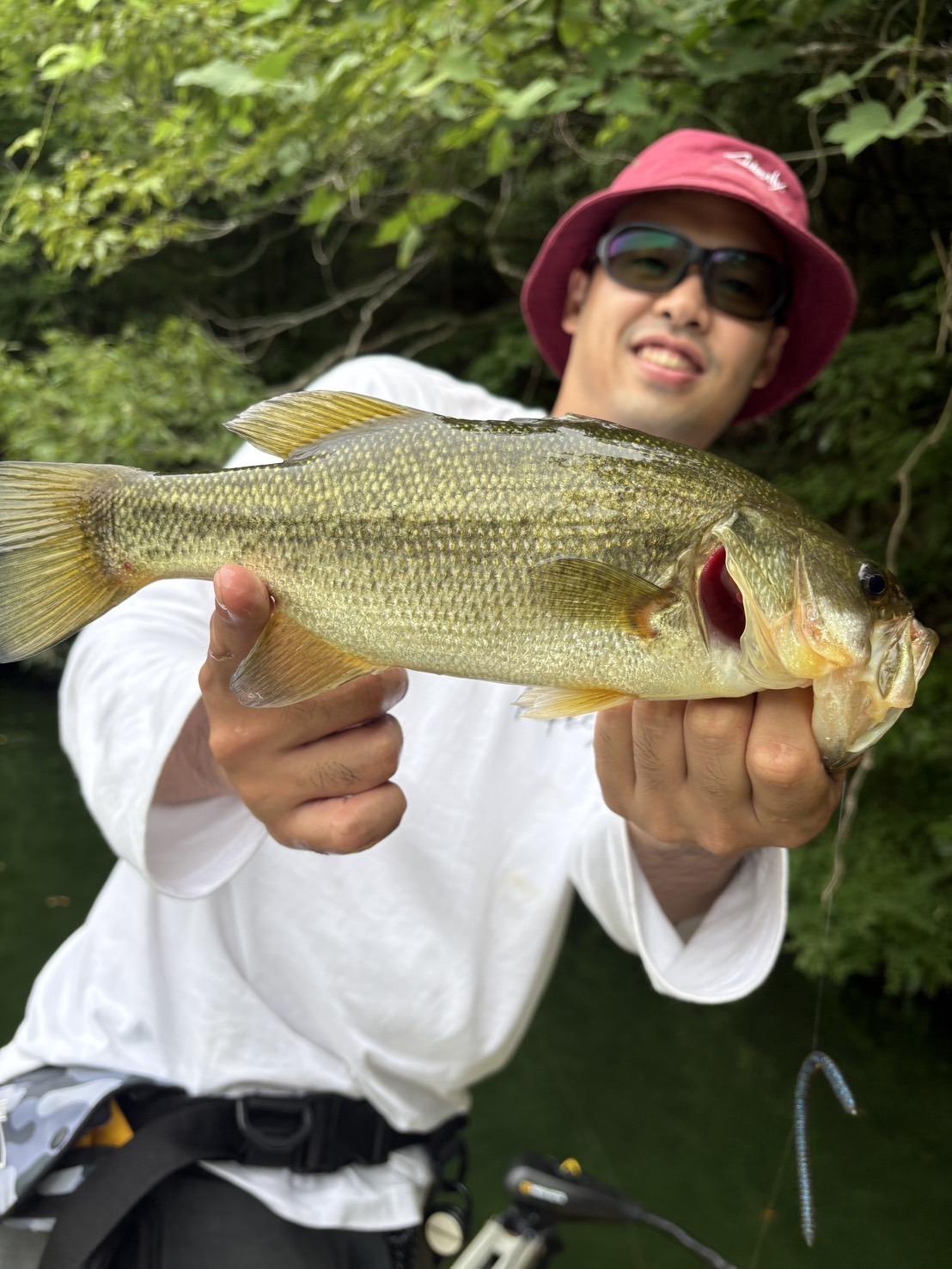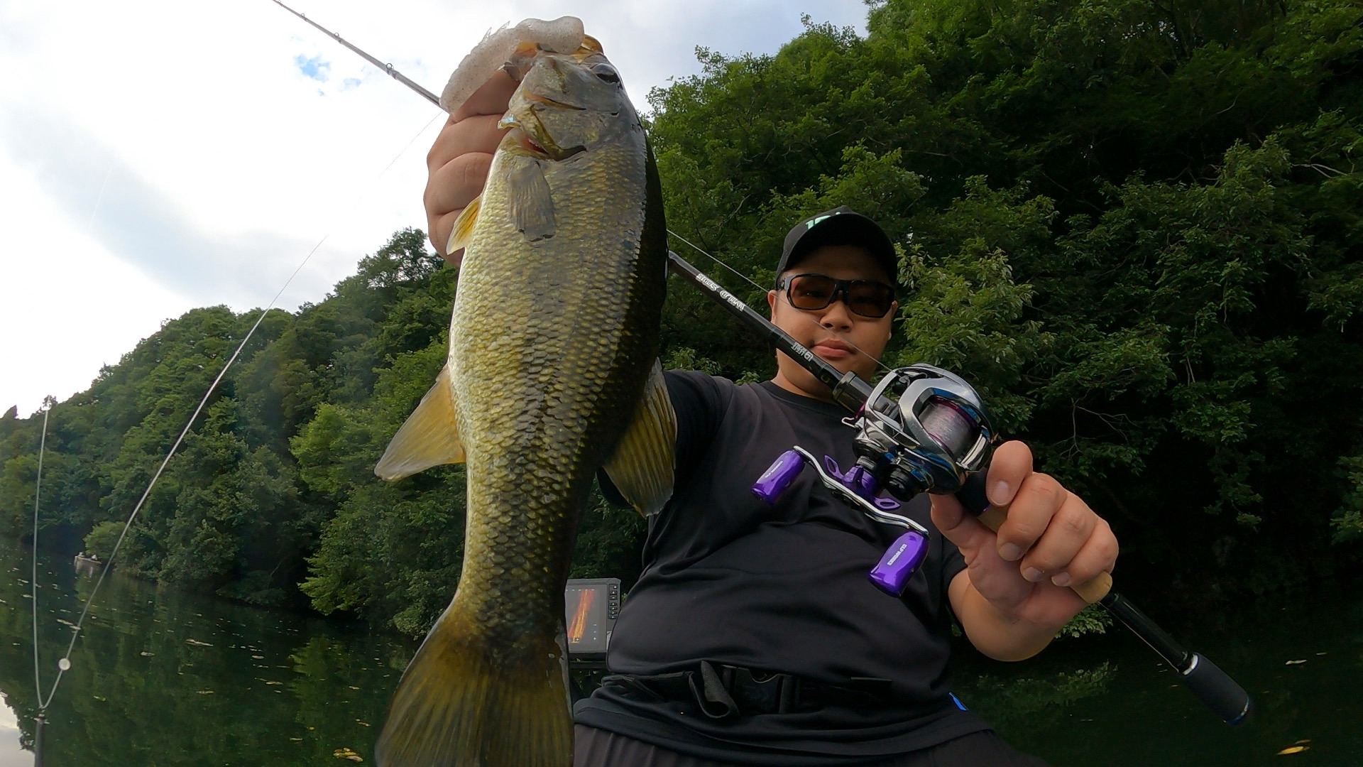 2025.08.19 印刷する 相模湖をガイドしてみたら 魚種 ブラックバス サイズ 30cm 数 ブラックバス 3匹 釣り方 ブラックバス(ボート) 場所 神奈川県 天候 曇り スタッフ 中谷光太郎 店舗 埼玉狭山店 釣行日 2025.08.12 コメント ブンブン狭山店の中谷です。 今回はお客様夫婦が相模湖で釣りしてみたいとの事でしたのでスタッフ安藤と一緒にバックシートに2人を乗せて相模湖をガイドしてきました! 前情報でアオコがすごい事はわかっていたので少しでもアオコがマシなところや下の水は綺麗なところを探していきます。 とりあえず桂川を上っていって大曲を目指していきます。 とりあえず釣って貰いたいのでブレイバーⅡのフリーリグをひたすらに撃ち続けてもらうと早速1匹目ゲット! 1匹釣ってもらったのでとりあえず安心して自分も本格的に釣りを開始 ドライブビーバーの7gフリーリグで岩盤を撃ち続けます まあ、ビーバーのフリーリグは釣れますよね! この日はライブスコープは一応つけていますがほとんど使わずに岩盤をひたすら撃ち続けます。 そんな中、安藤艇は大曲のところでナイスバスをキャッチ ブルズホッグの7gフリーリグです。 フリーリグ釣れ過ぎですね! 針が飲まれてしまっていたので中谷が対処して蘇生し無事に帰っていってくれました。 その後、安藤もバスをキャッチ! 釣れてる個体が餌をしっかり食べていていい体高です。 その後、昼過ぎに秋山川に移動して上流にてビッグバスのサイトフィッシングにチャレンジ お客様の投げたブラーモに凄い勢いで近づき口を開けますが、お客様のところからはバスが見えておらずそのタイミングでジャークしてしまい口の中に入らず・・・ かなりいいサイズでしたが惜しかった。 悔しさ残りますがとりあえず全員安打できたのでよかったです。 それではまた! 使用した釣具 ロッド ワイルドサイド WSC-ST66MH リール スティーズリミテッドSVTW KTFカスタム