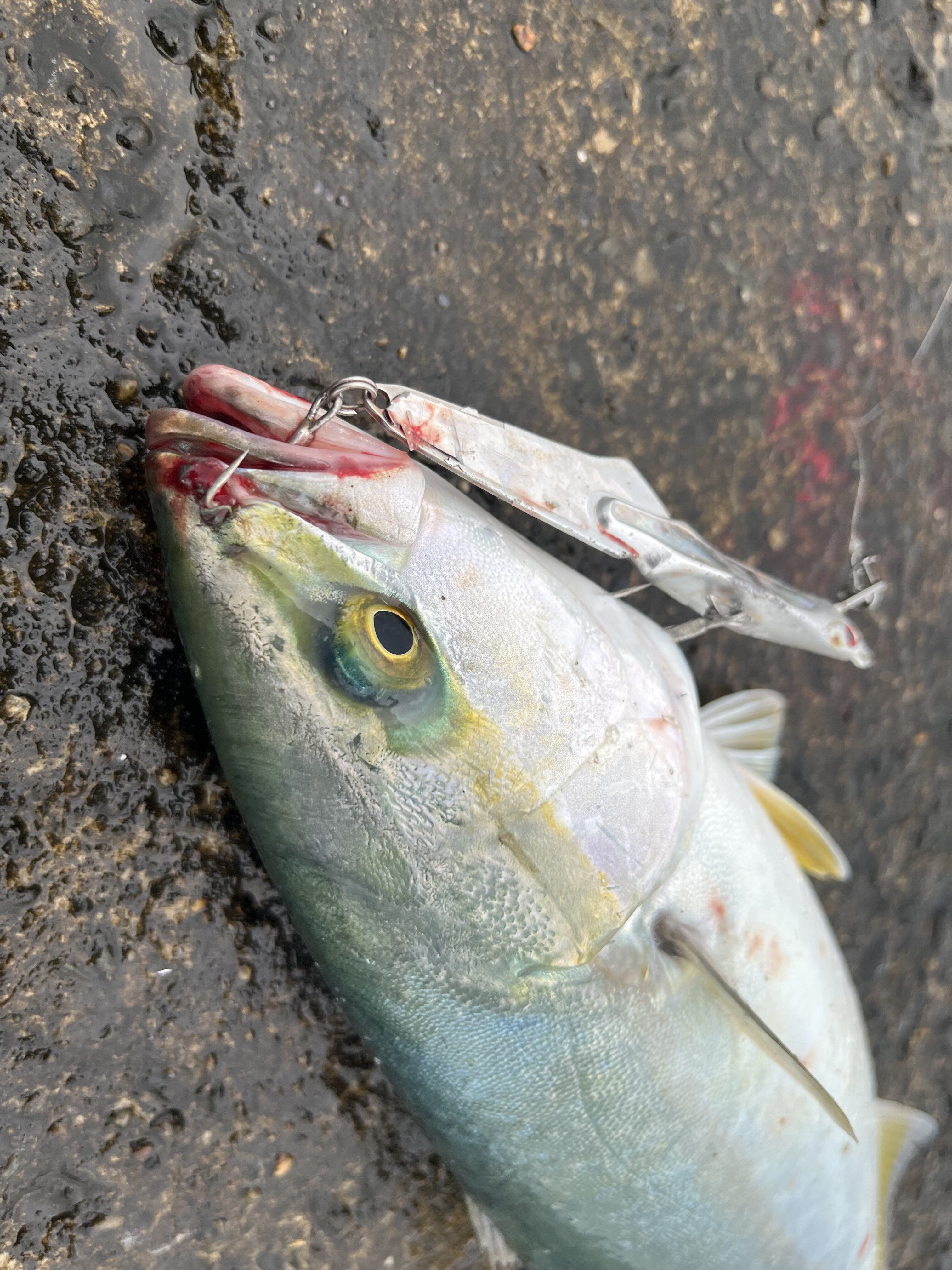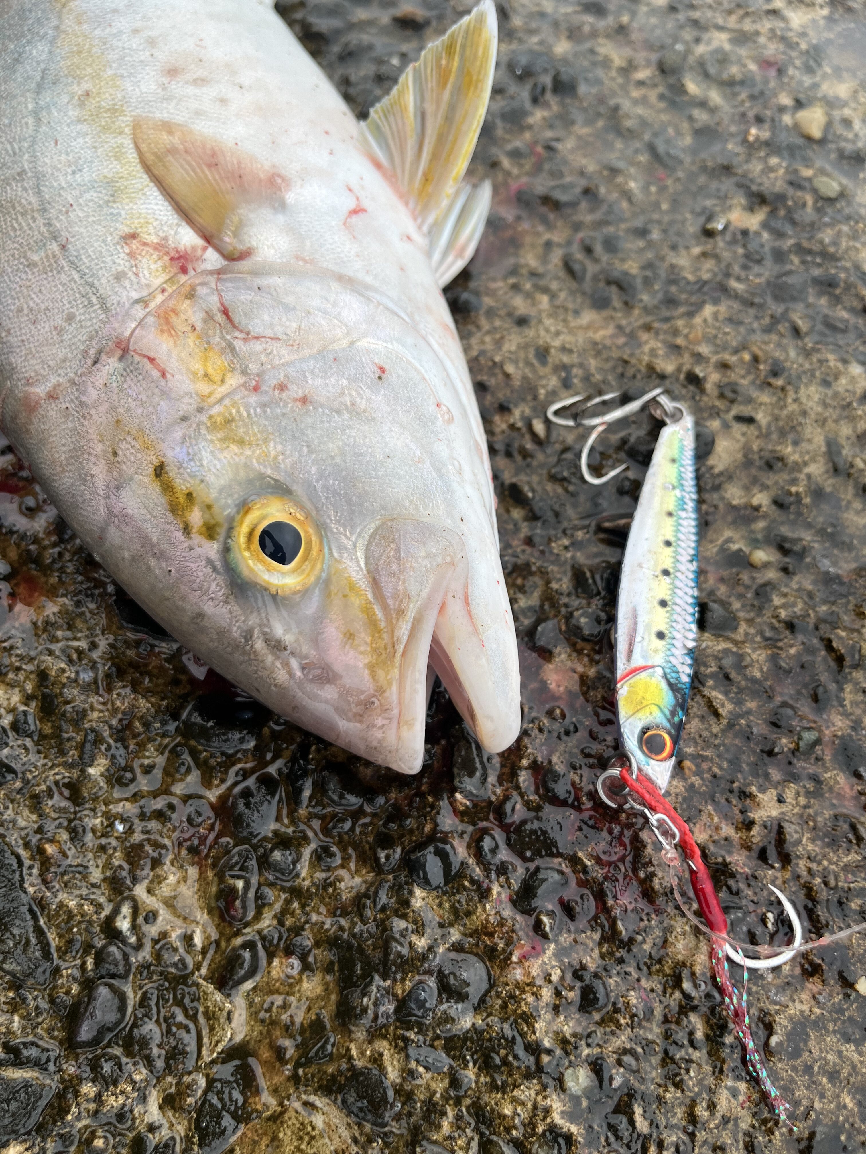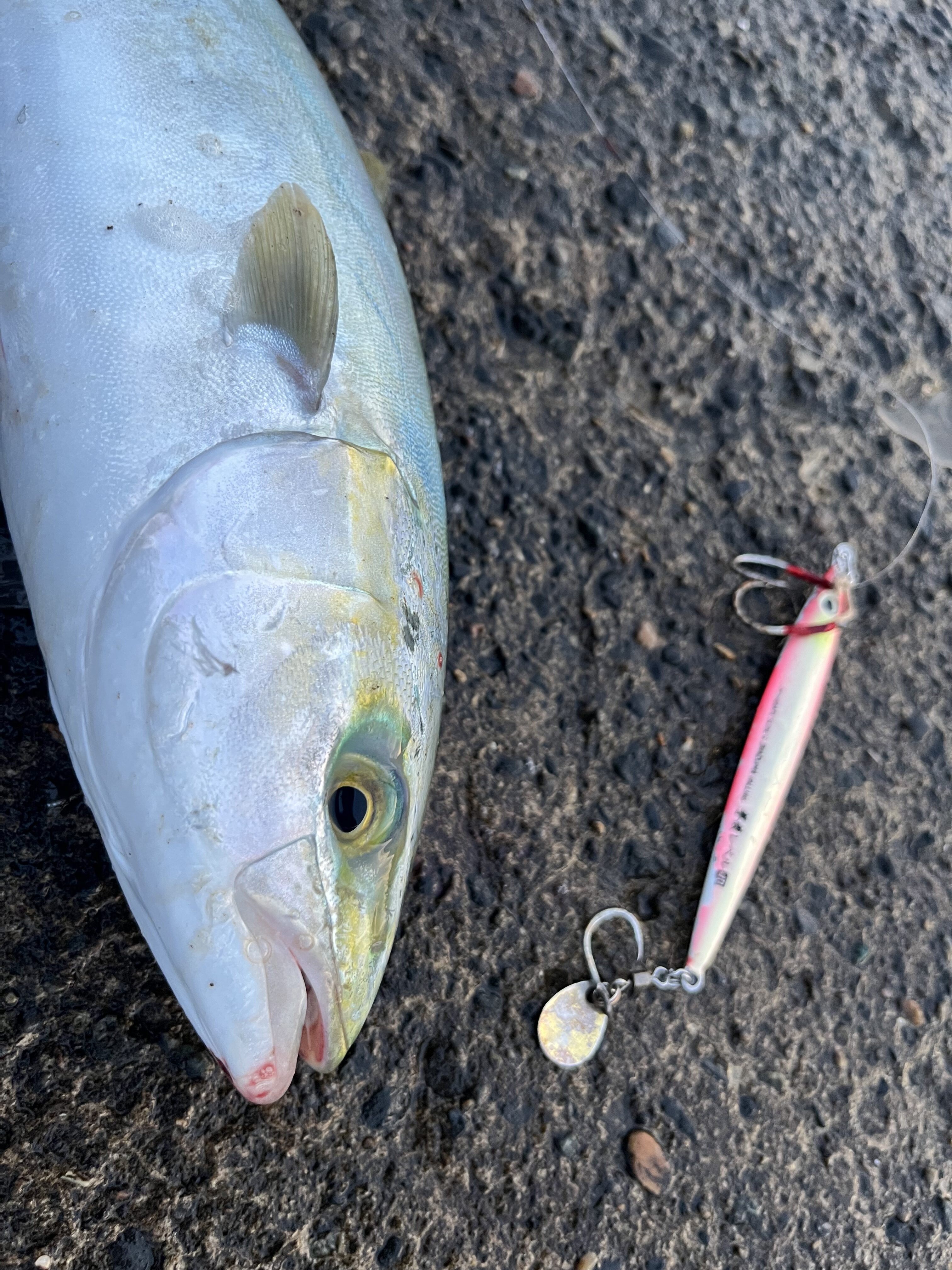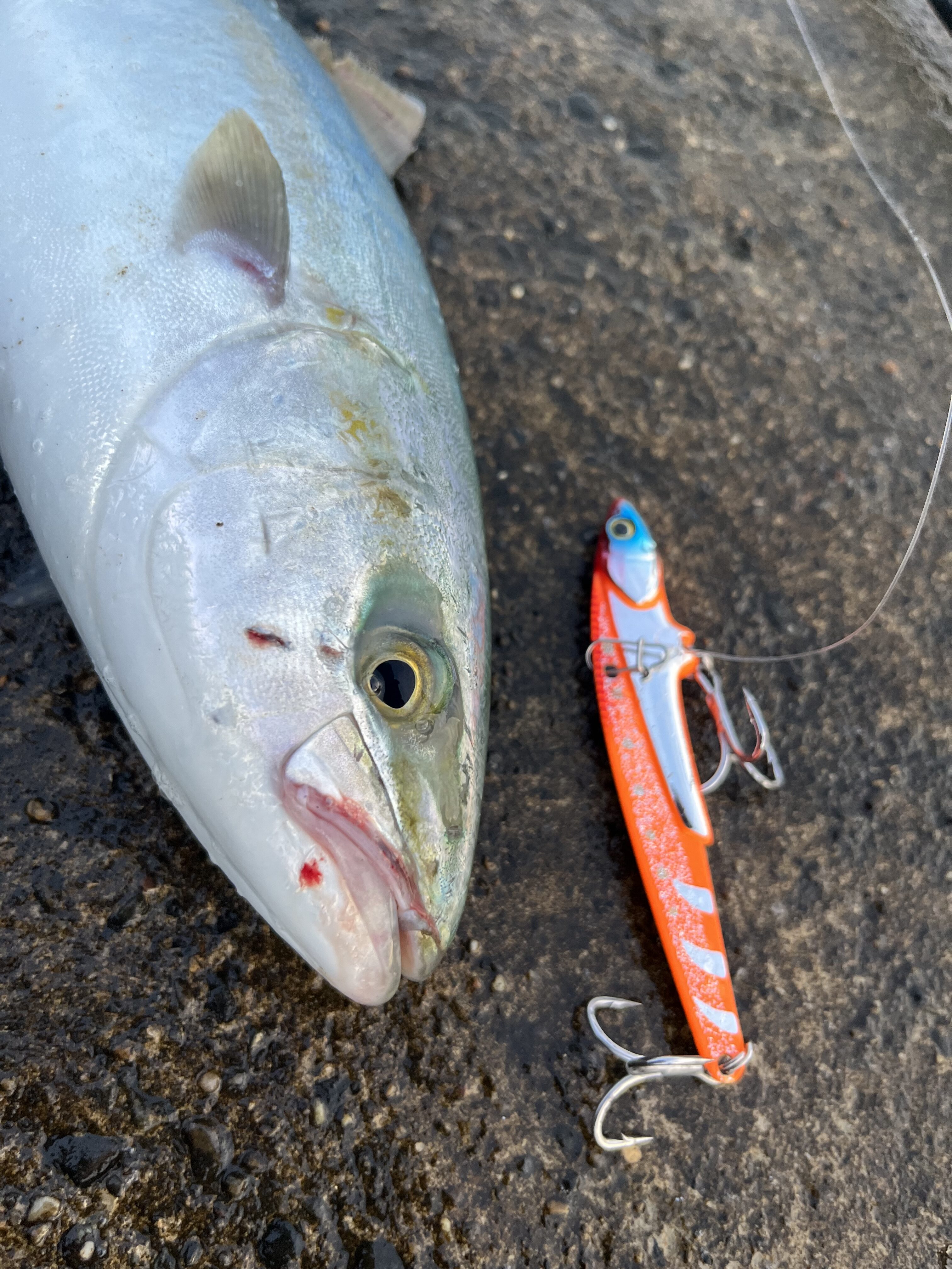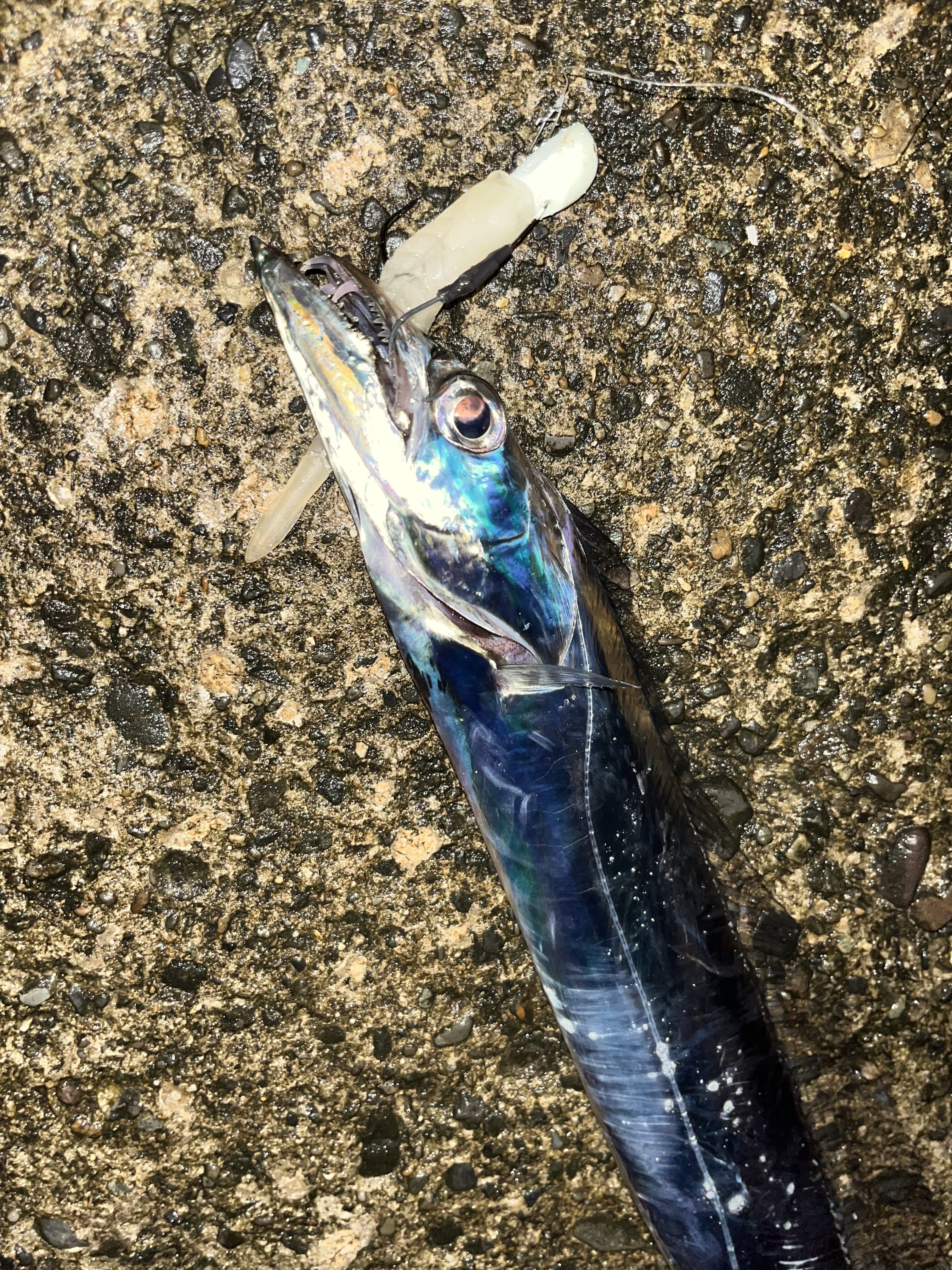 風と波で太刀魚流されてきてないかな〜とワインドしてると一投目からガツガツバイト❗️