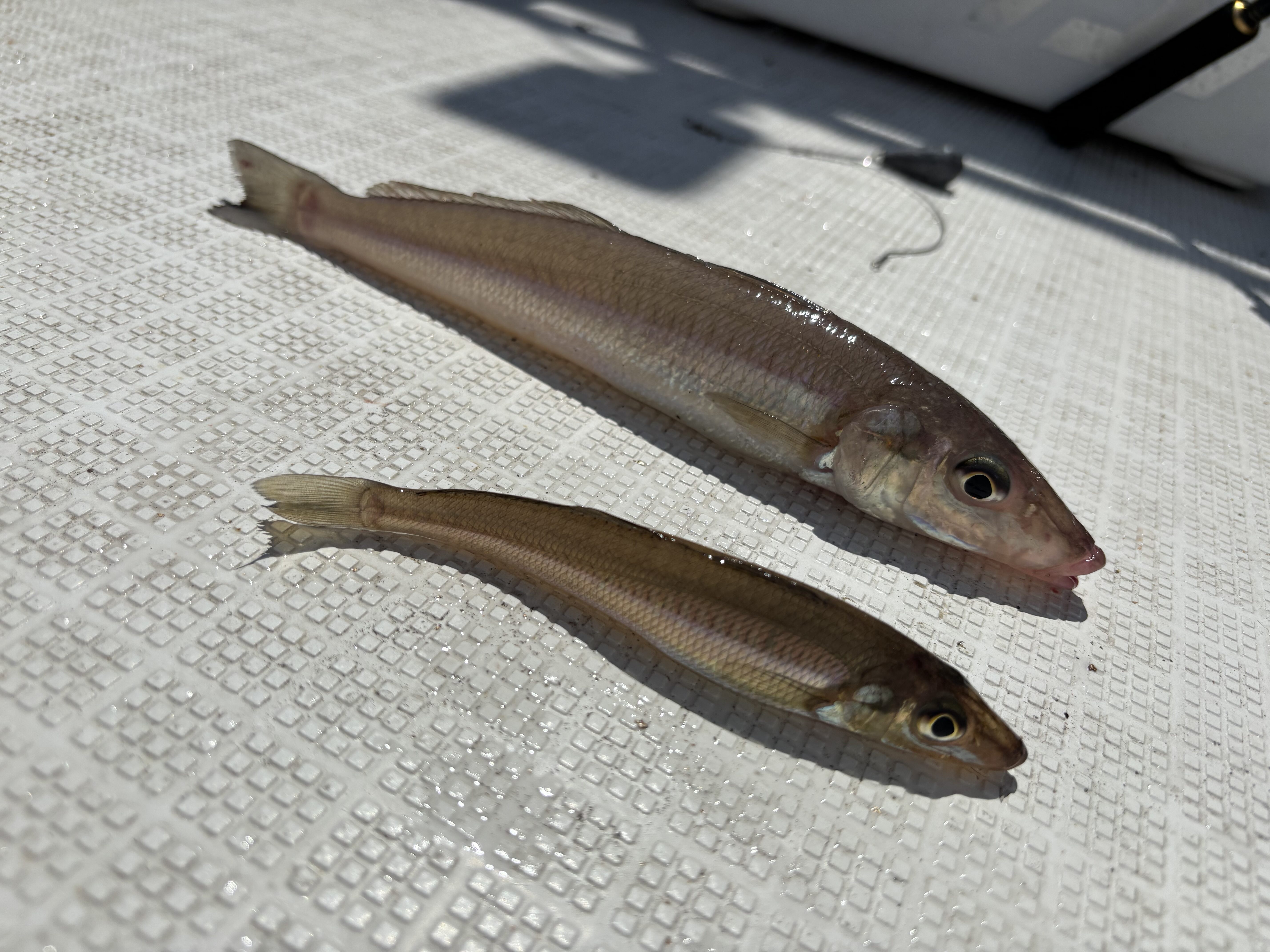 2025.08.21 印刷する 東京湾でキスを狙ってたら、アイツが釣れた… サイズ 20cm 数 タコ/1匹 キス/たくさん 釣り方 ☆ボートシーバス 船キス 天候 晴 スタッフ 板東隼也 店舗 川崎大師店 釣行日 2025.08.20 コメント 羽田のプレイフルフィッシングさんでビッグベイトシーバスとキス釣りを楽しんできました!! シーバスは1本出てくれれば良いかな…って感じであまり期待はせず。 ビッグベイトはコノフラット160Fやビッグバンディットが好調ですね! ボトムから中層までコノシロがびっしりでたまに目でも確認できるぐらいのコノシロ絨毯が広がりますが、3時間ほどやっても反応はなし!! 沈黙の中。 同船者の方が、タコエギで1.5kgほどのタコをキャッチ!! なんて自由な船!!(笑) シーバスはほどほどにキス釣りに移動! 胴付き仕掛けで餌はアオイソメ 底まで落とすと、すぐにヒット!! あんまり引かないが生命感が…… 私も胴付き仕掛けでタコをキャッチ(笑) その後も着底すぐにアタリが連発!! 船内で25cmぐらいの大型のキスも出て、一生釣れ続けるぐらいの状況でした!! 今年はキスも当たり年なので、皆さんも是非チャレンジしてみてください!! 使用した釣具 リール エアリティLT3000-H 竿 LATEO BS