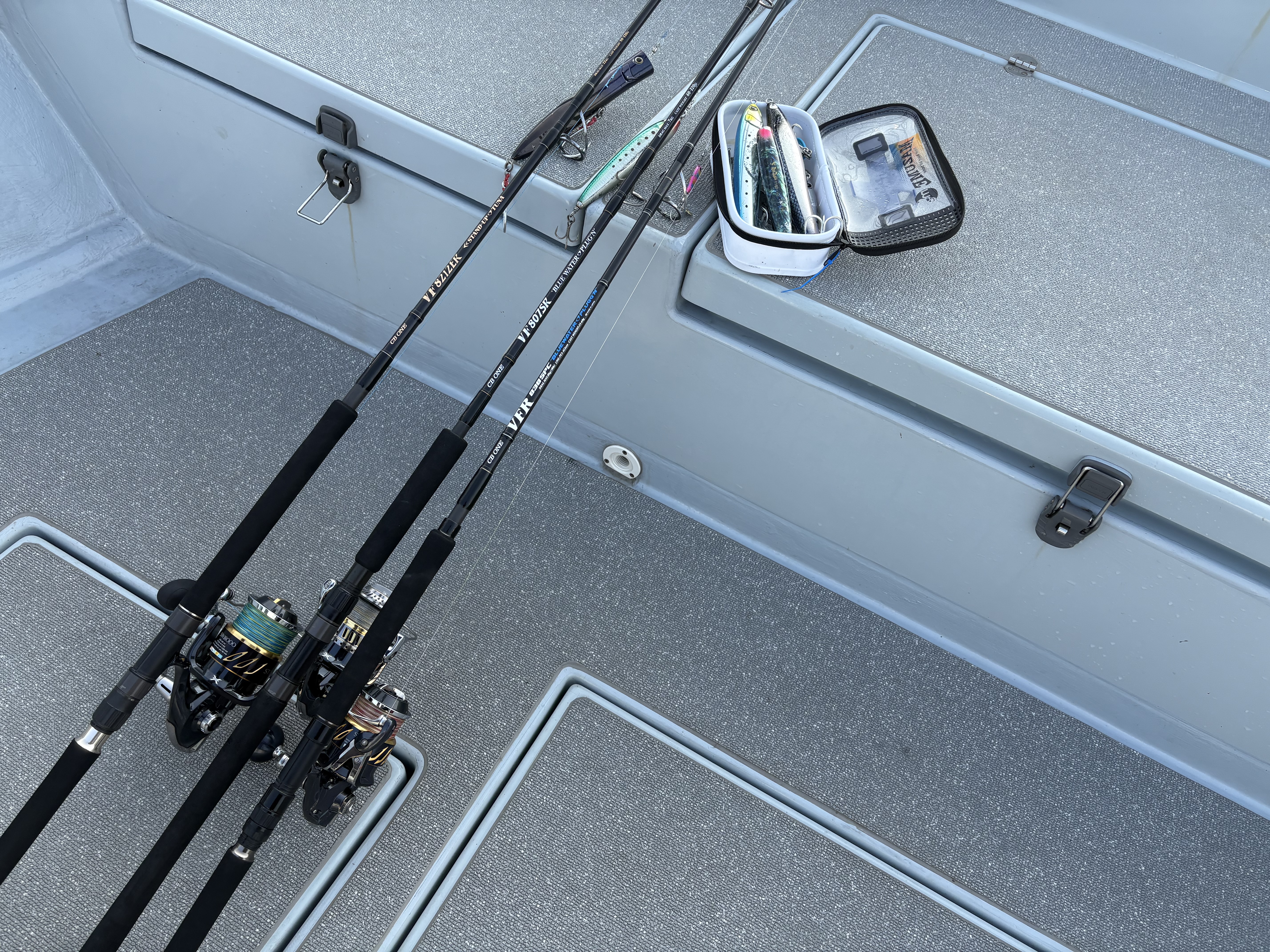 - ステラSW18000HG+PE8+ナイロン170lb.、ステラSW8000HG(ノーリミッツ16000スプール)+PE6+ナイロン130lb.、ツインパワー8000XG+PE3+ナイロン60lb.