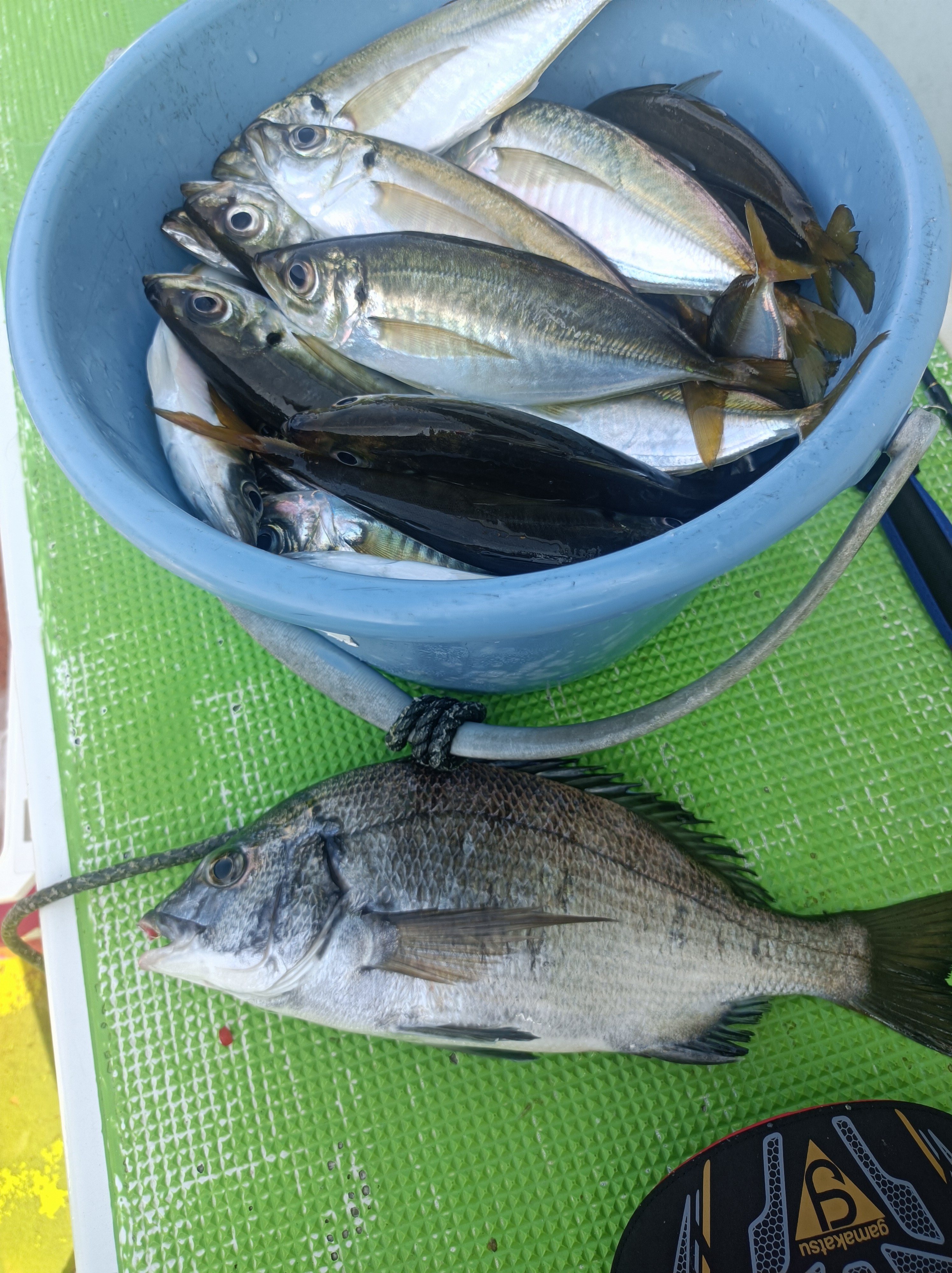 残り1時間の時には漸く心地好い風が吹き潮の動きも良い感じに♪ビシを落としてる最中にタナで食ってくるアジもおりバンバン撒くコマセが利いてます。途中、船長の計らいでキンキンのミネラル麦茶を頂きガブ飲み(笑)その後も順調に釣れお土産を確保🤗