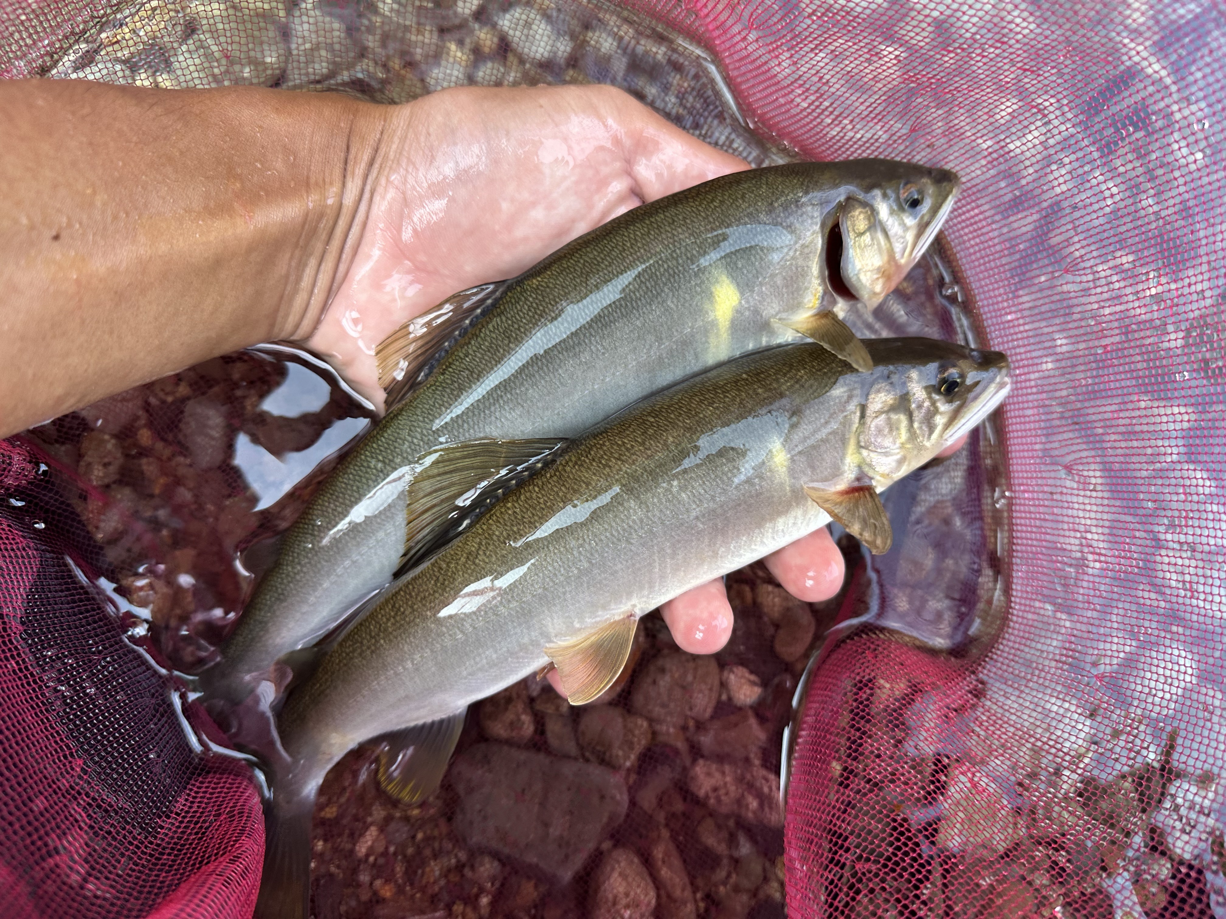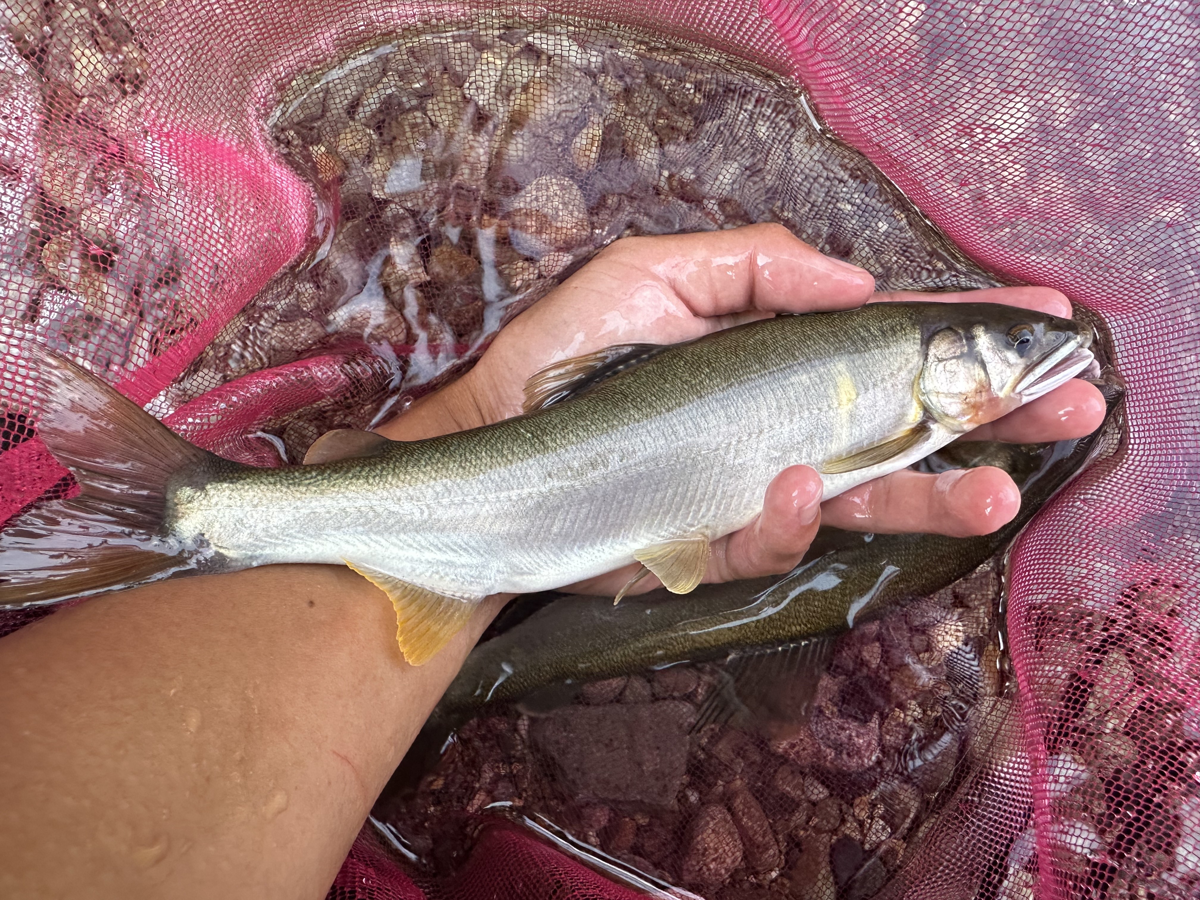 2025.08.28 印刷する 初めての馬瀬川下流 魚種 アユ/鮎 サイズ 最大25cm 釣り方 友釣り 場所 岐阜県 天候 晴れ スタッフ 山上知哉 店舗 大津店 釣行日 2025.08.22 コメント こんにちは!ブンブン大津店の山上です。 8月22日、岐阜店の青山店長とスタッフ畑尻と岐阜県の馬瀬川下流へ友釣りに行ってきました。 今年は岐阜県の川に挑戦していますが、馬瀬川は初めて。前日の愛知川での練習が生きてくるのか試してきました。 場所は全て青山店長に任せてついていきます。 午前中は2箇所周りますが、全く掛からず。オトリを生かしておくので精一杯です。 昼からは水のクリアなところを探して、ガラッとポイントを変えます。 もうオトリの元気がないので、トロ場を竿を立てて泳がせていきます。なんとか上の方へ泳いでいってくれると、奇跡的に目印が!22cmほどの良型! やっと手に入れた天然オトリでキツイ瀬をやっていきます。瀬の中よりも瀬落ちが好調で、そこでなんとか5匹掛けることができました。最大25cmの岐阜クオリティでした! 初めての馬瀬川下流は大苦戦でしたが、今年の目標でもあった25cm以上の鮎を釣ることを達成できたので満足いくものとなりました。 ただ、転けて竿を折りましたので、皆様もお気を付けくださいませ。 使用した釣具 竿 銀影エアショートリミテッドMT87M 水中糸 アーマード0.2号 針 一角3本錨8.0号
