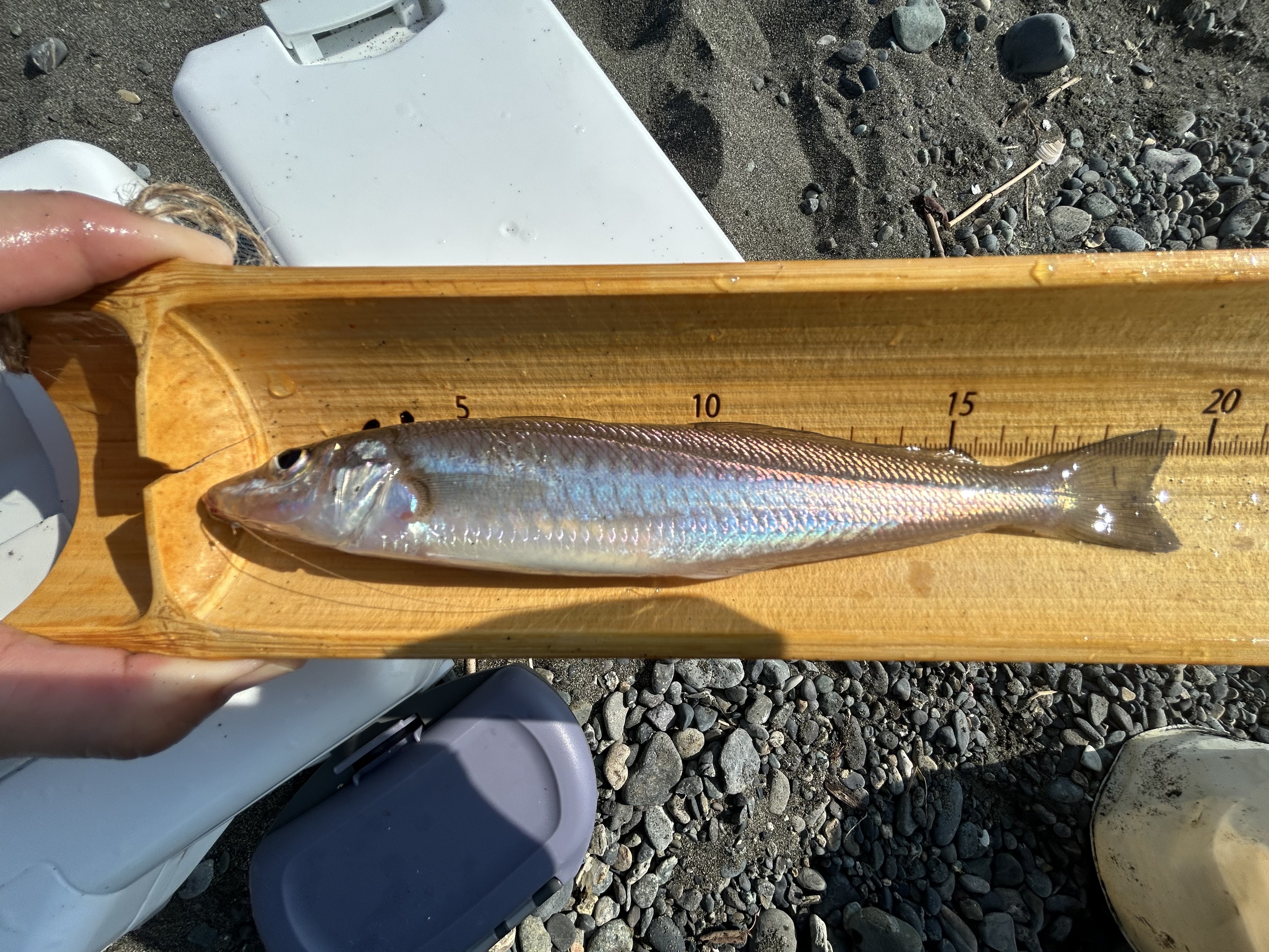 『いるじゃーん🤣』と確信した所で、ジャリメを丸々1匹でつけます。しばらくすると私にもヒット…20cmもある立派なキスがサーフで釣れて感動🥹