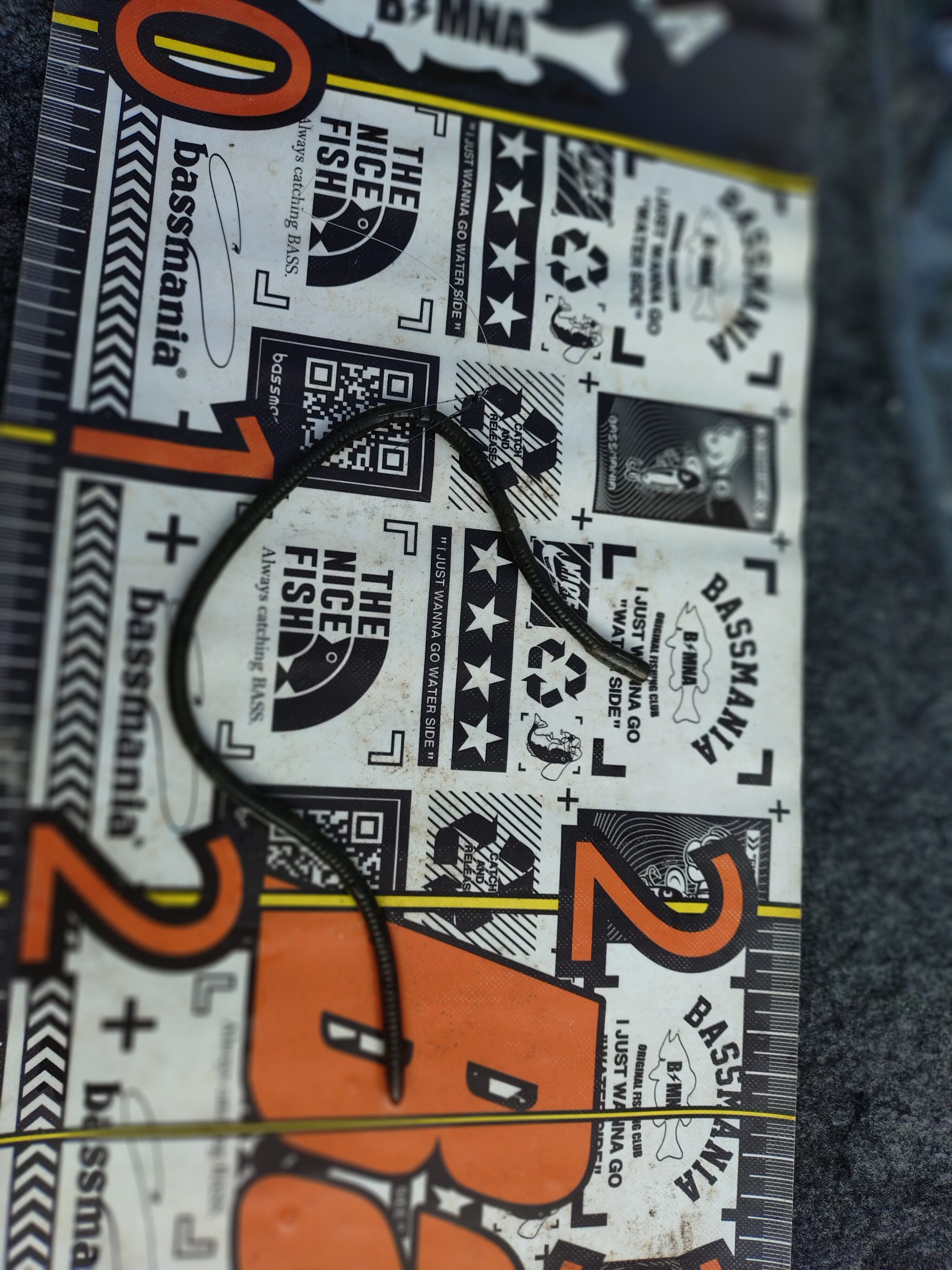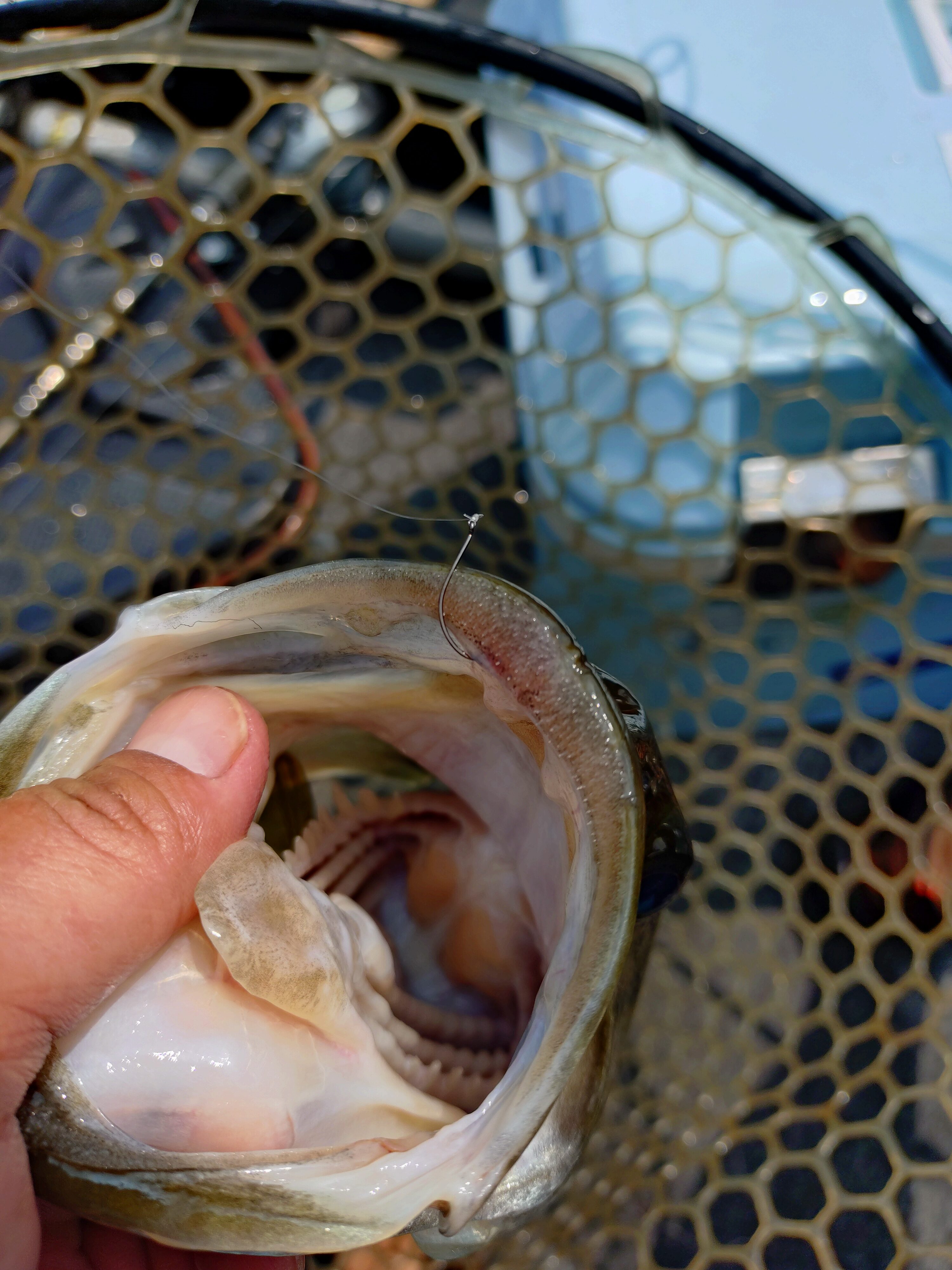 お昼前に本流小口橋下流エリアの小規模ワンドエリアにて、私がヴィローラ2.8インチ0.3gネイルシンカーマスバリセッティングで41cm