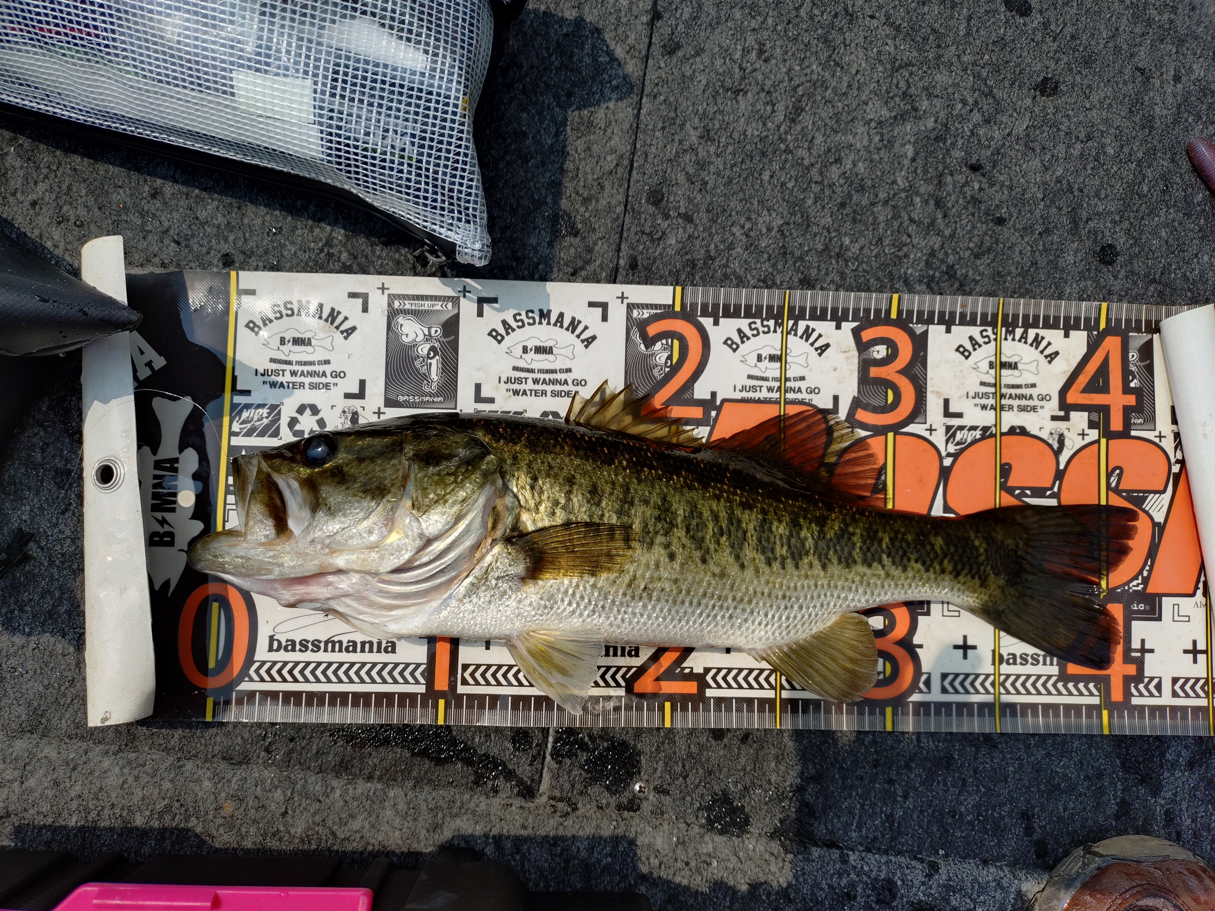 釣行当日の状況は、朝一に本流の小口橋の上流側の岩盤エリアで、Kさんが7:40分にアジャストレート12インチネコリグで49cm